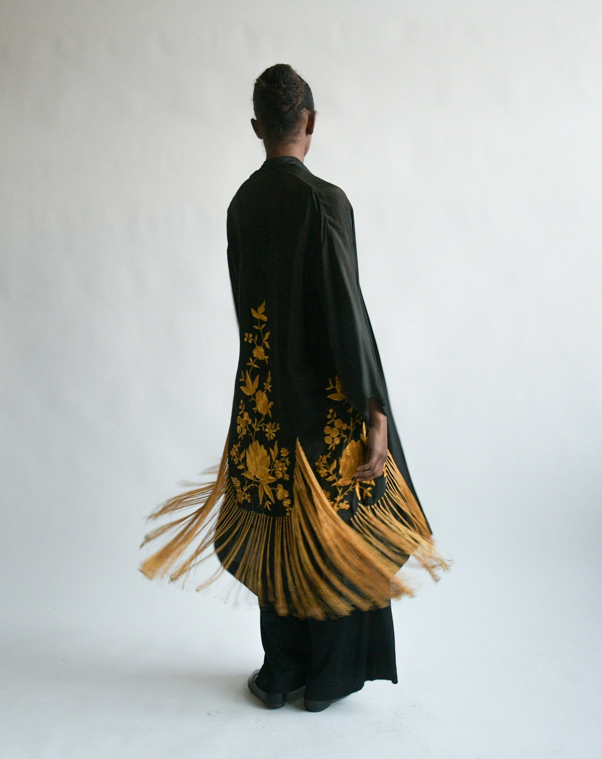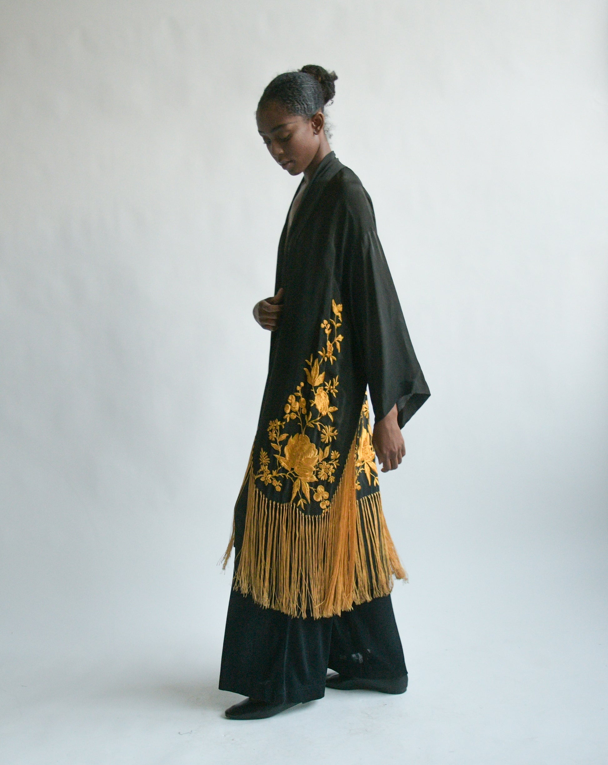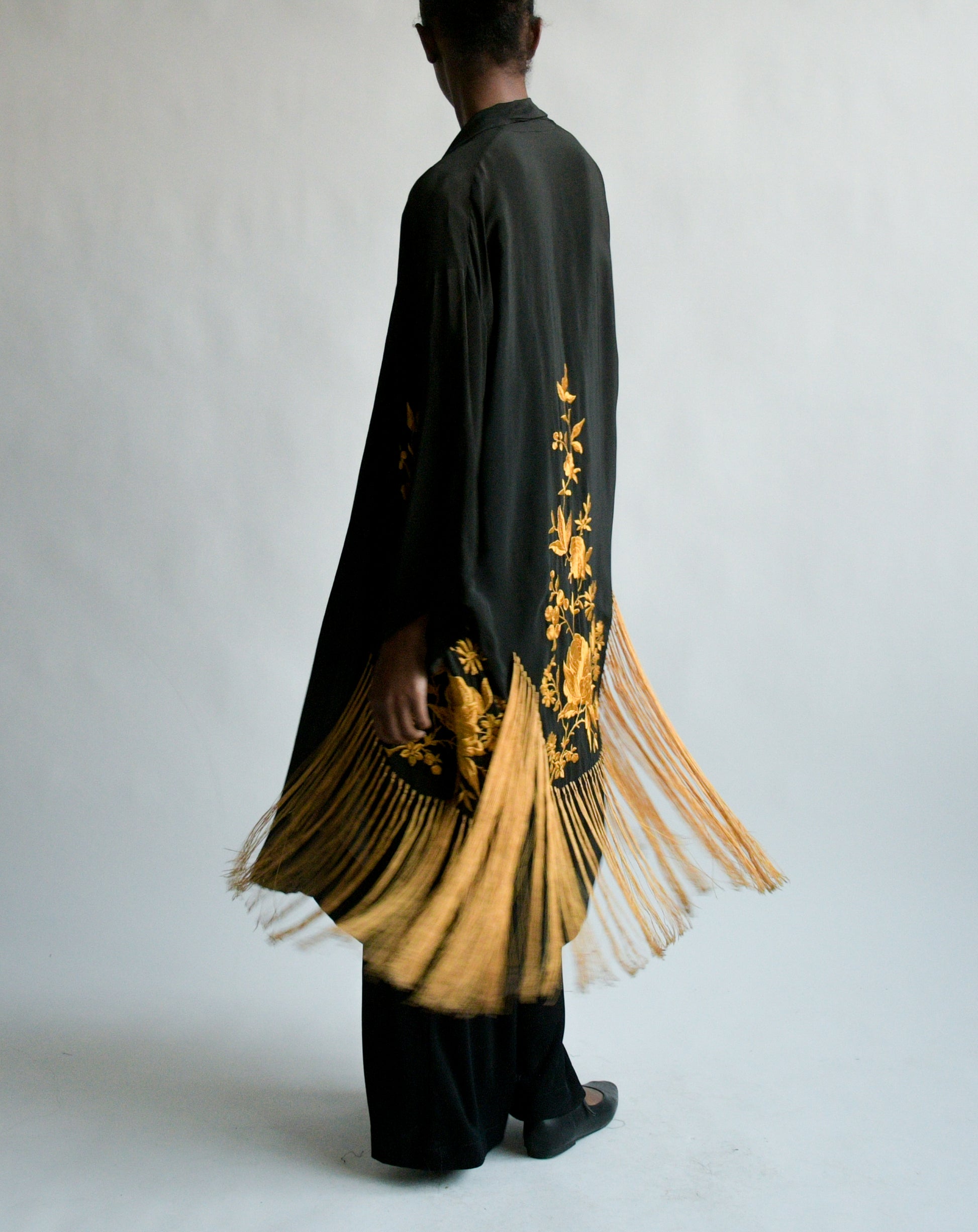 available is an antique 1920s black hand embroidered floral fringe kimono. elaborate yellow floral embroidery that stands out against the black kimono with fringe placed beautifully along a rounded curve, that looks amazing when walking / in motion. this garment is unlined and has no closures and is a light synthetic fabric.