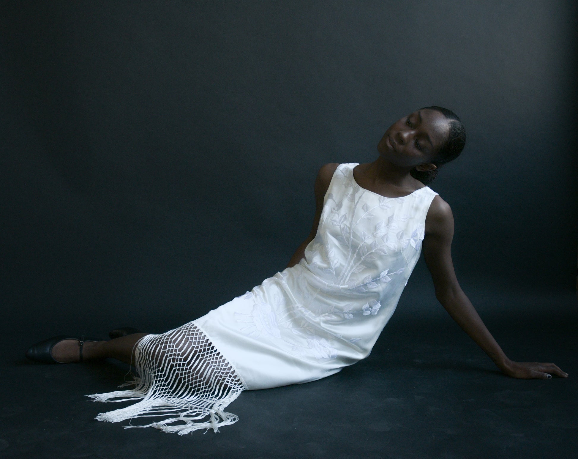 available is an antique 1920s white floral hand embroidered satin fringe dress. the fringe hem is great in movement and the embroidery and fringe make the dress dress an interesting and versatile layering piece - shown under a contrast red dries van noten jacket here. pullover with no closures.