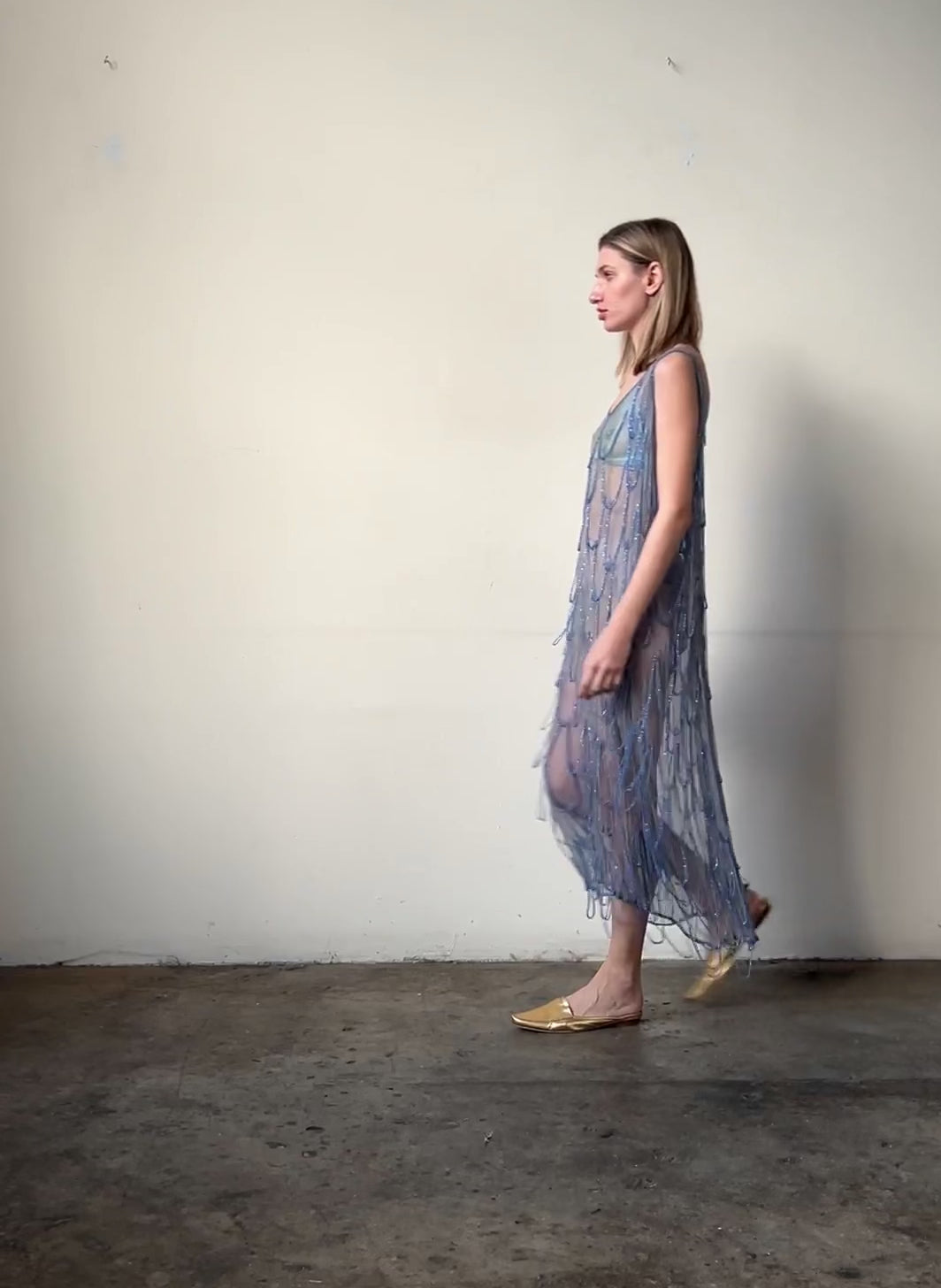 available is a magical 1920s art deco periwinkle sheer glass bead dress. this dress features art deco-style stitching, a low open back and hanging glass beads that almost look like scales and gives the dress a mermaid vibe and swings beautifully as you walk and move. the glass bead work was done by hand and one can see the amount of labour that went into it. the simple shape of the dress balances the busier glass bead design but the way it slinks on the body makes the piece super chic. the fabric feels like a silk blend (it feels strengthened by whatever it was blended with-- silks from this age tend to feel more fragile and it feels too soft to be completely synthetic) and holds all the beads up very well.