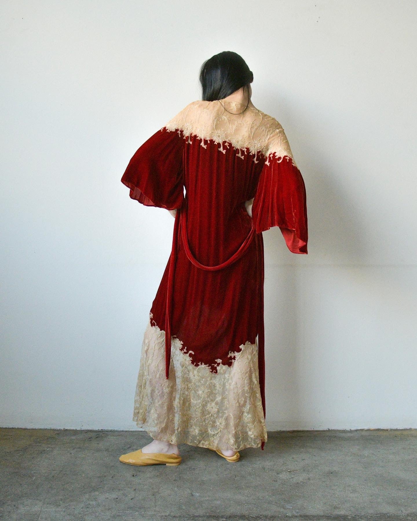 1930s crimson devore gown with intricate tambour lace detailing at shoulders and bottom of skirt. easy fit with matching belt. button closures at shoulder with snap button at waist.