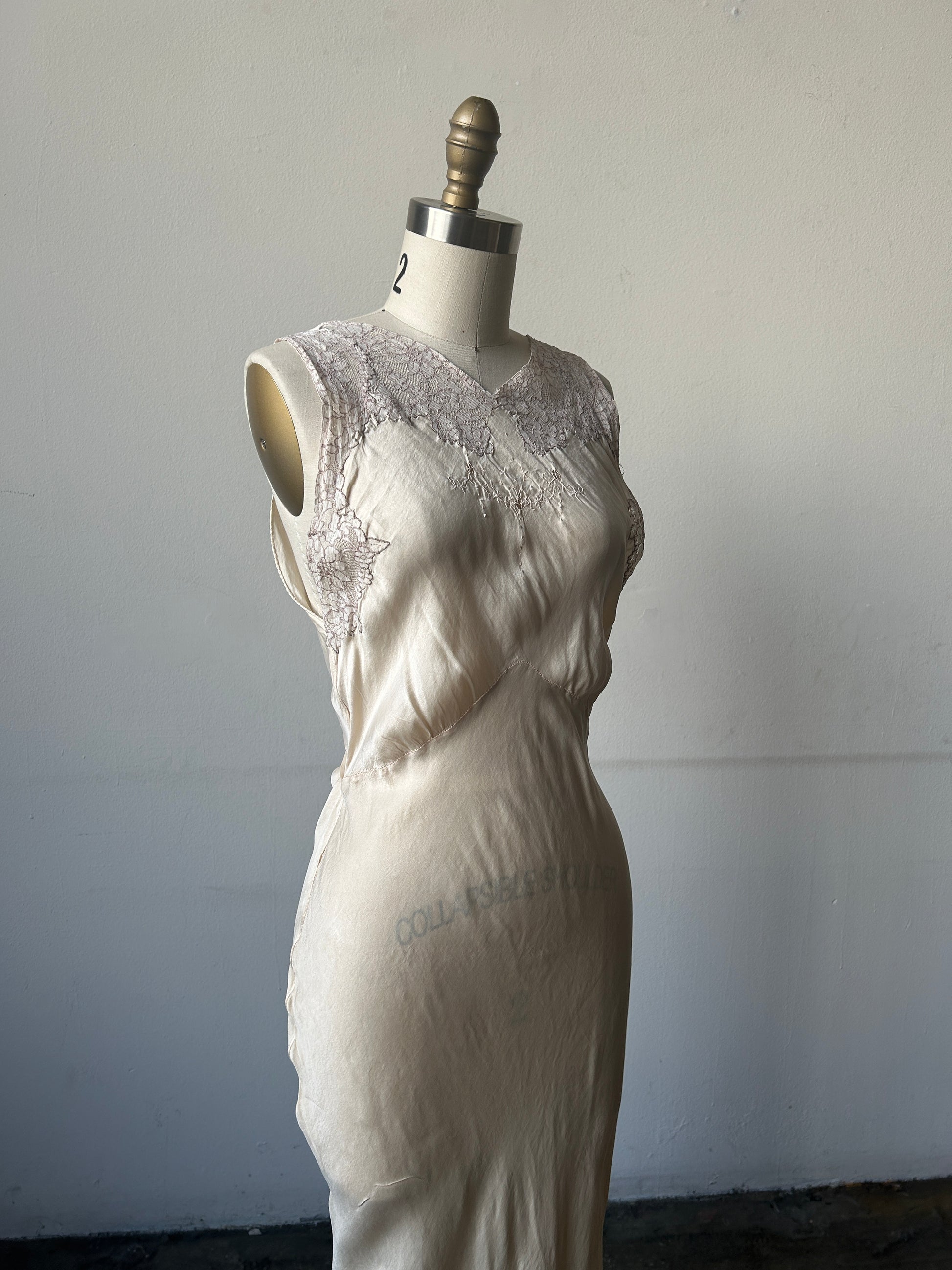 1930s silk and lace bias cut dress. silk charmeuse with delicate lace details on bodice. the best part of this dress is the fit at the bodice, a subtle drape you can see in the videos as you turn or move, a detail that adds a subtle delicacy to the dress. bias cut with empire waist. tie back sash.