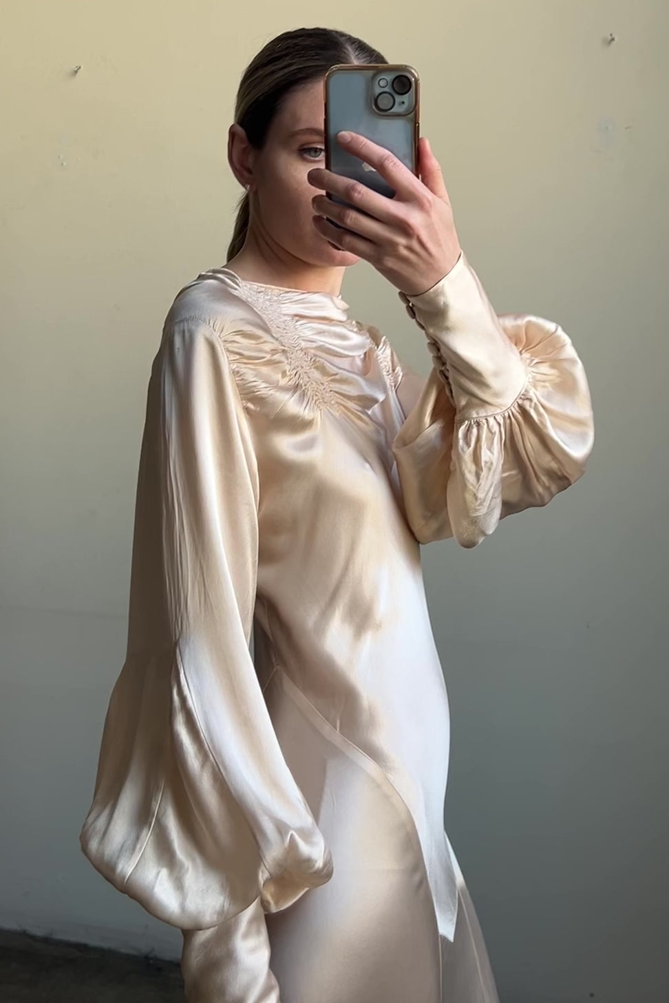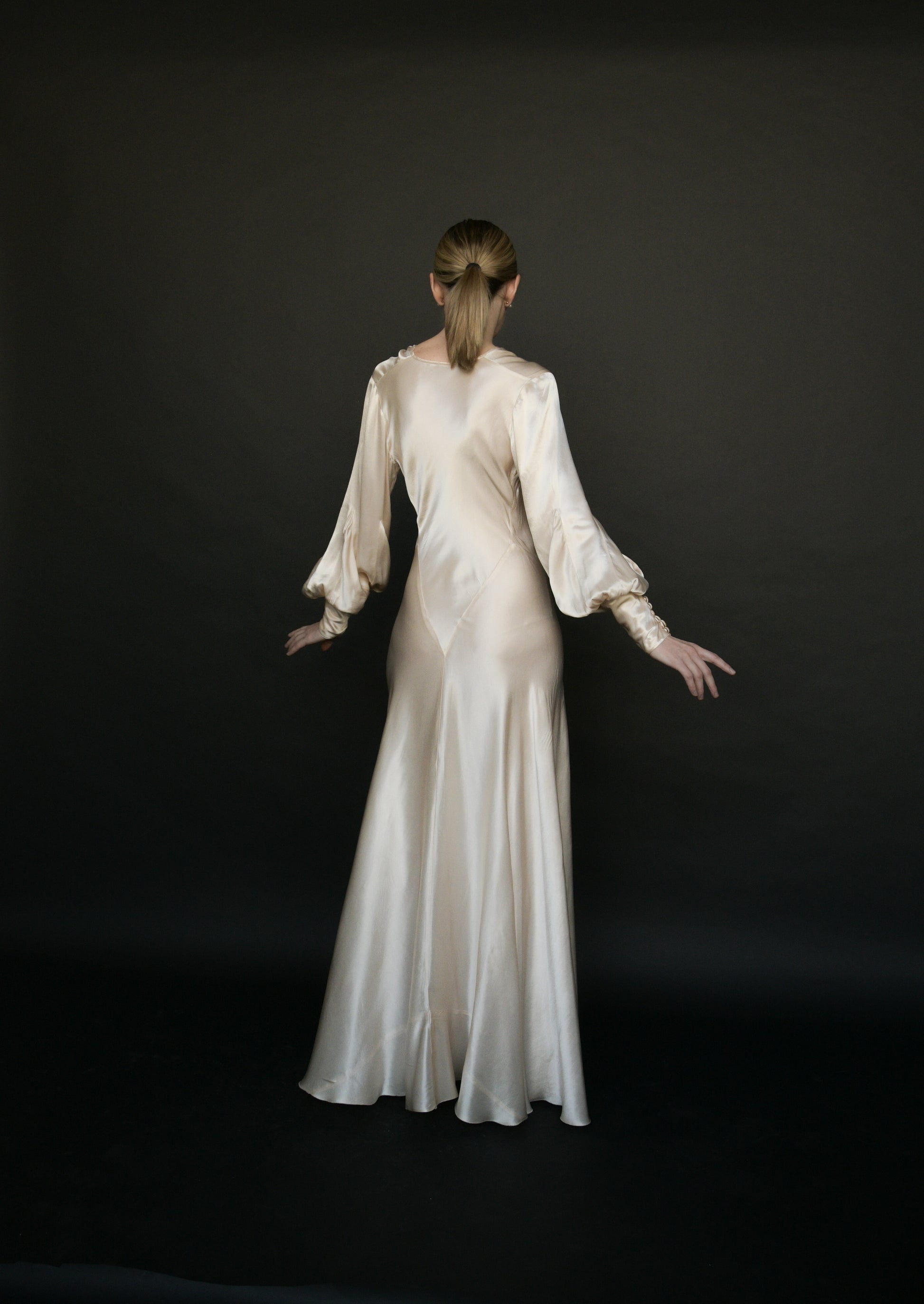1930s silk liquid satin bias cut dress. this dress features a beautiful bias cut bodice that falls beautifully on the body, stunning sleeves that are fuller at the cuff with art-deco style inserts / seams, ruching detail at the top of the bodice. the color is a light champagne. the dress slips on for wear with no closures. a chic wedding option.