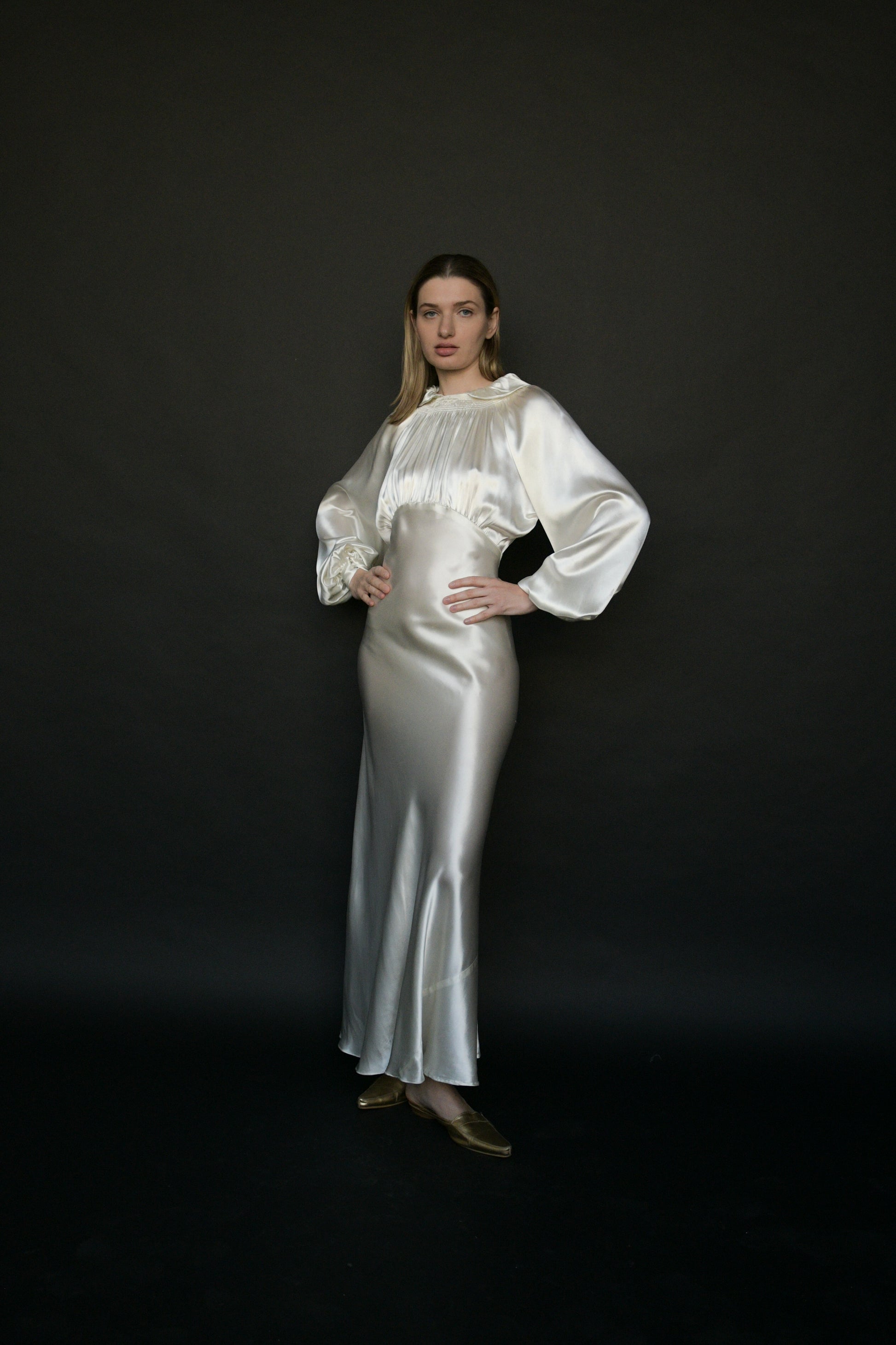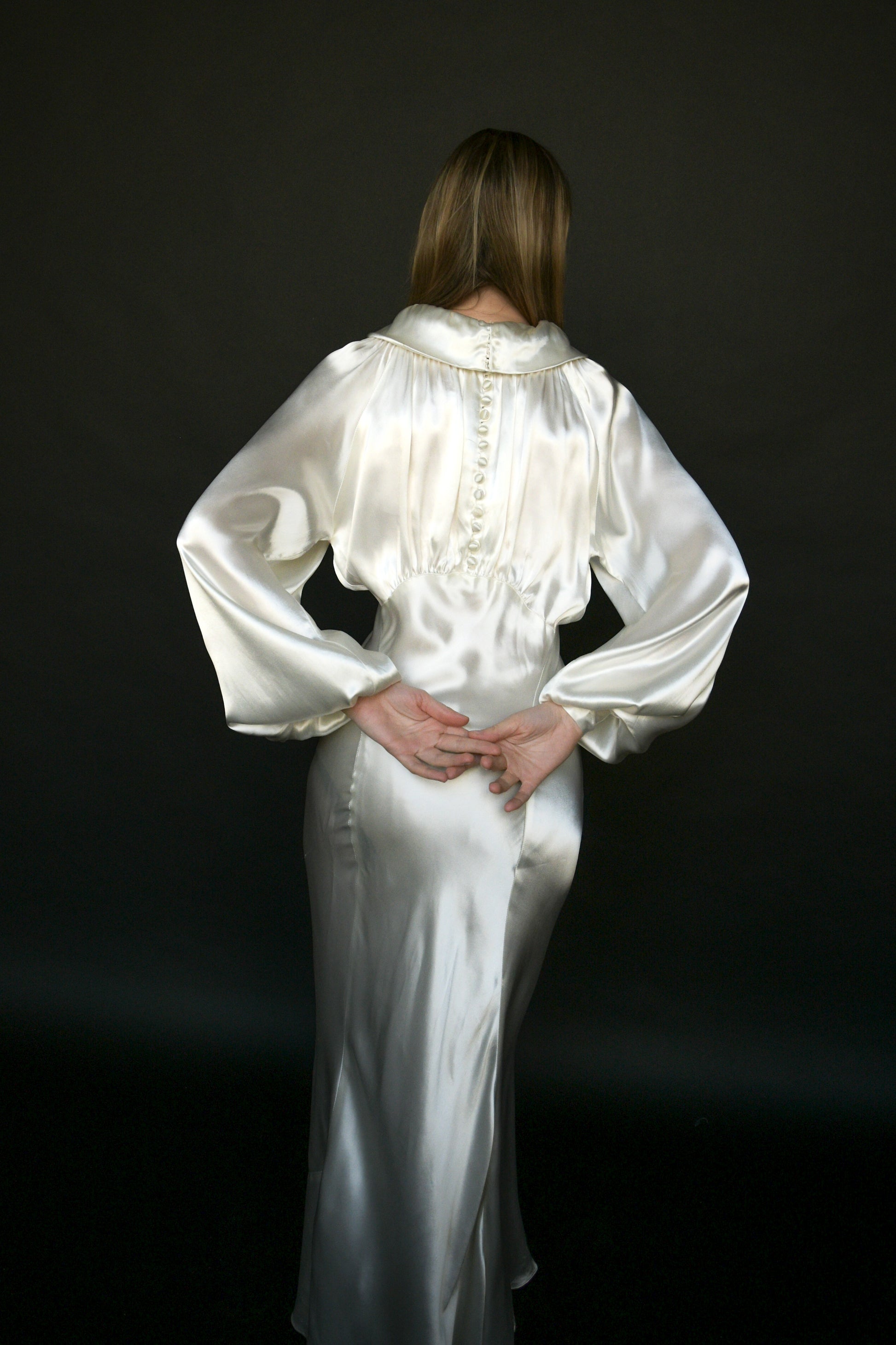 1930s white liquid satin bias cut dress with beautiful ruched bodice and extra full sleeves. the ruching also continues in the back of the bodice, with multi satin-covered button closures. a chic wedding option.