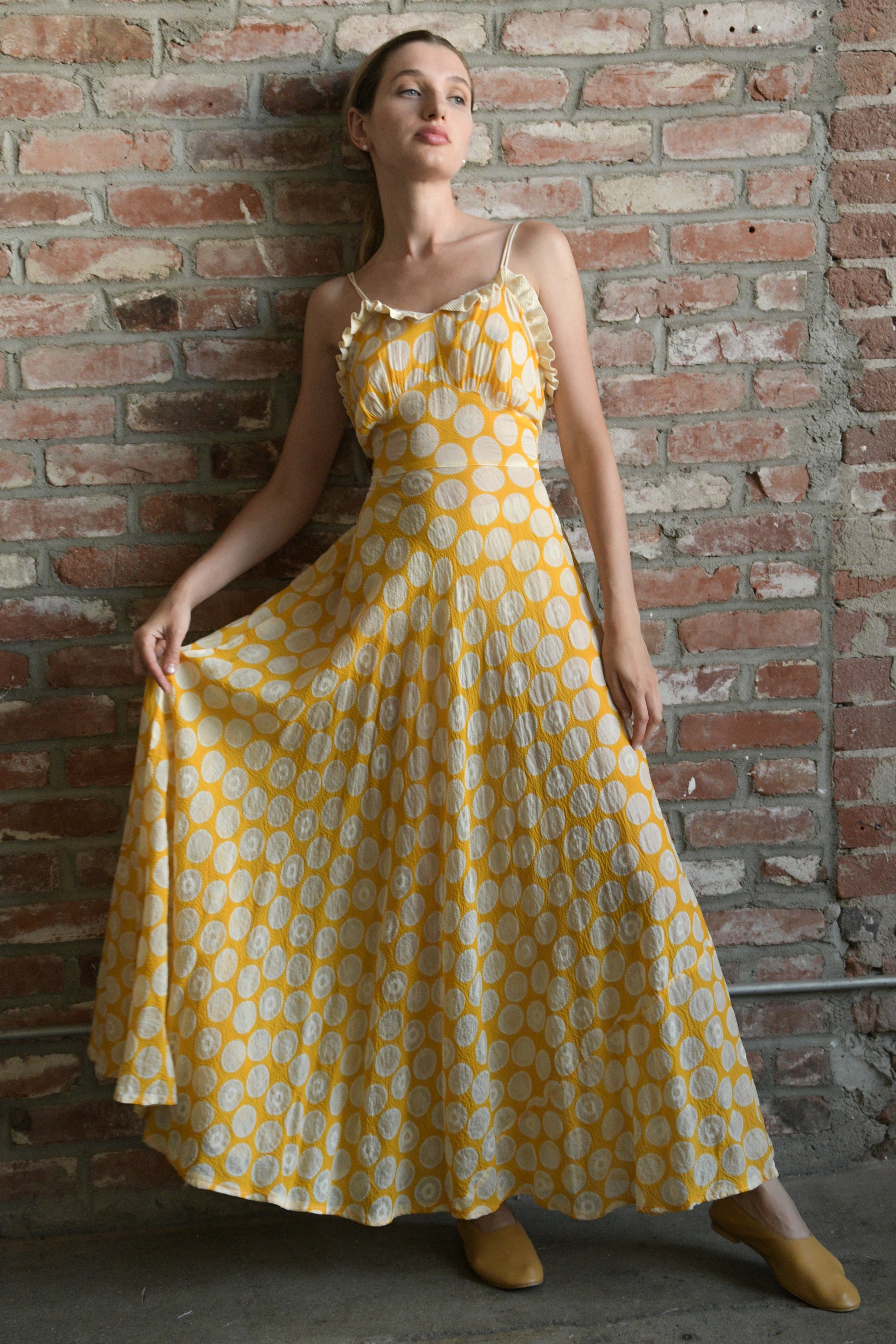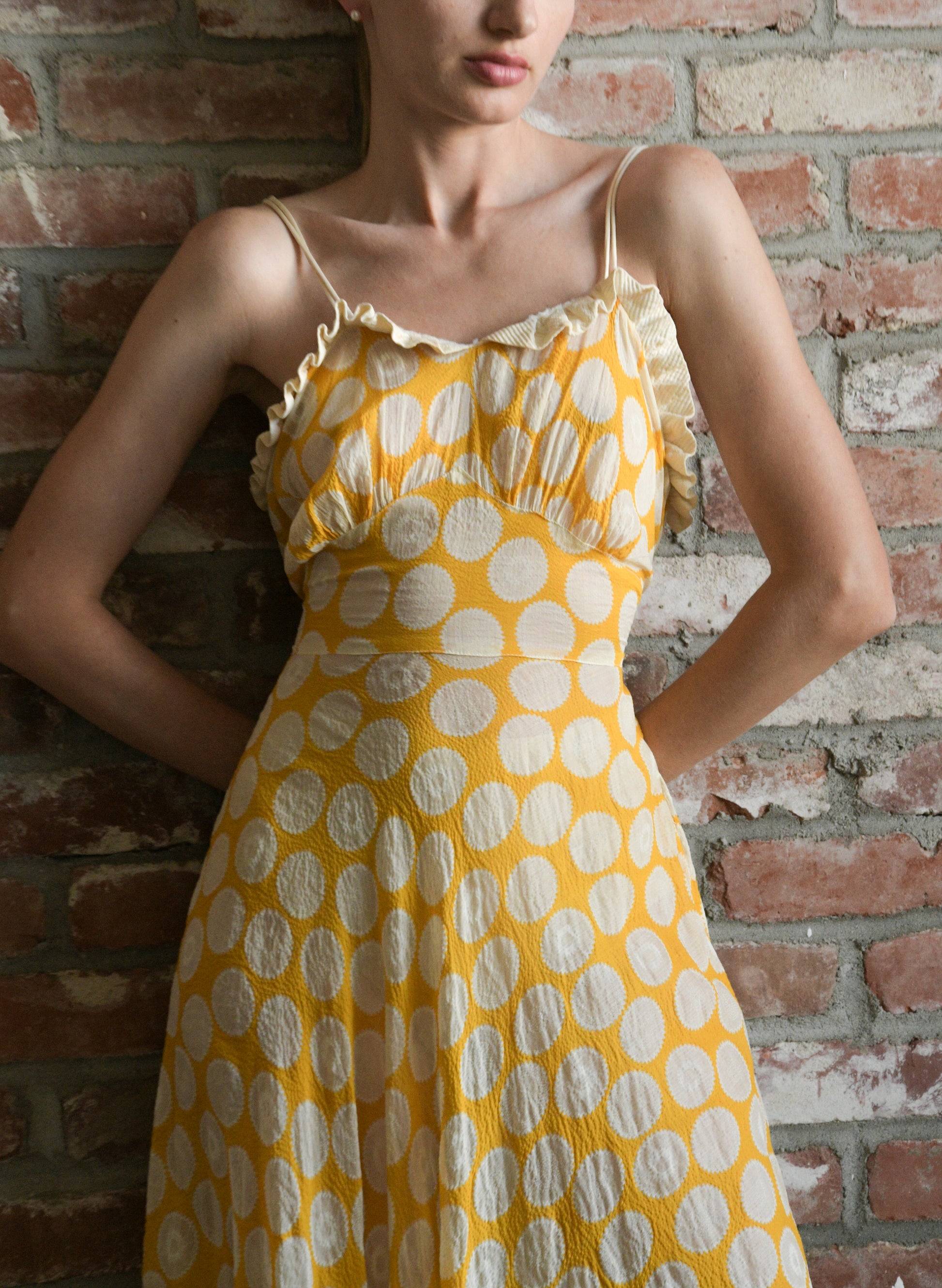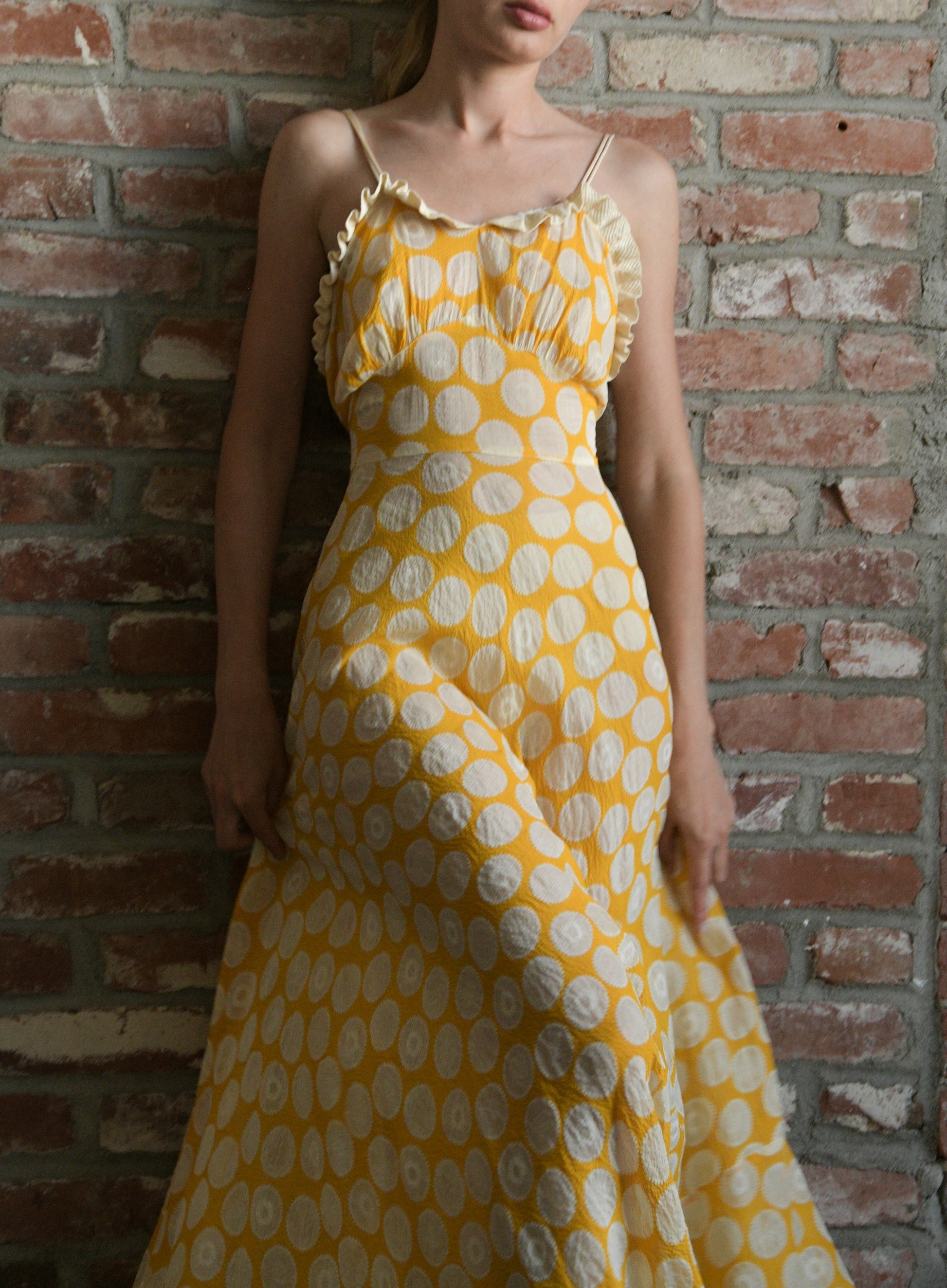 1930s yellow polka dot dress. the beautiful woven cotton slightly sheer and puckered polka dot print fabric really makes this dress. the fabric feels like something between a cotton gauze and an organdy. ruffled trim, empire waist. side multi buttons and hook closures.