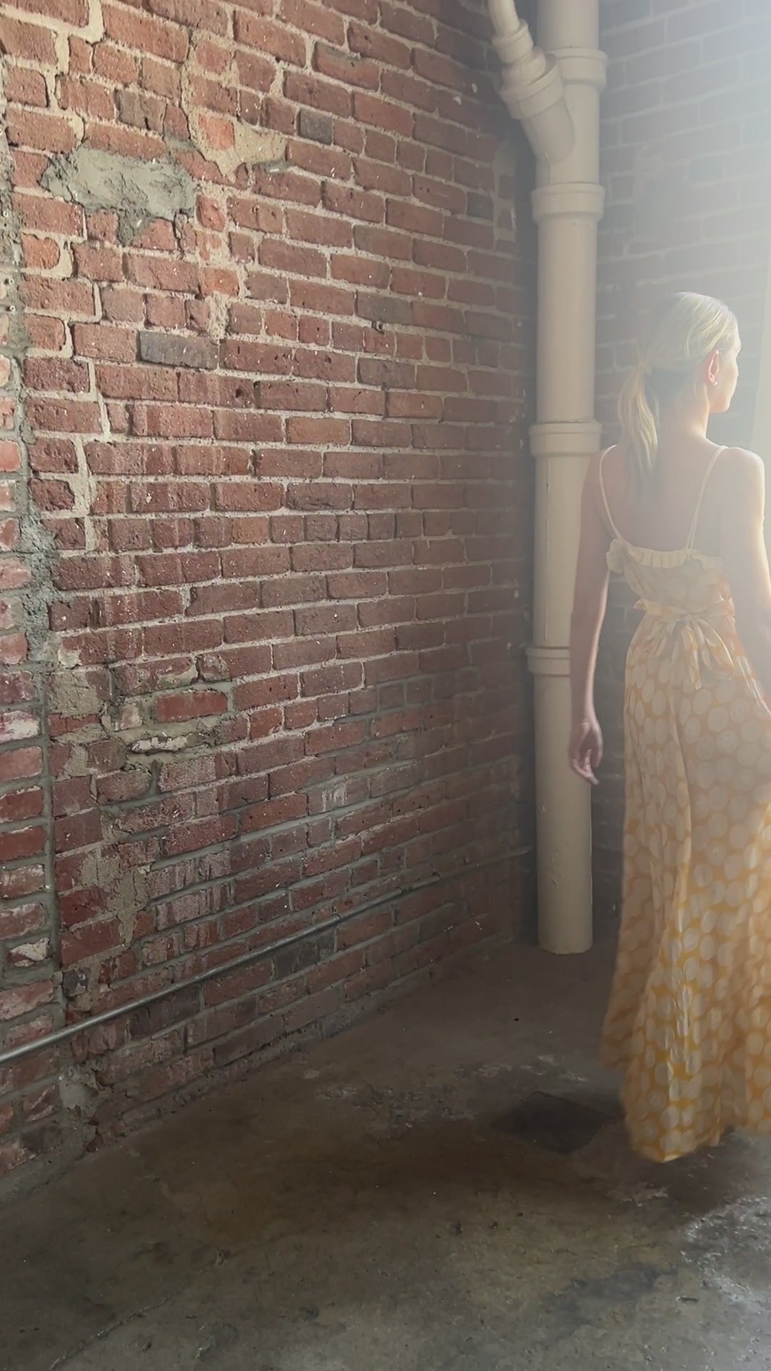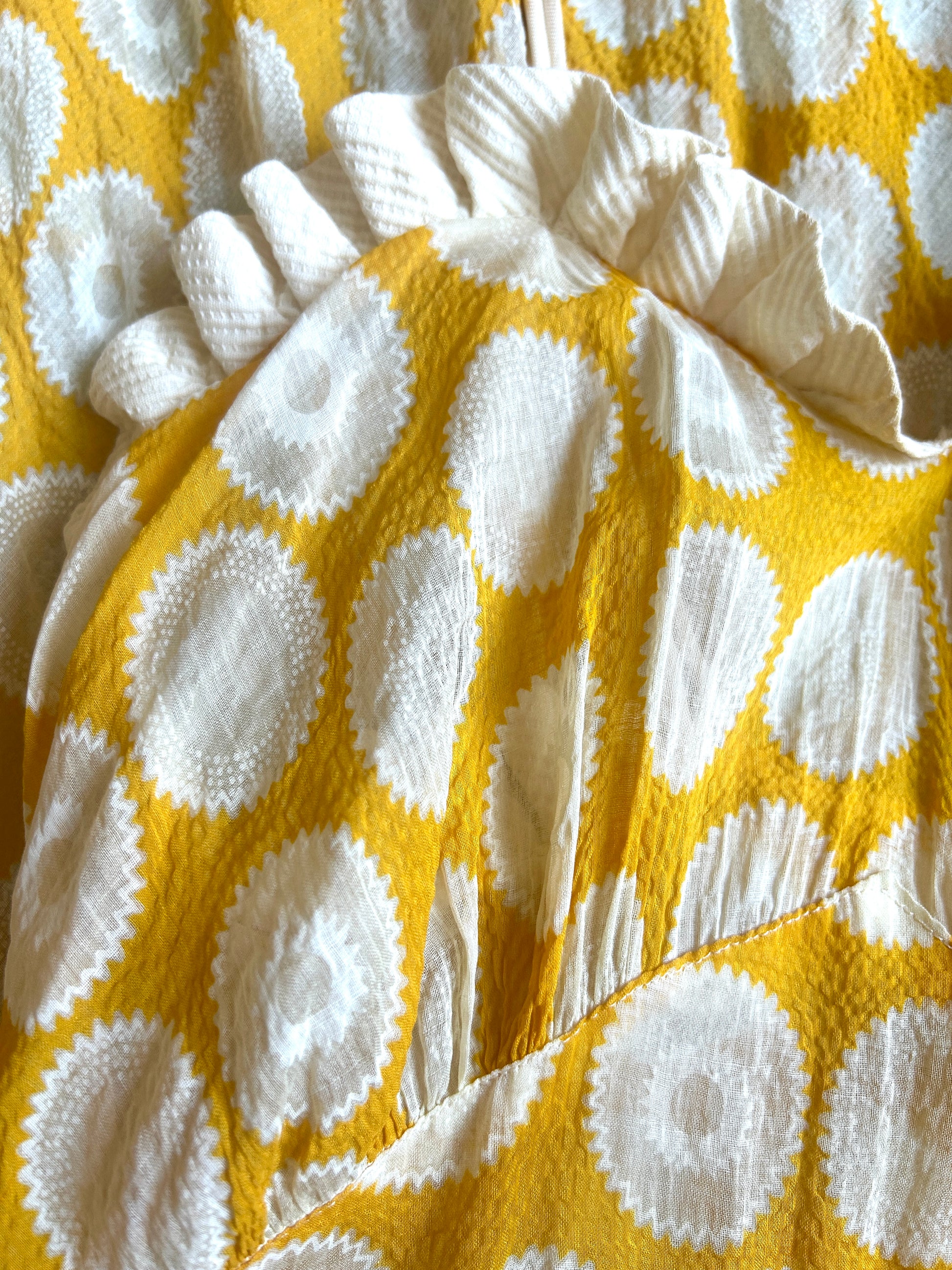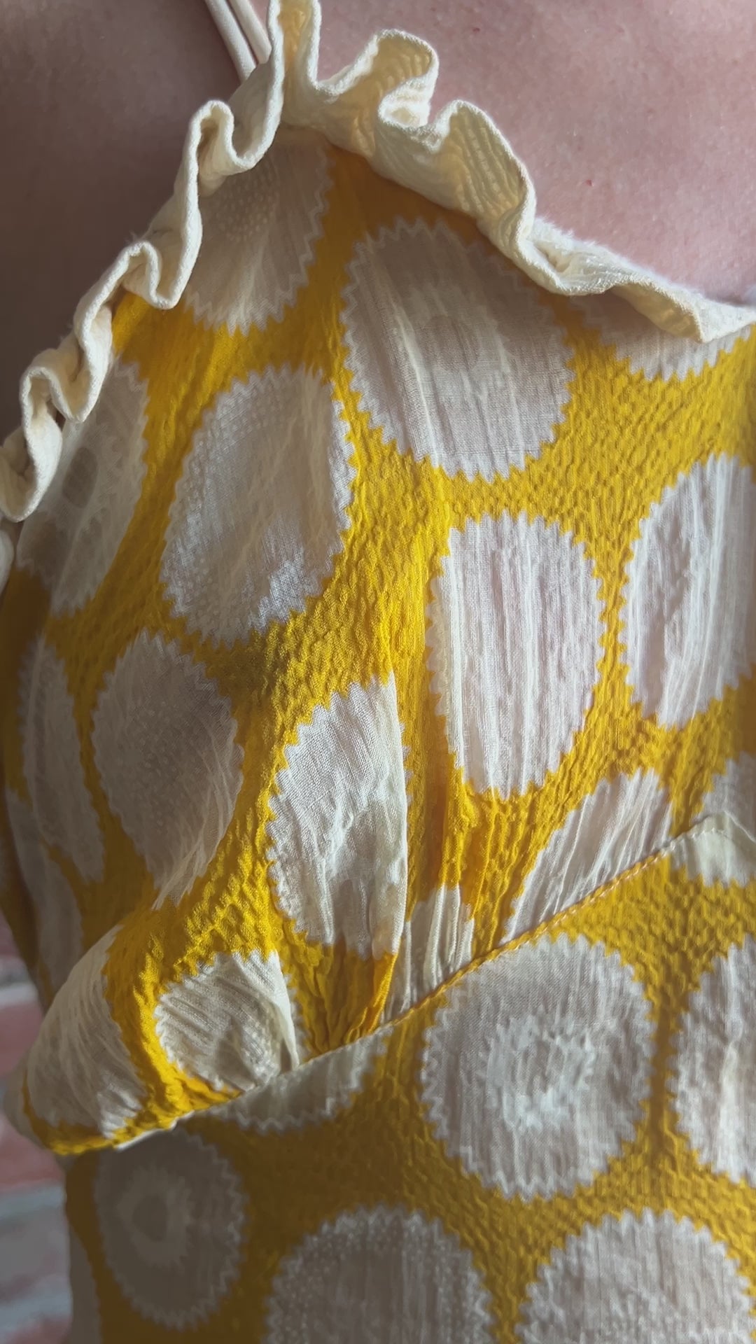1930s yellow polka dot dress. the beautiful woven cotton slightly sheer and puckered polka dot print fabric really makes this dress. the fabric feels like something between a cotton gauze and an organdy. ruffled trim, empire waist. side multi buttons and hook closures.