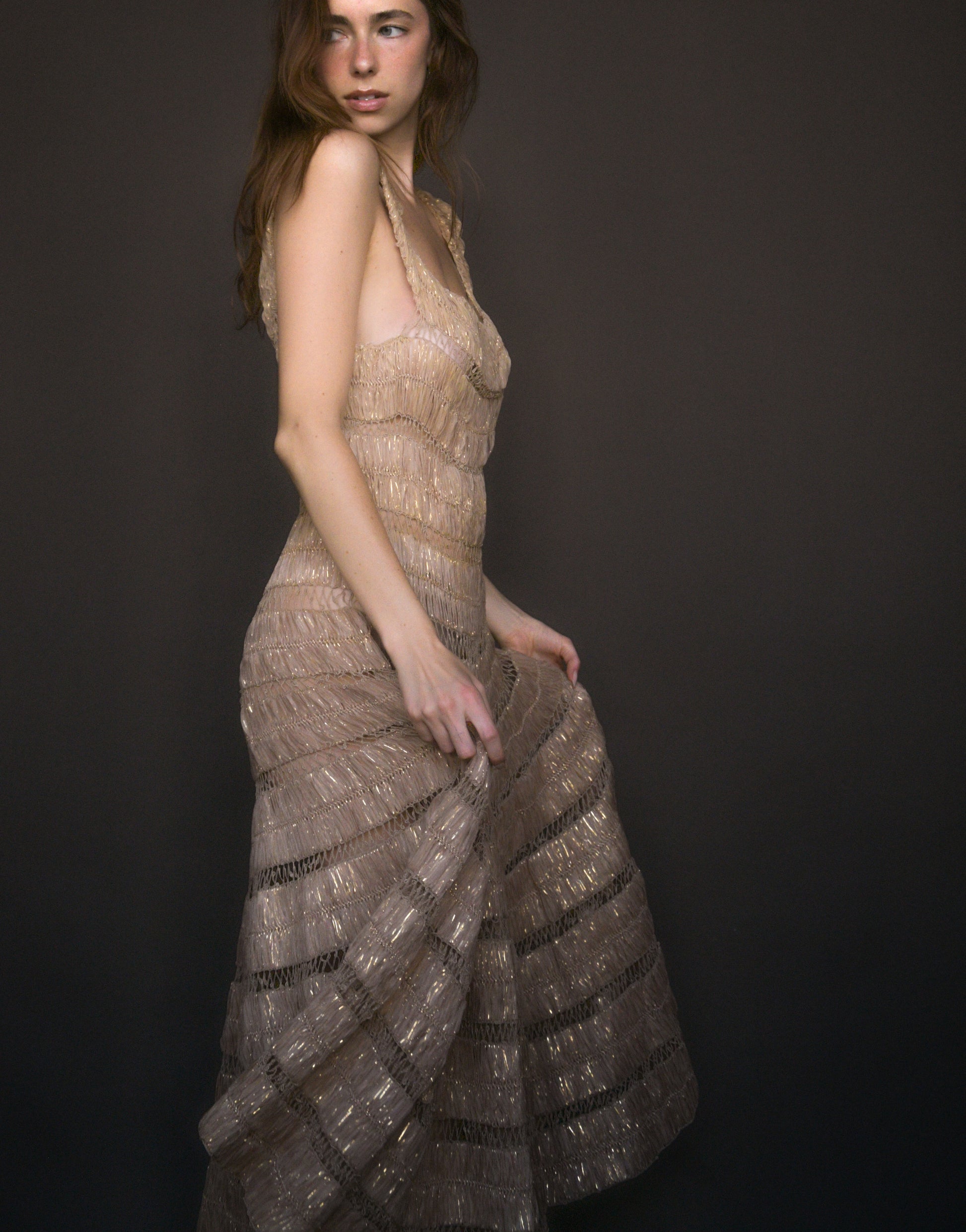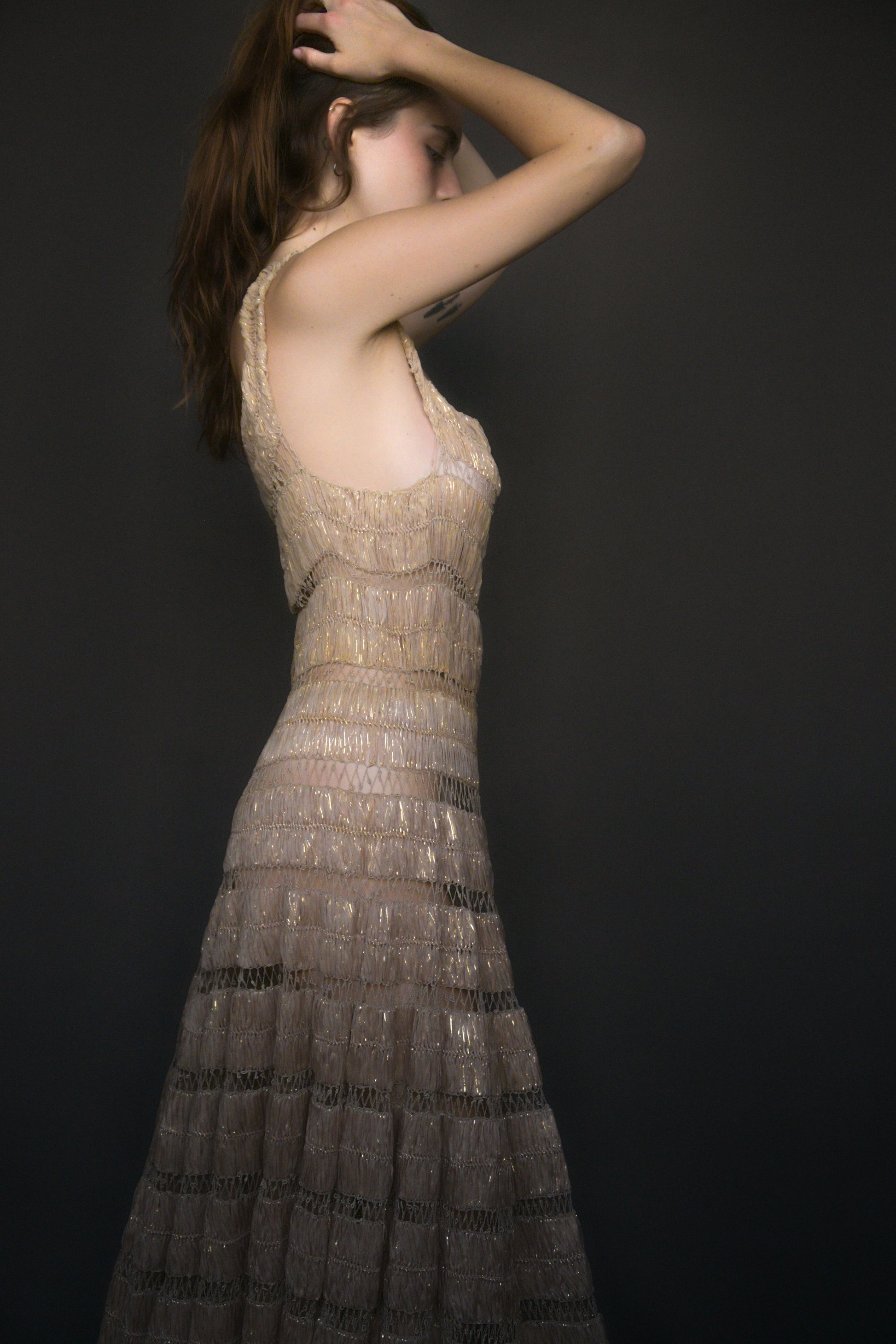 available is a 1940s/50s woven raffia midi dress. the star of this dress is really the stunning textile, which is a raffia-style ribbon made from a fine woven silk and metallic fabric, tan with hints of gold, that was handwoven together to beautiful effect. there was an earlier isabel toledo dress available in the shop that used an incredible ruching technique that created a similar tiered and textured textile-- this dress would definitely be the predecessor to that one. this dress features a slightly lower cut neckline and extra full skirt, with side zip closure. unlined.