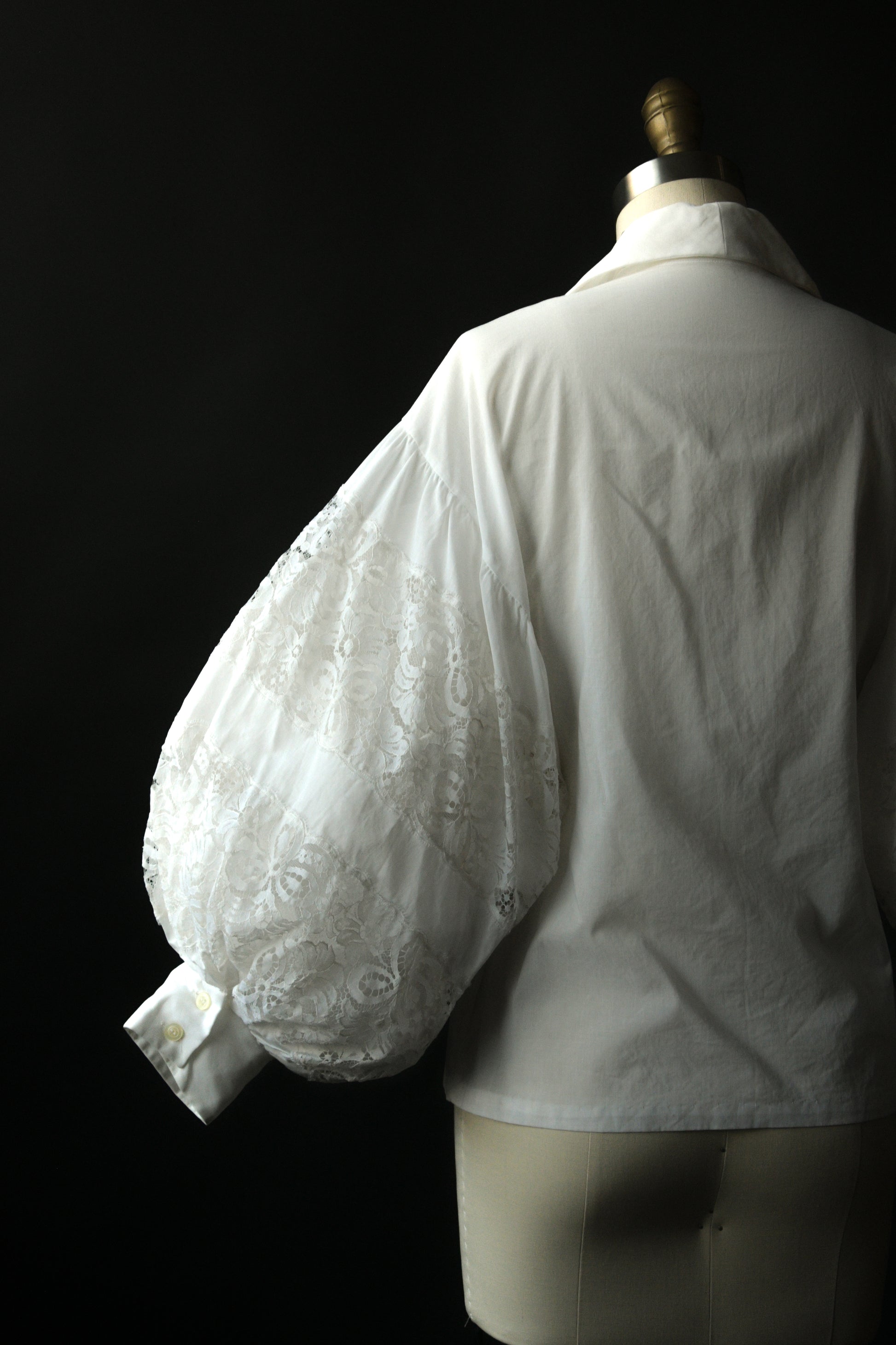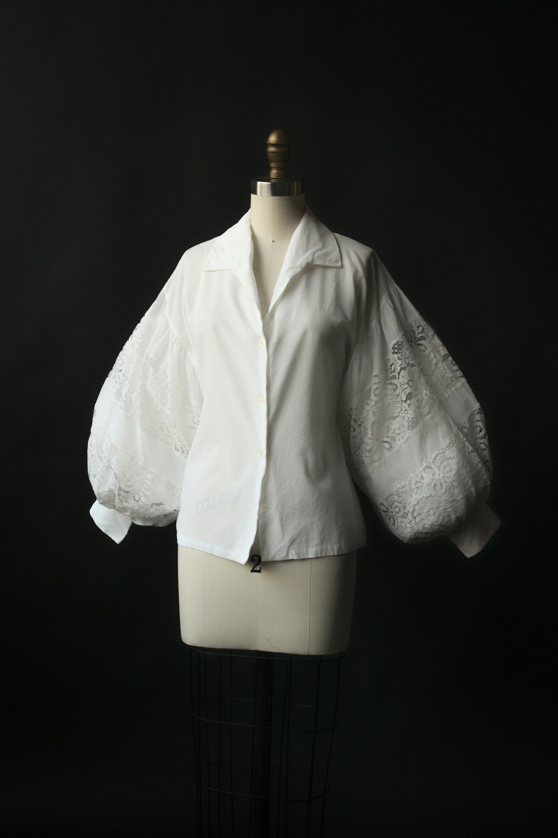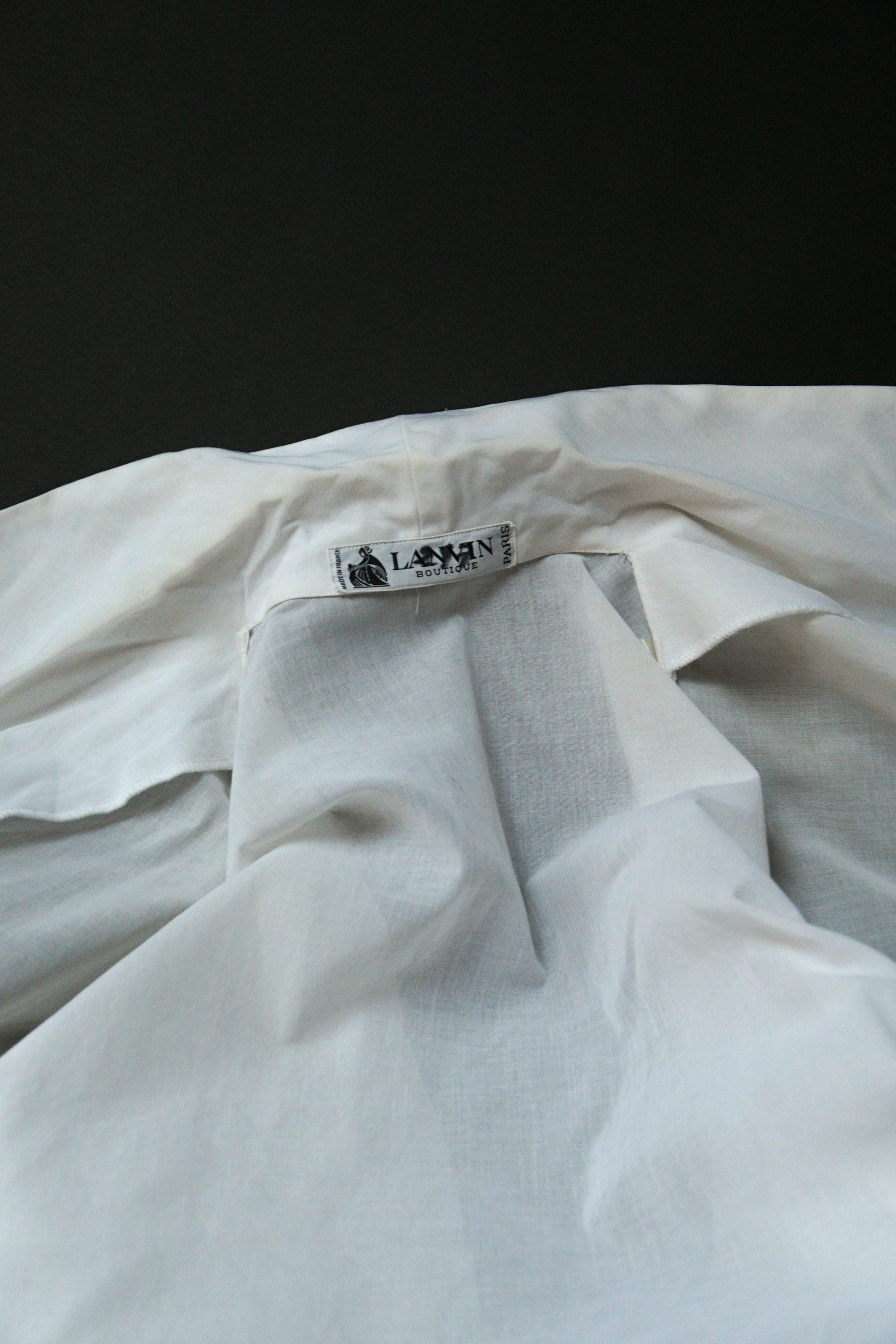 1960s lanvin by jules-françois crahay white cotton and lace balloon sleeve blouse. buttons down center. dropped shoulder seam and exaggerated sleeves. perfect tucked into high waist trousers or denim. similar blouses by lanvin from the era also seen in photos by louis-roger aster taken in 1969.
