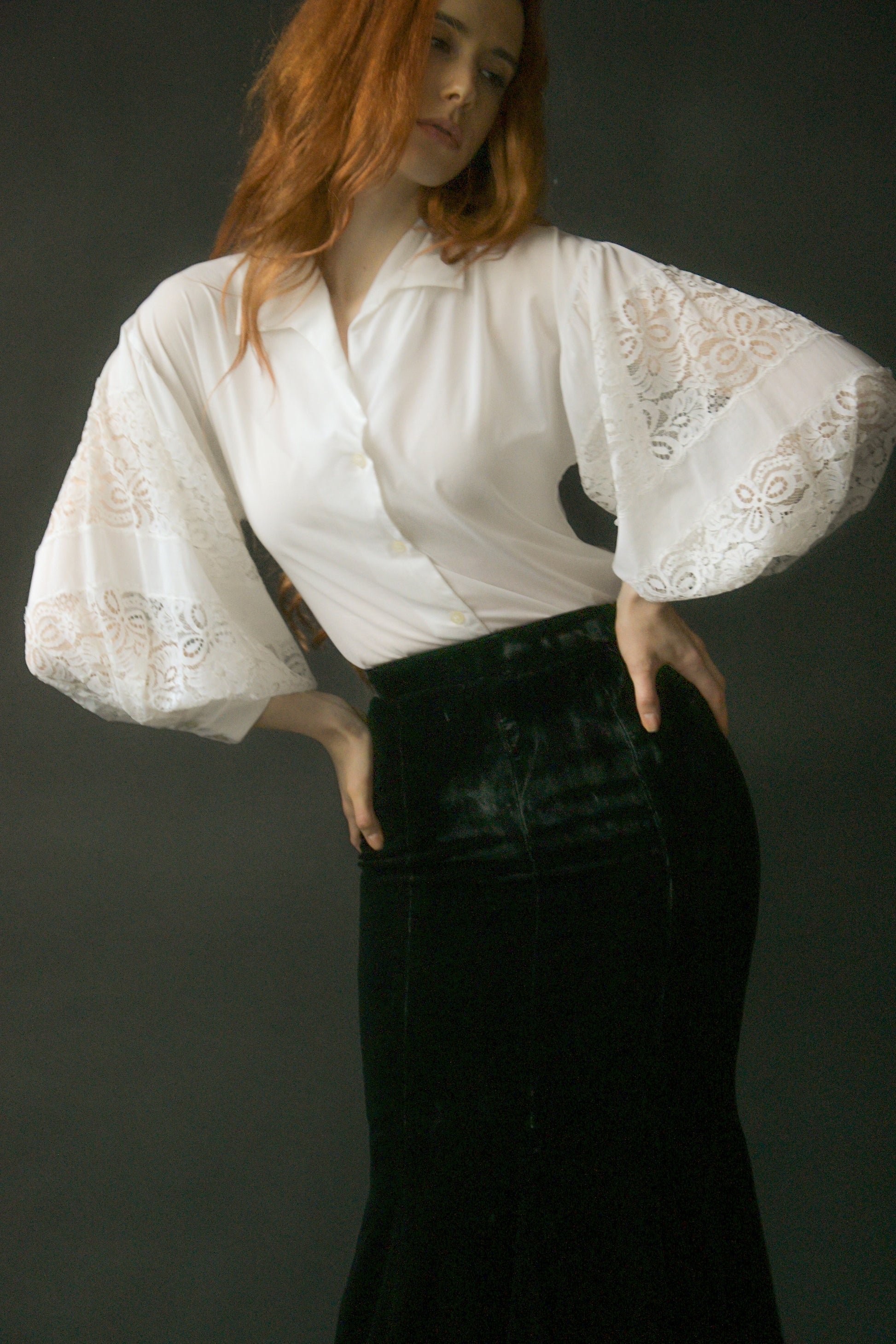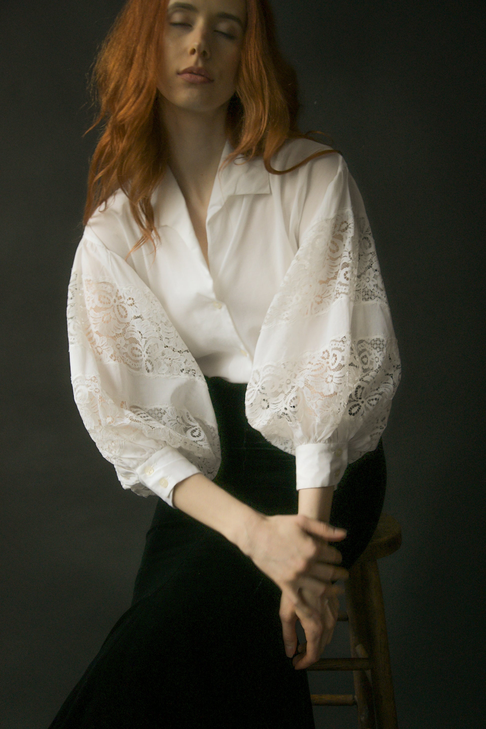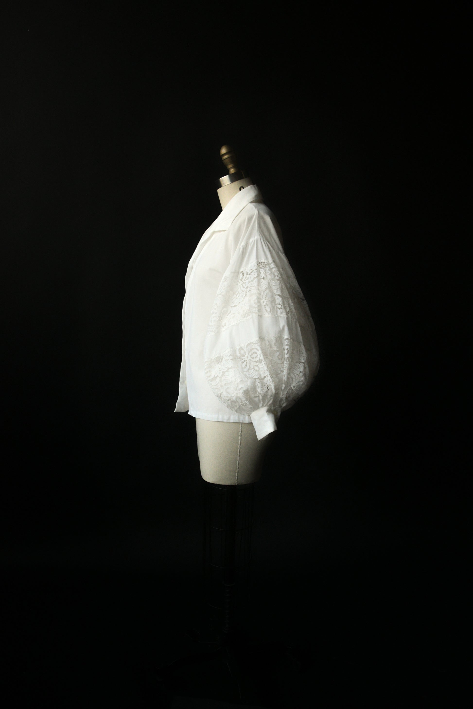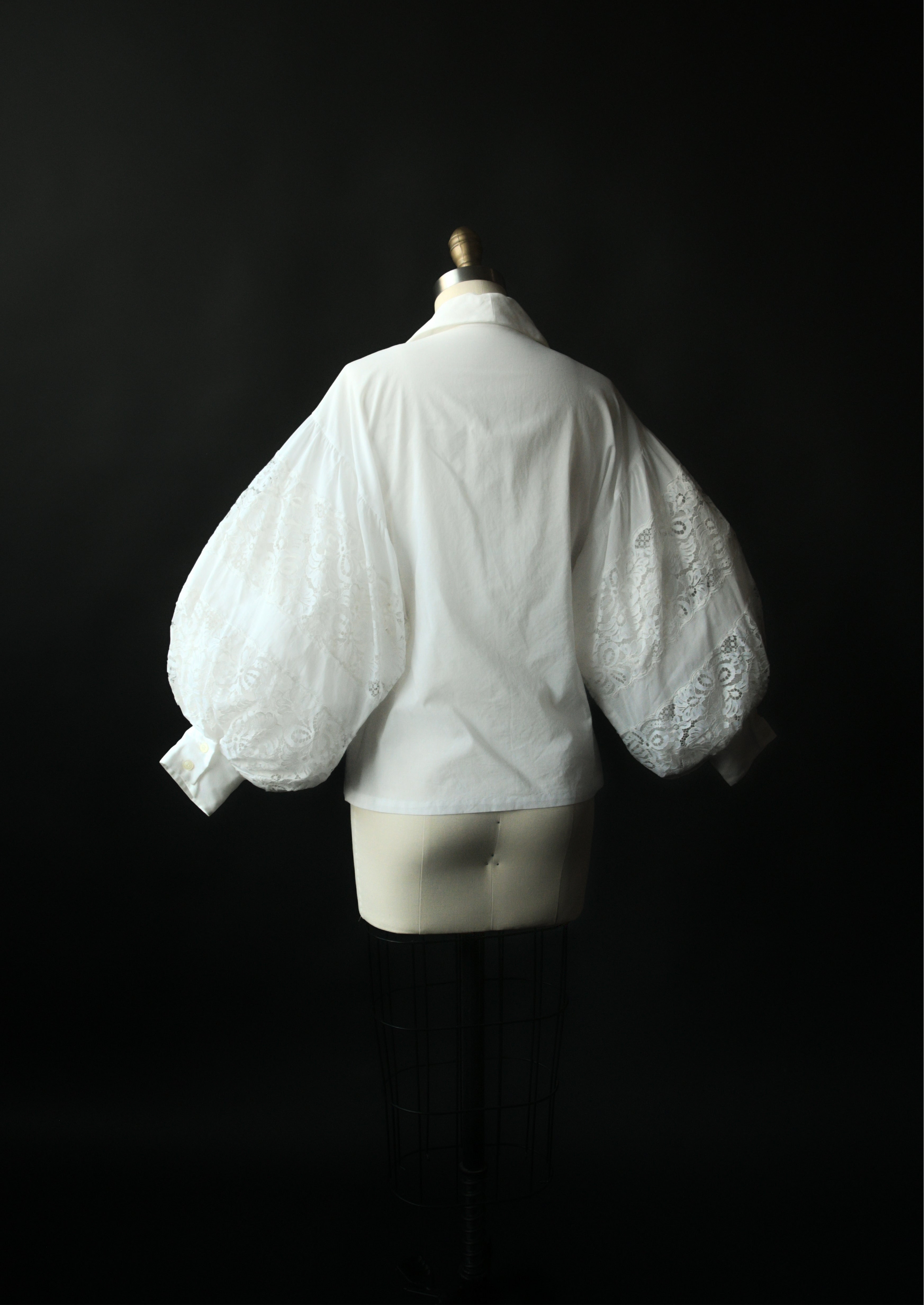 1960s lanvin by jules-françois crahay white cotton and lace balloon sleeve blouse. buttons down center. dropped shoulder seam and exaggerated sleeves. perfect tucked into high waist trousers or denim. similar blouses by lanvin from the era also seen in photos by louis-roger aster taken in 1969.