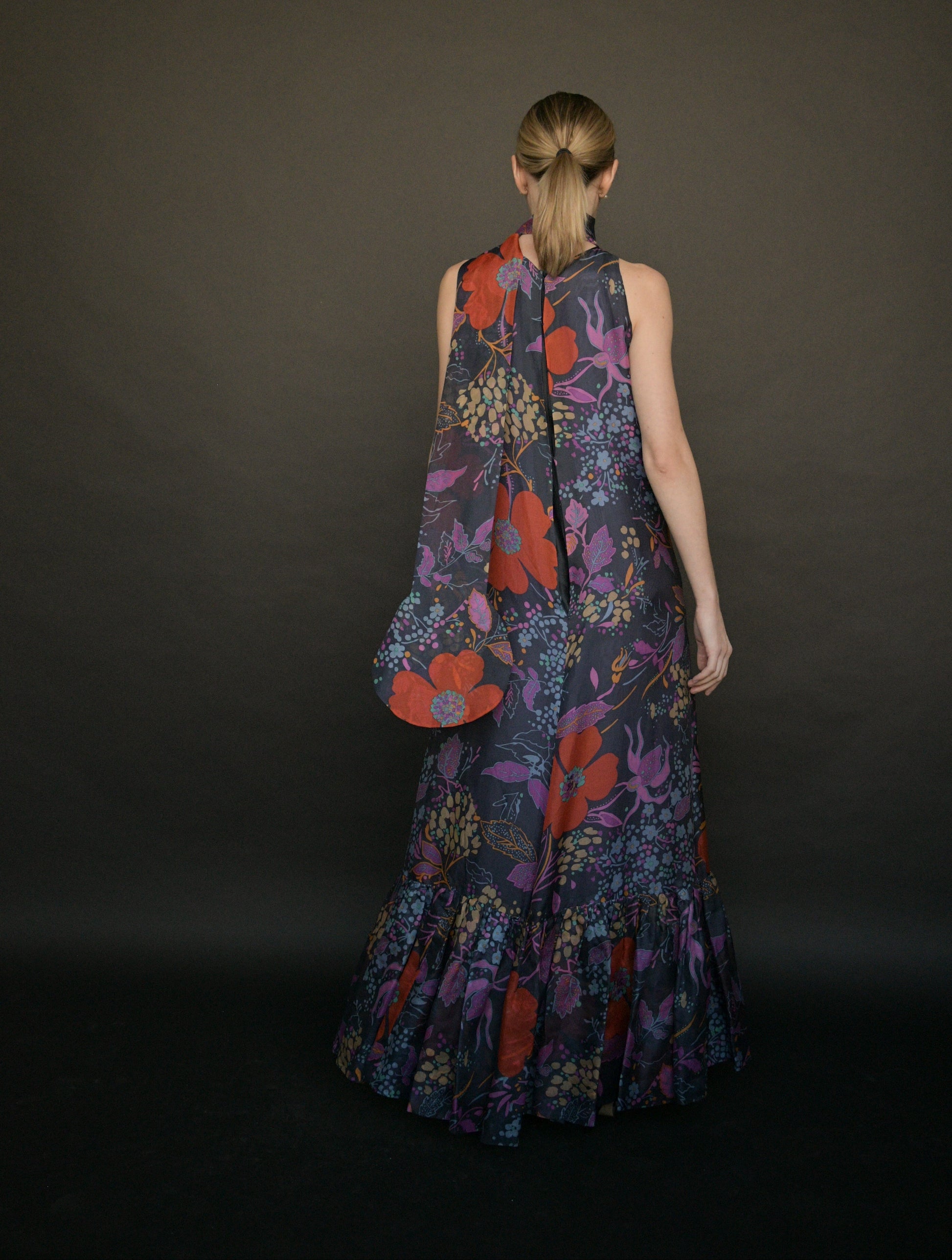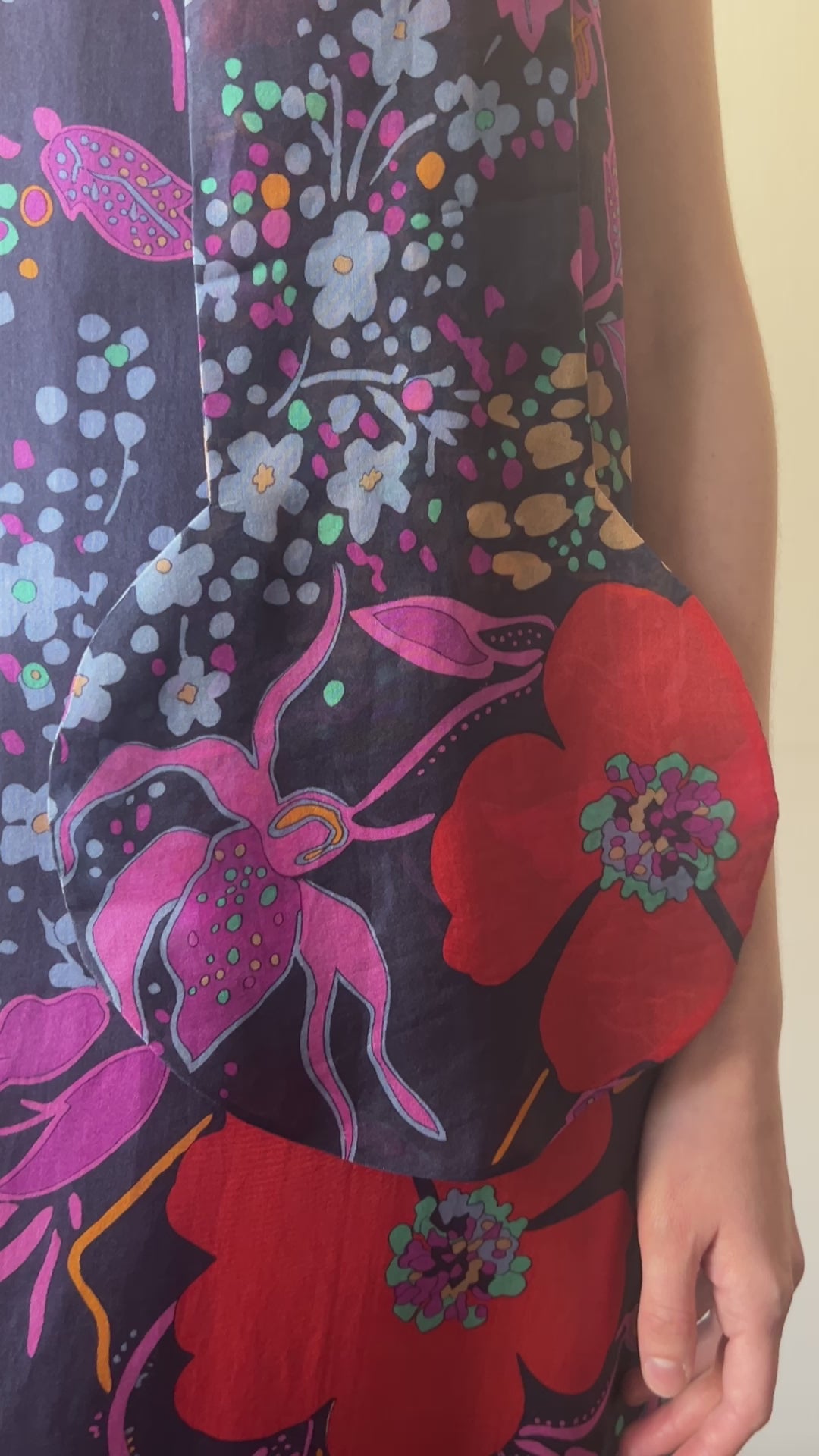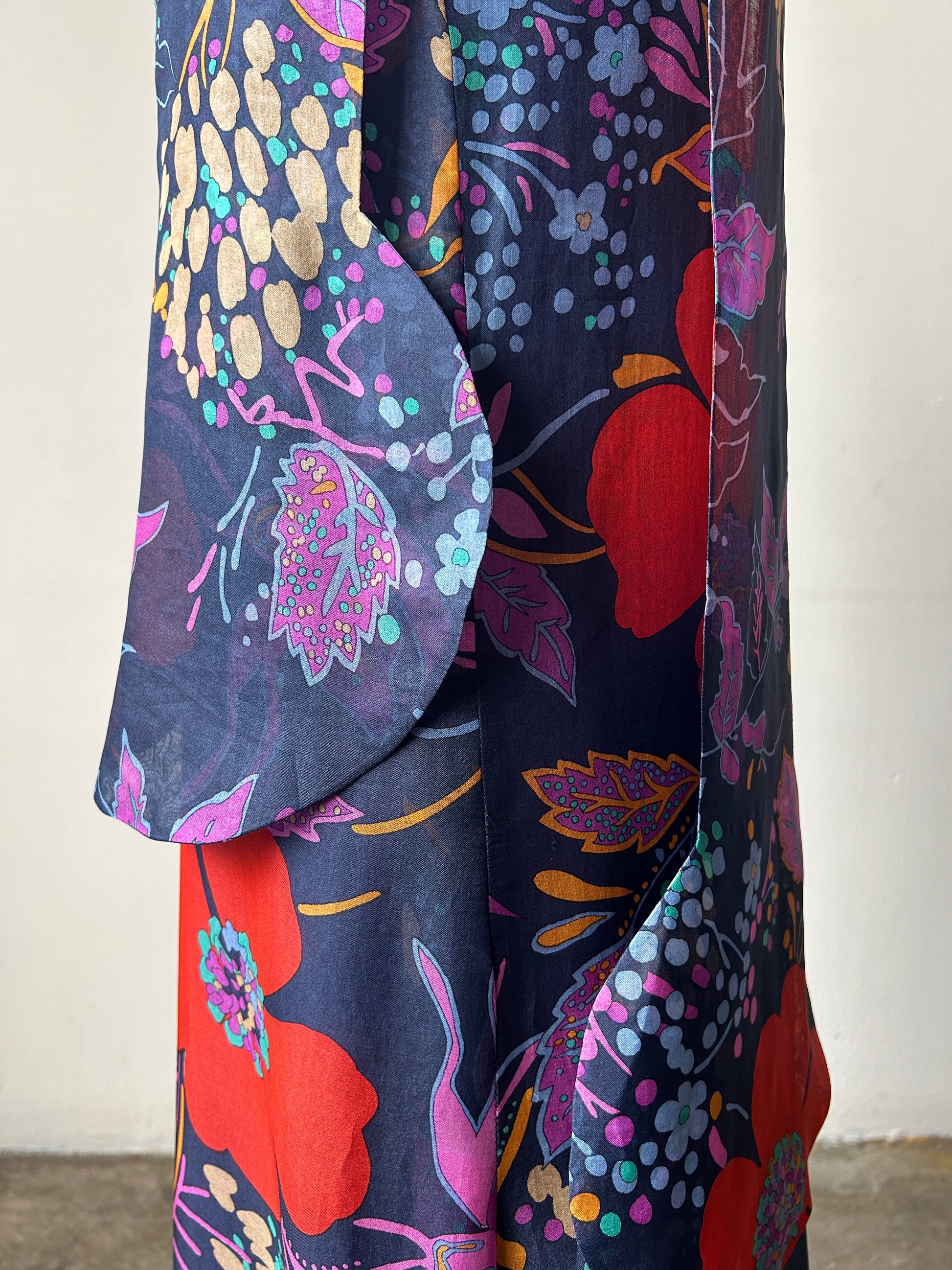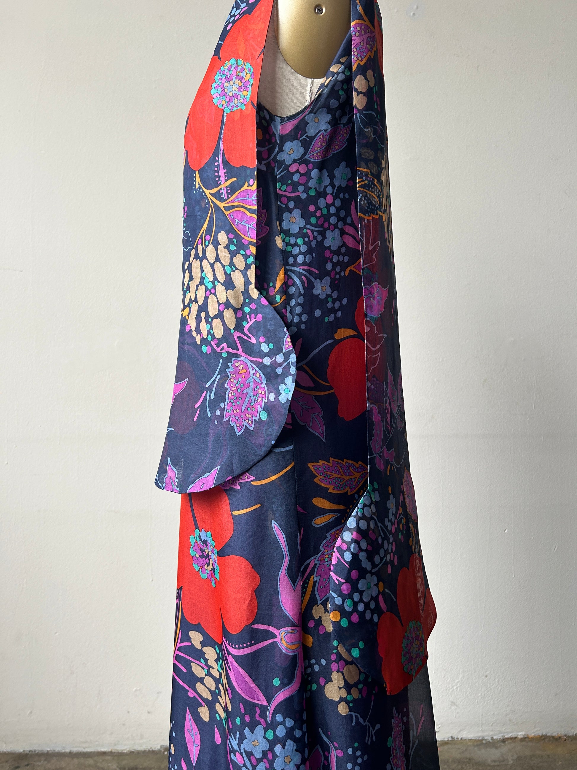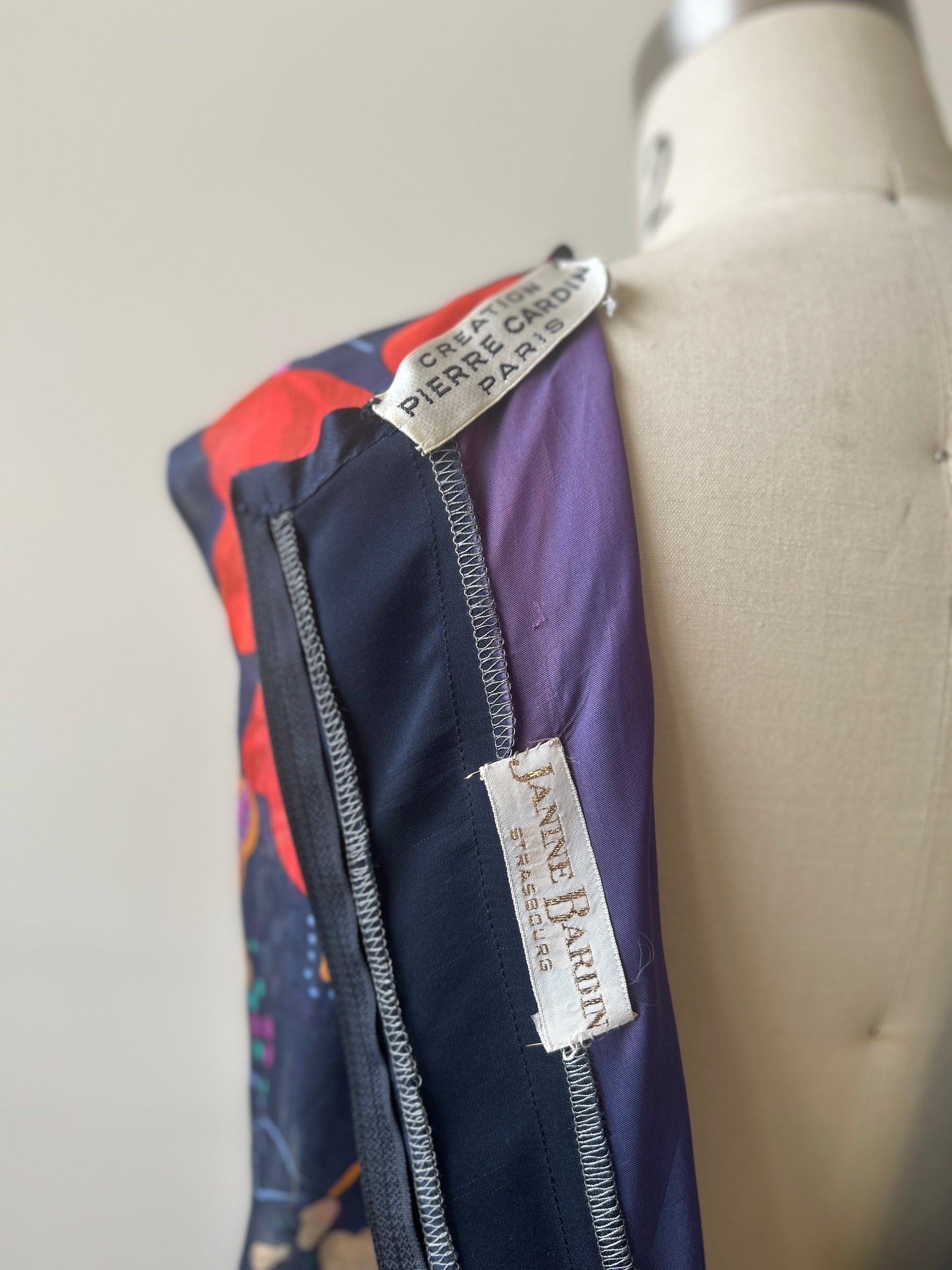 this dress is unique with its dash of pierre cardin's iconic futurism in the circular shaped ends of the long scarf (that is actually an extension of the collar)-- a standout design element of the dress that floats around you as you move - this circular motif was used repeatedly through his work. the dress's overall silhouette is much more romantic and chic and wearable in a fine cotton silk blend. the long clean line of the dress that ends at the ruffle hem works to lengthen the body and the ruffle hem sways beautifully as you walk (shown in the videos). the dress is lined under the floral overlay and has hook closures down the back, with an inner zip closure in the lining. a somehow both romantic and futurist (and collectible) iconic piece.