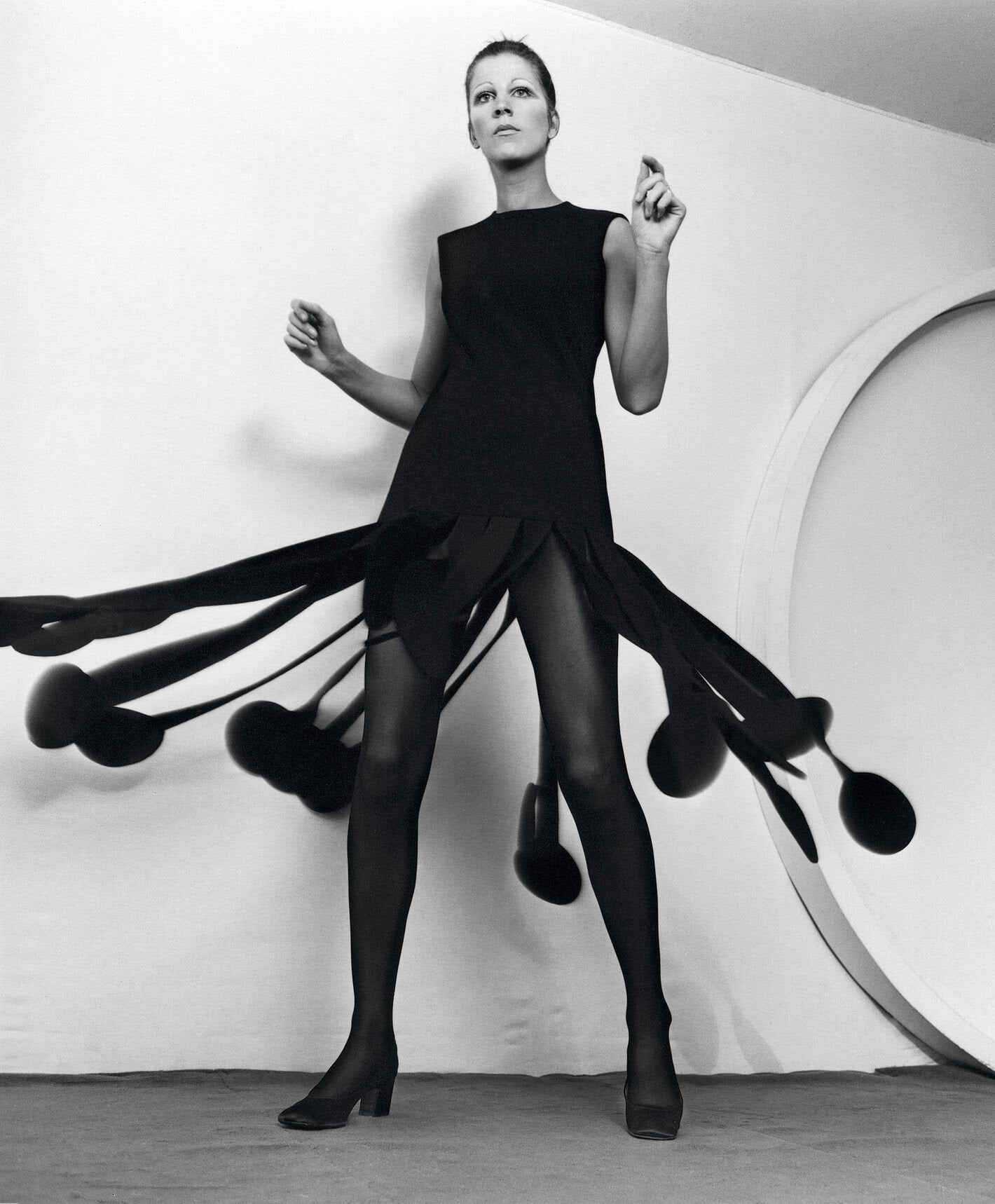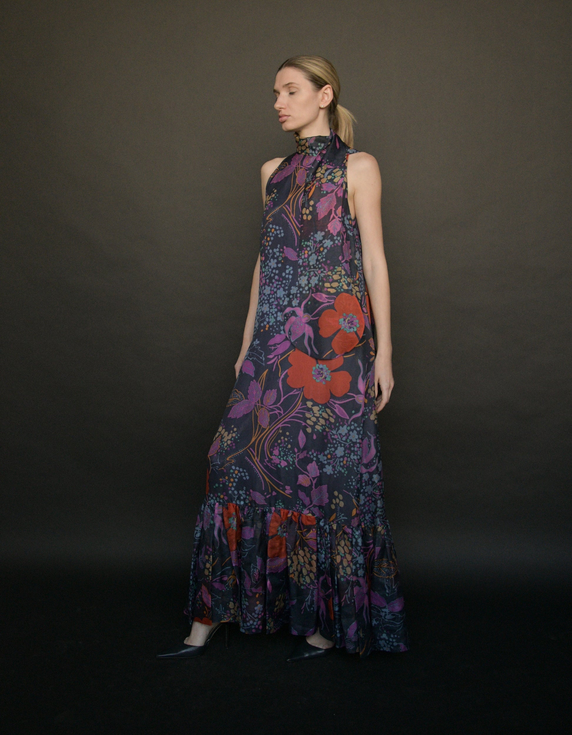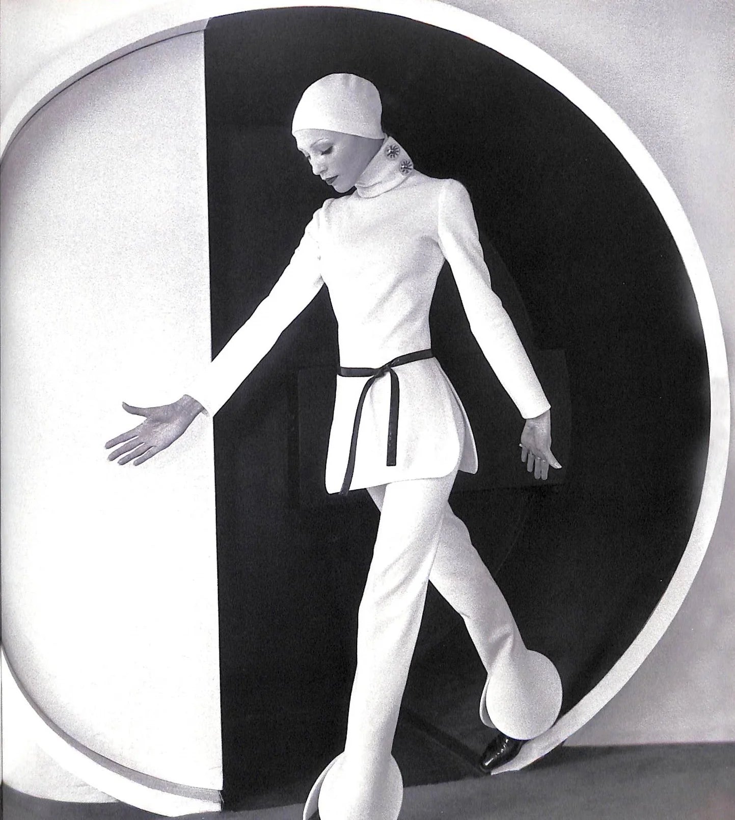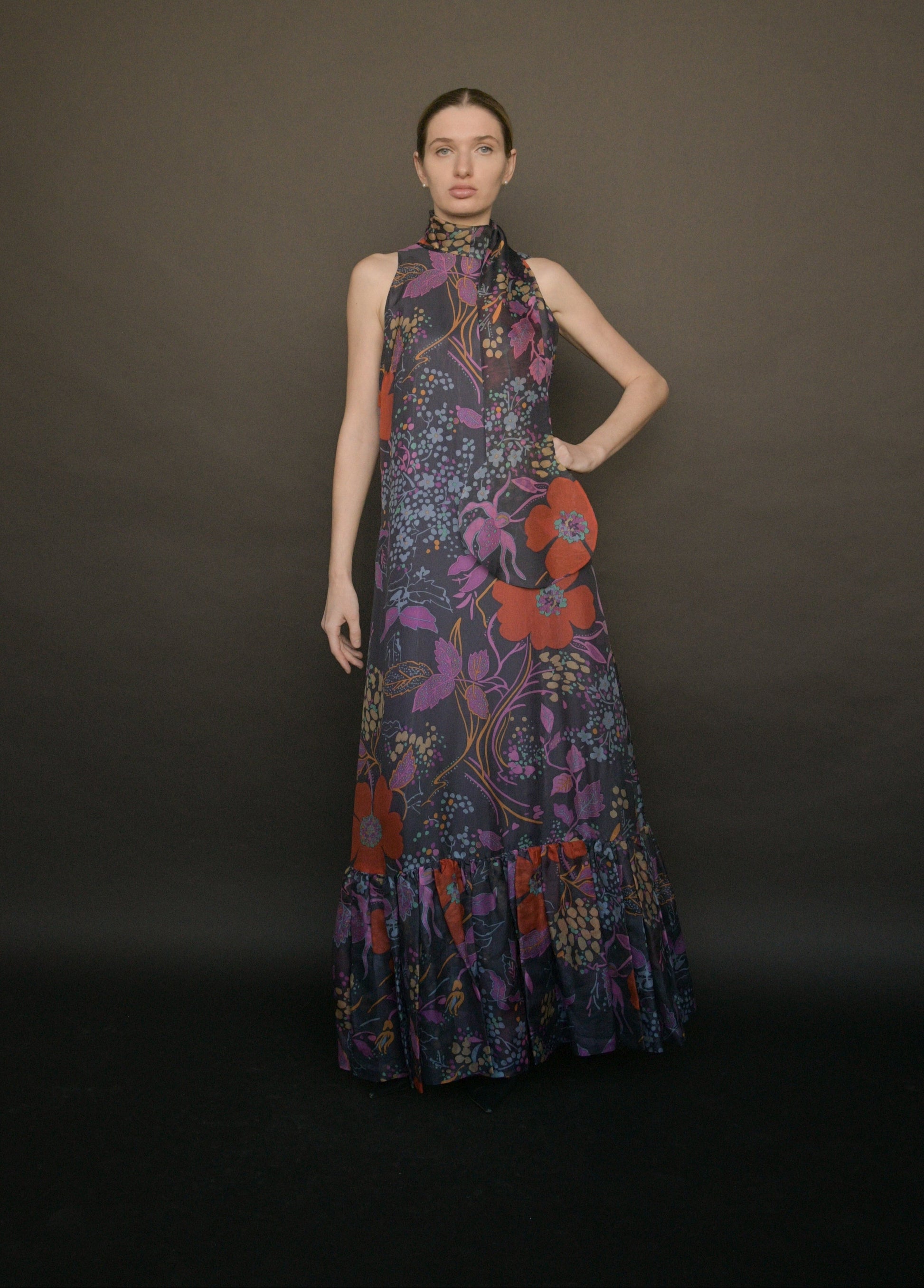 1960s pierre cardin floral floor length dress with circle scarf collar. pierre cardin shaped the mod aesthetic with space-age fashion — futuristic collections influenced by geometric shapes and crafted in fabrics like plastics and vinyl. cardin revolutionized the materiality of dress in the 1960’s through minimalist, contemporary forms. the cardin-girl is special and not only at the cutting edge but ahead of it.