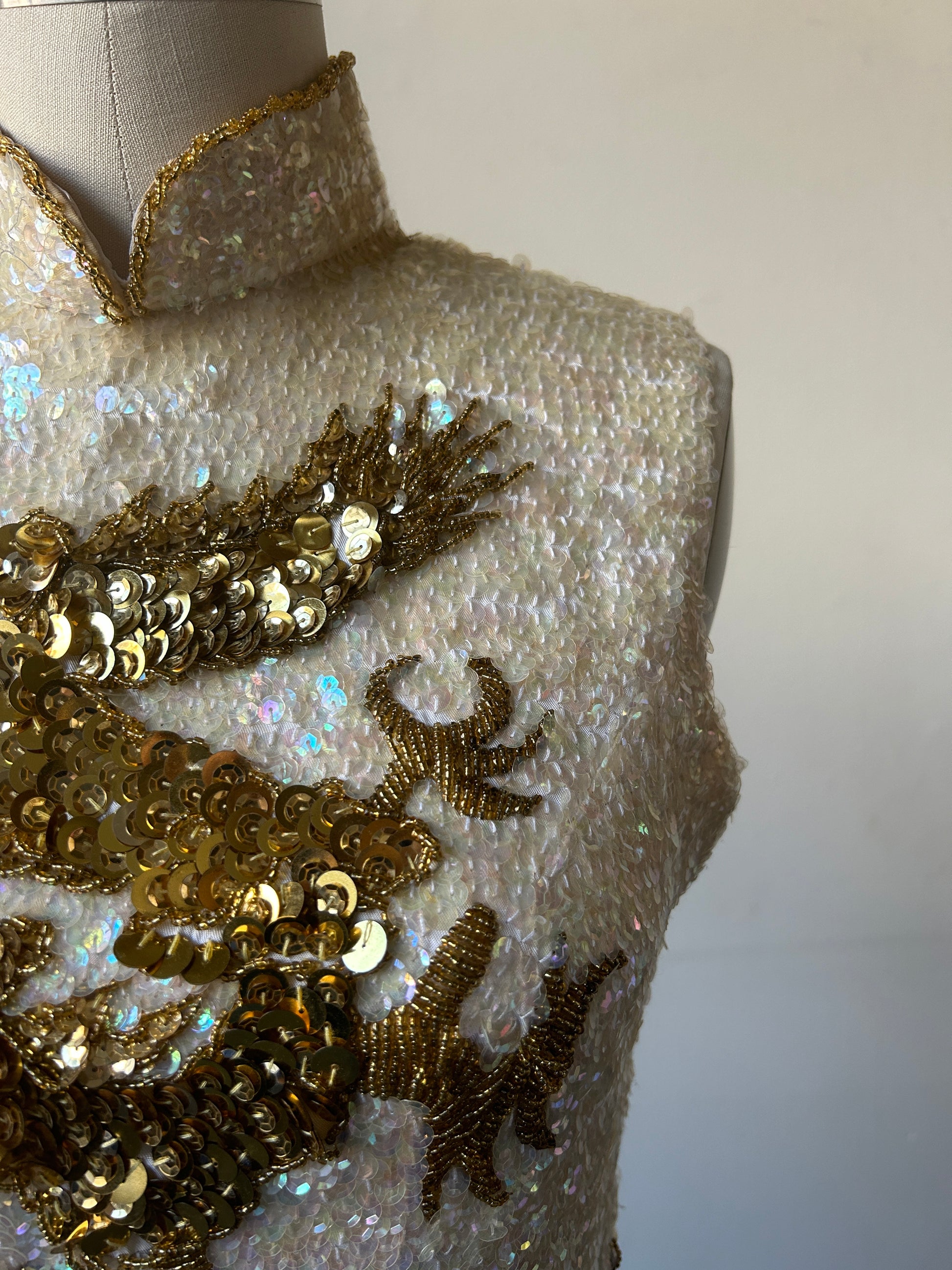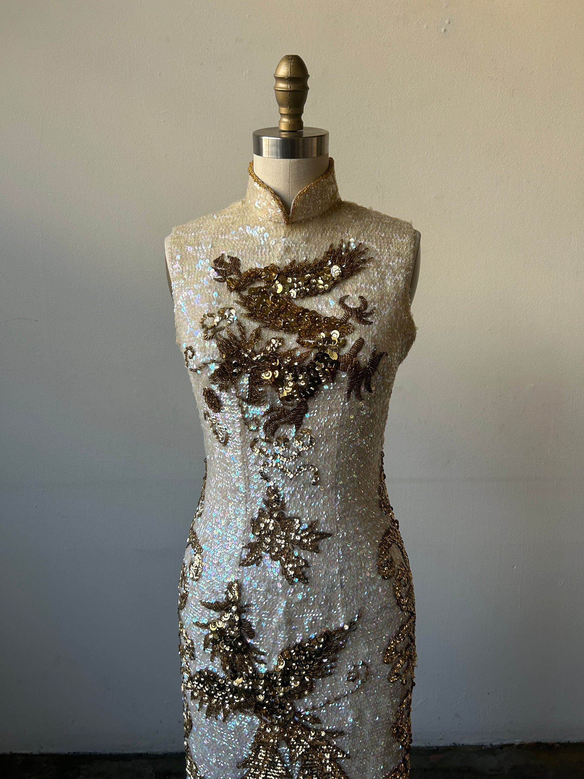 an amazing 1960s sequin and bead hourglass cheongsam / qipao dress. this dress features clear iridescent sequins with a contrasting gold dragon and phoenix motif, with gold ornate trim. the dress has high side slits, is fully lined and has a back zip closure. the phoenix is a symbol of heaven's favor, luck, and happiness-- an additional reason why this dress would make an incredibly chic second dress for the right bride.