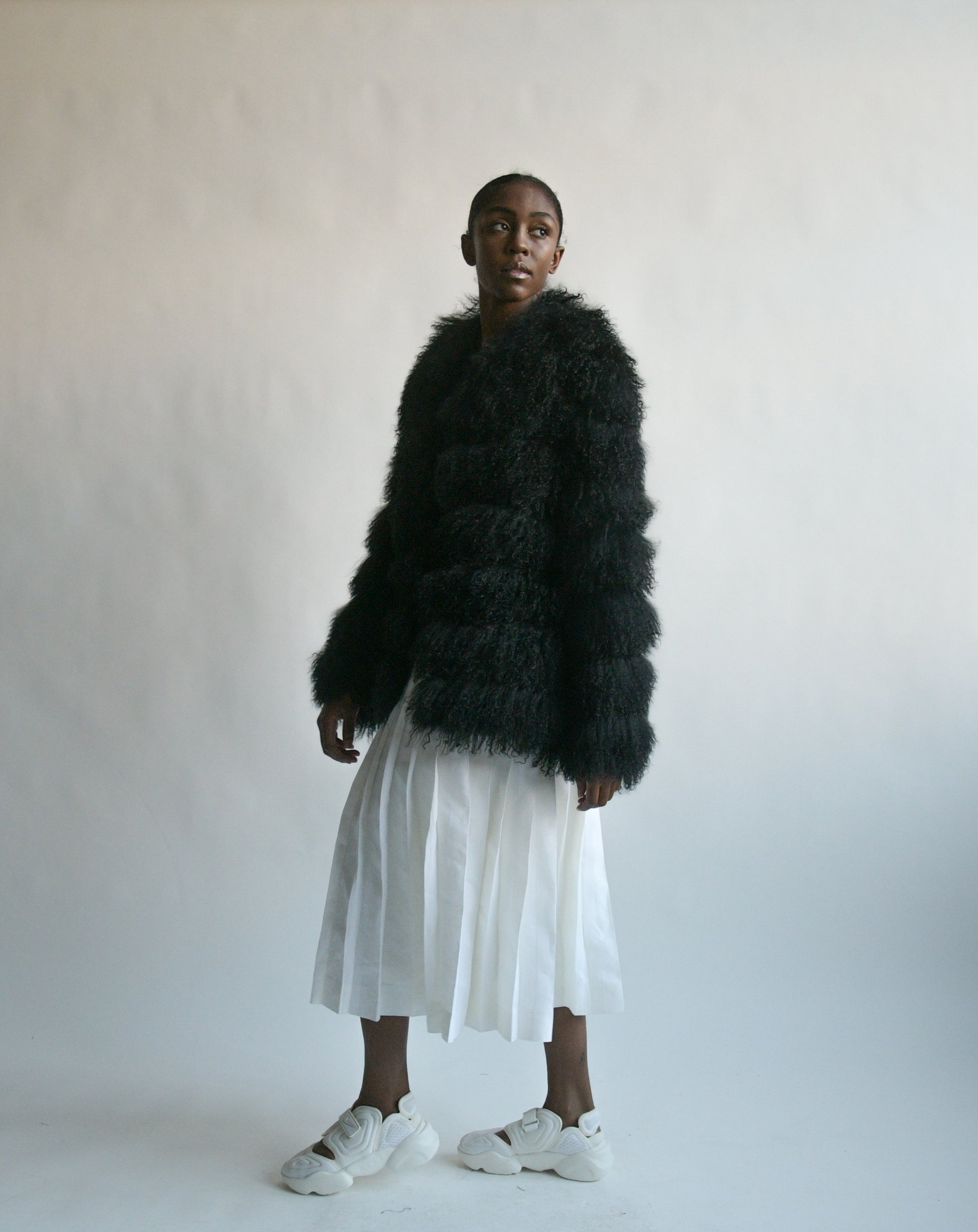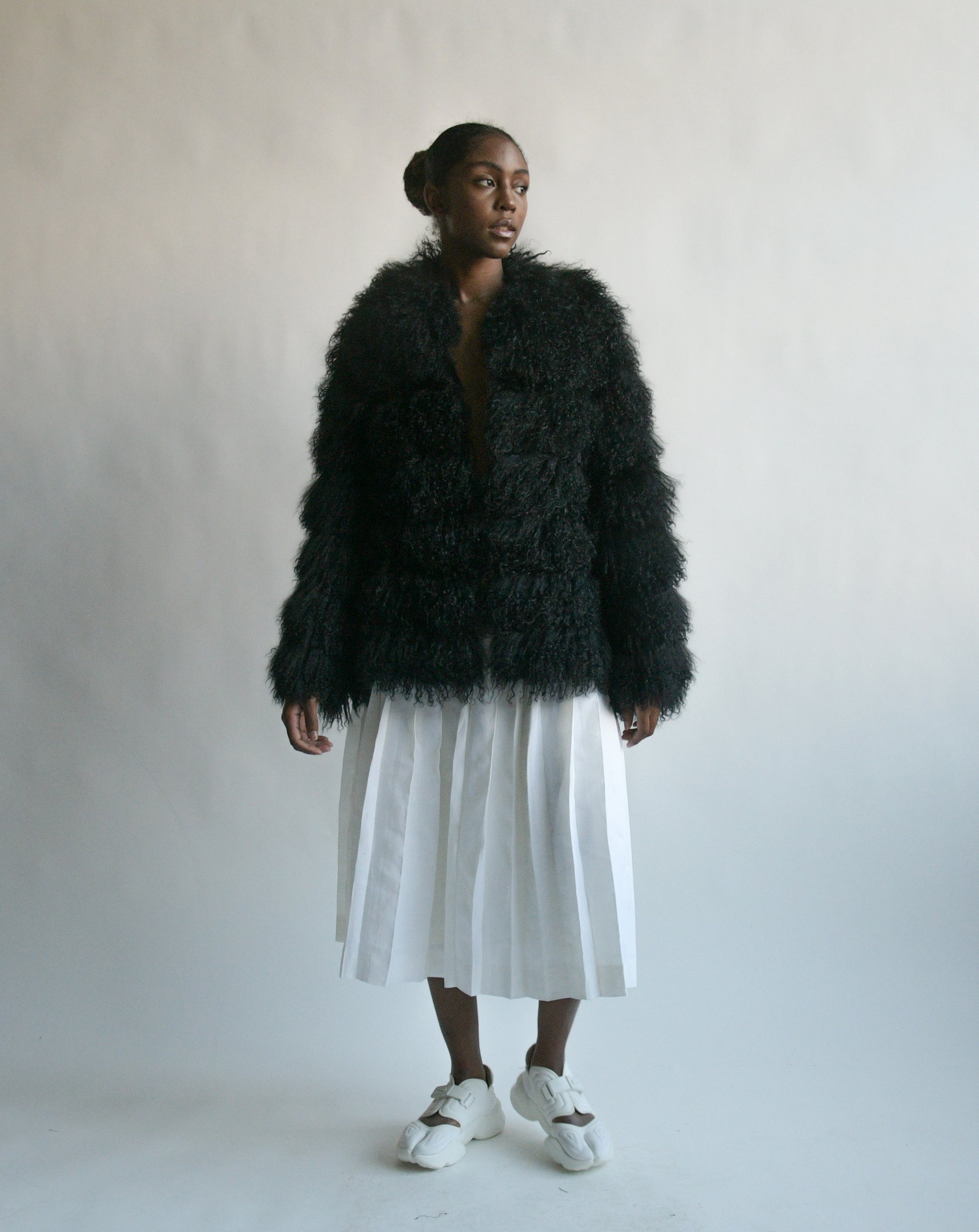1990s black dyed mongolian fur coat. super soft. lined with pockets at waist and hook closures down center.