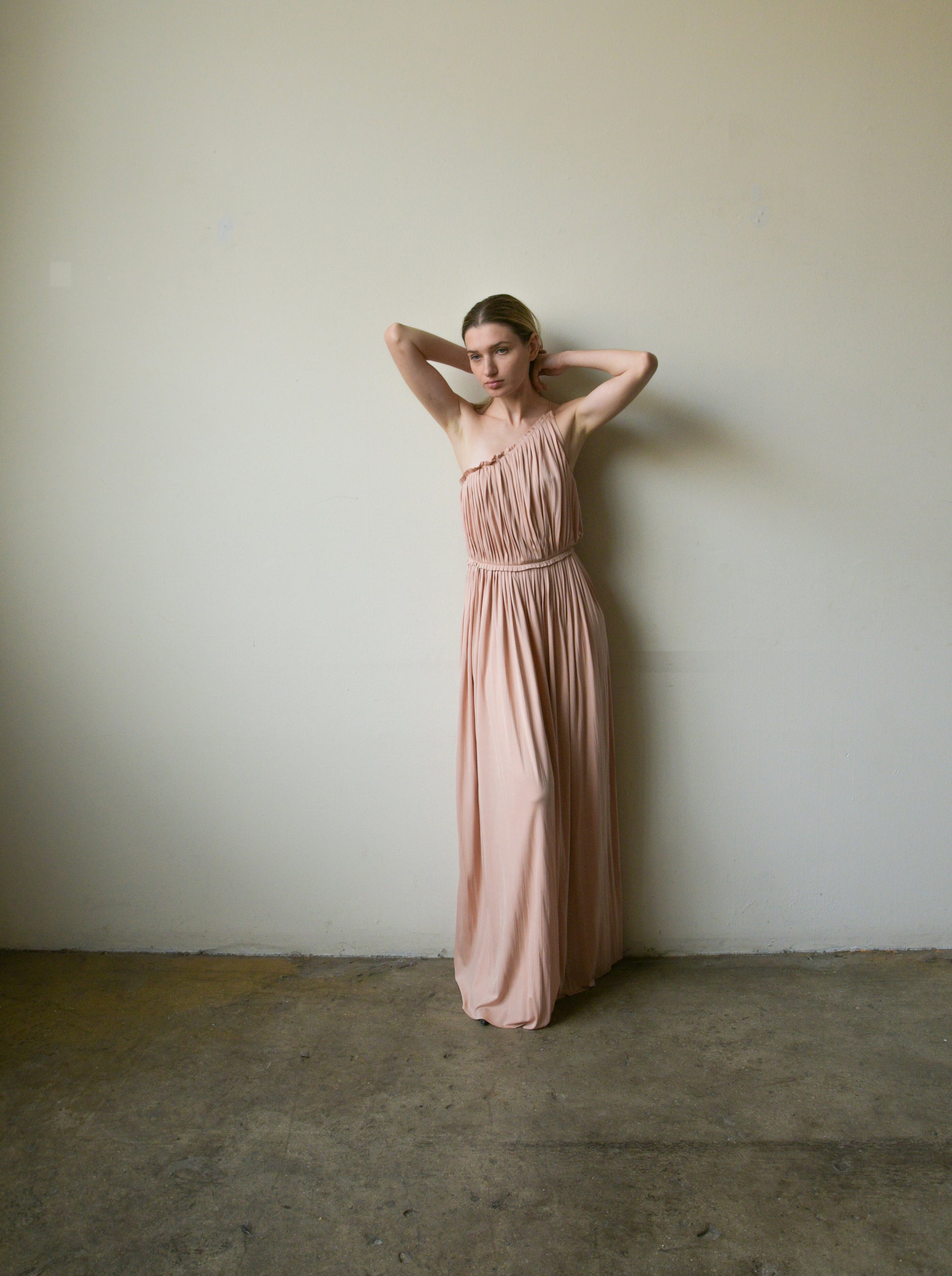 available is a christian dior ss 2019 blush pink pleated floor length grecian-style dress. for that season, maria grazia chiuri was influenced by modern dance - “i wanted to speak about dance with a different point of view. i think that dance and fashion are very close, for they both speak about the body.” she added, “modern choreographers speak about freedom.”