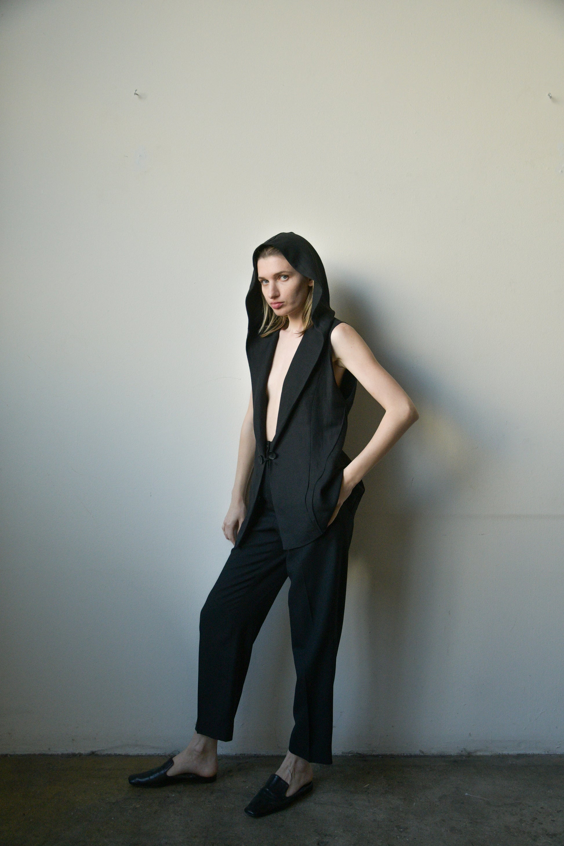 claude montana linen hooded sleeveless jacket. lined, single button closure at waist, pockets at waist.