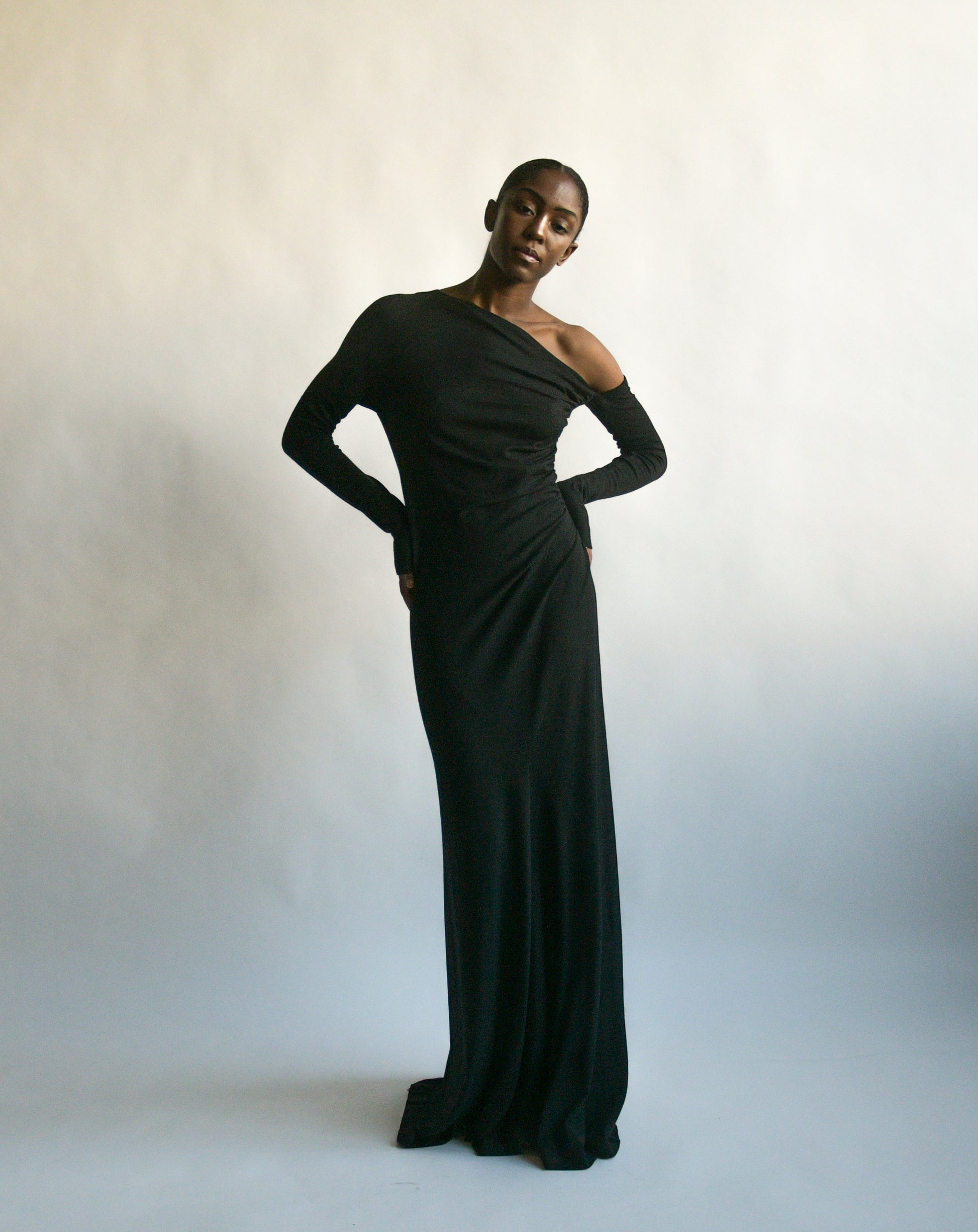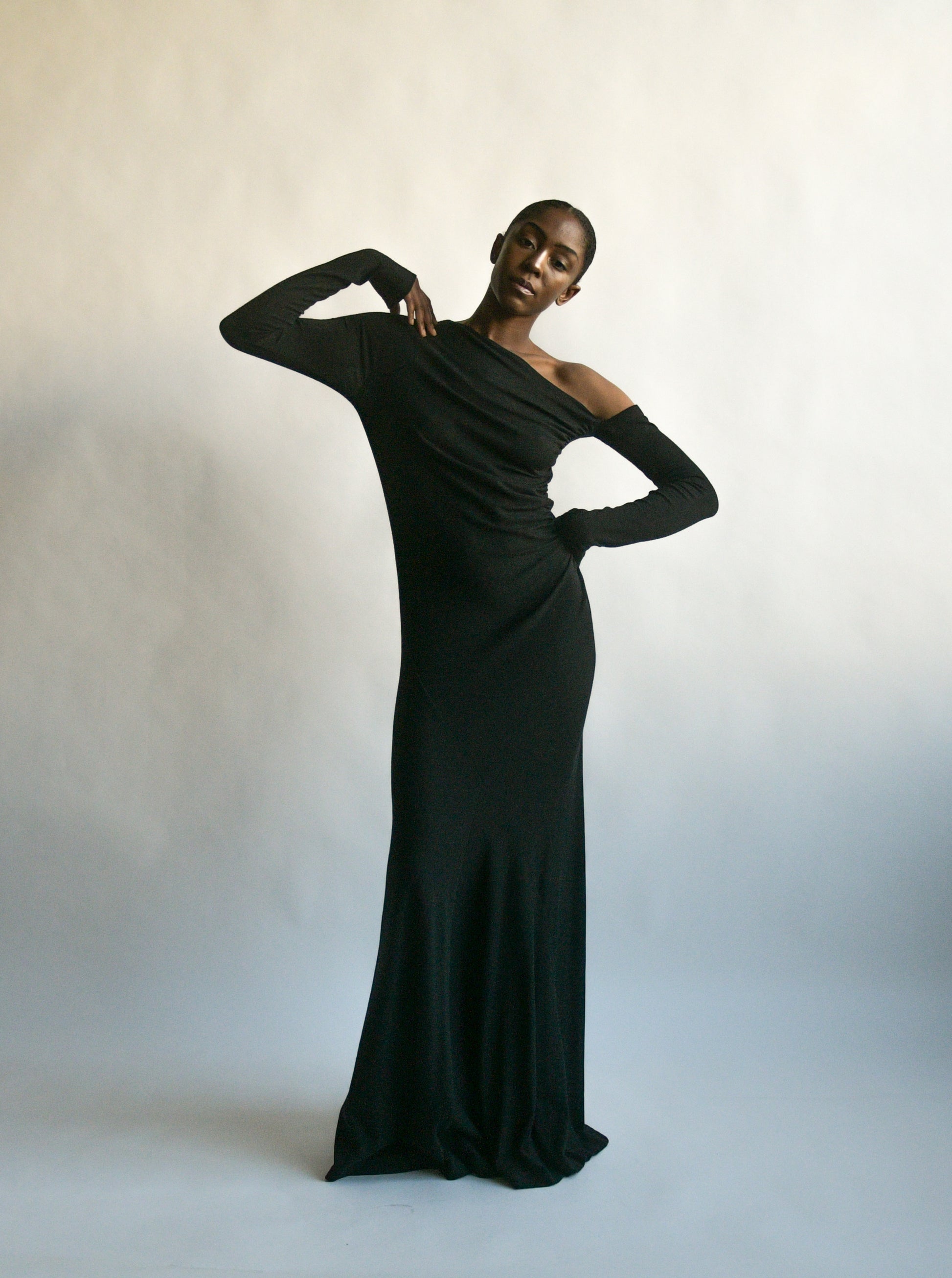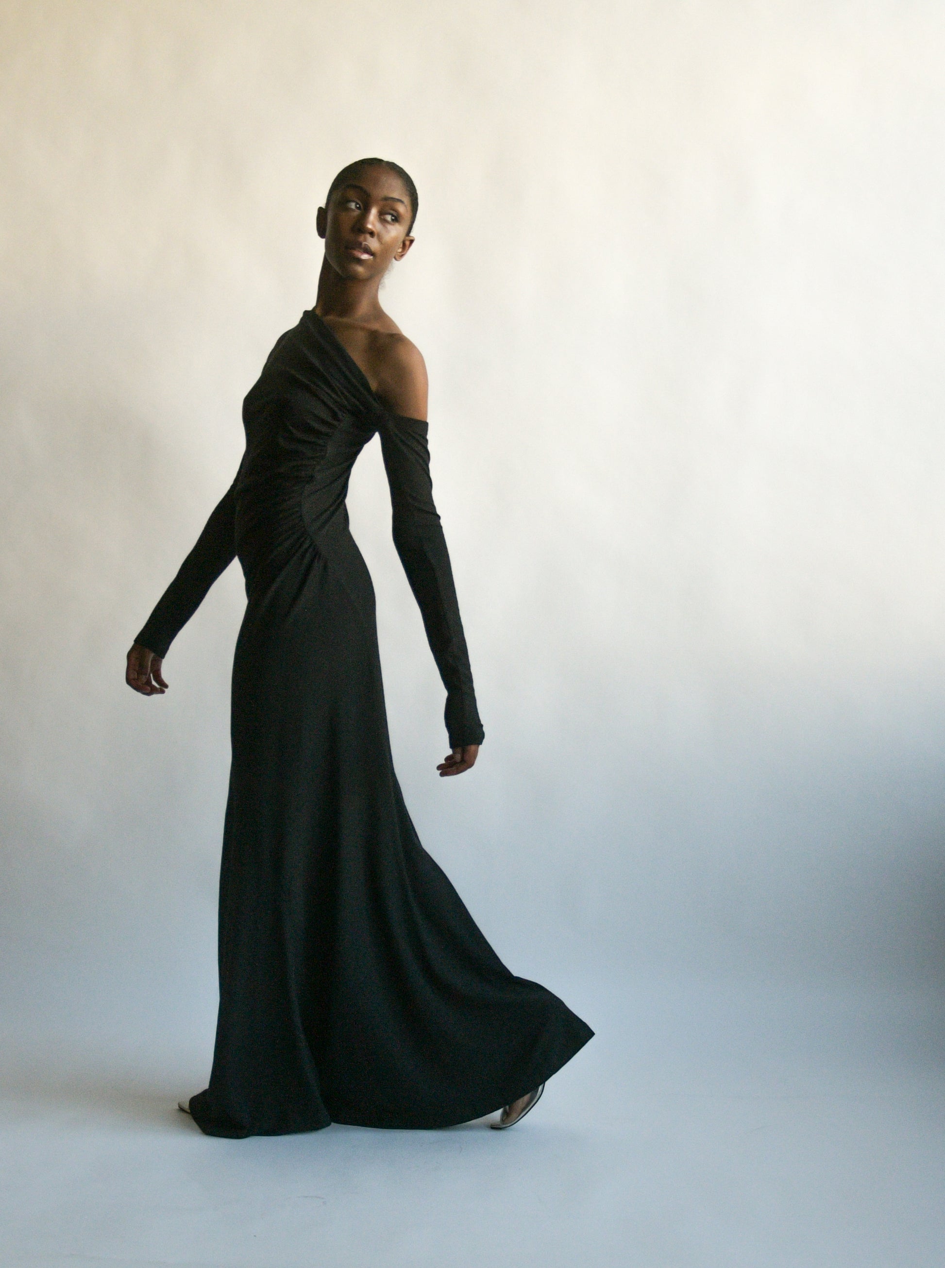 donna karan black label wool asymmetric shoulder dress. asymmetric shoulder detail with slim sleeves. ruching detail at side. wool has slight stretch for fit.