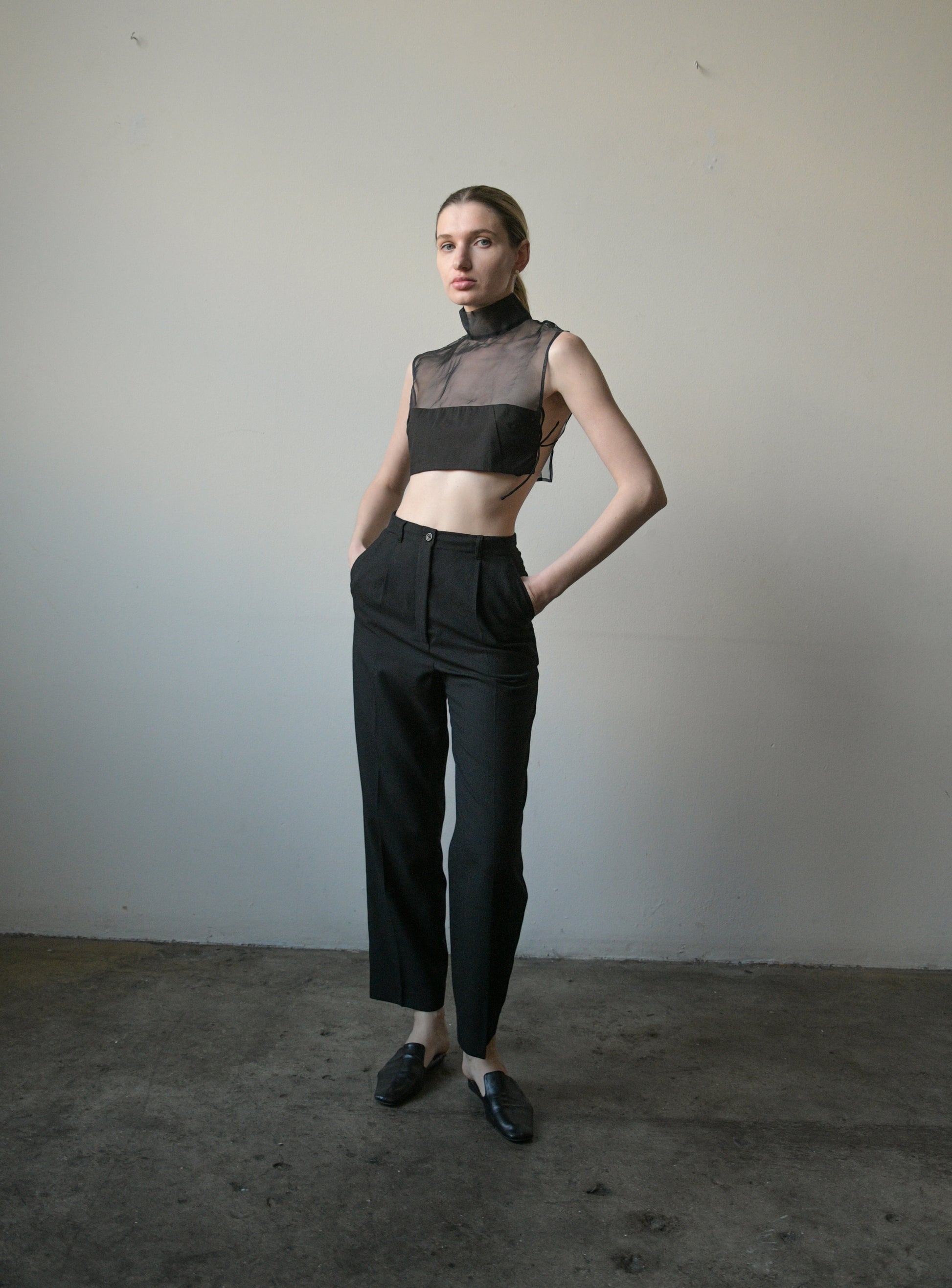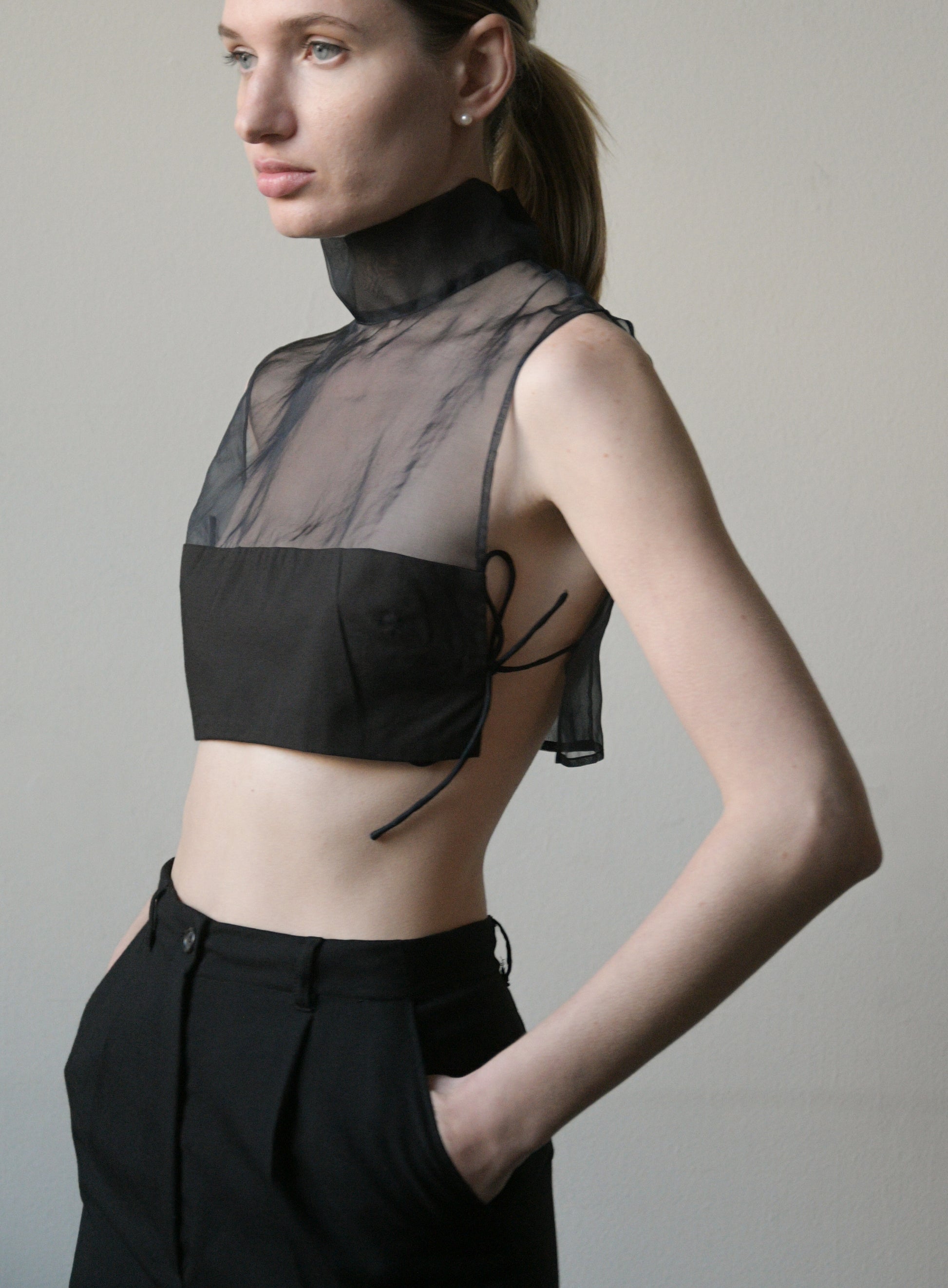 dries van noten black silk crop top. this top features a stand up collar, black opaque band across the chest, contrasted with the sheer silk organza top of the bodice, side tie closures, back button closures. there's a slight asian-influence in the side tie closures and the fabrication.