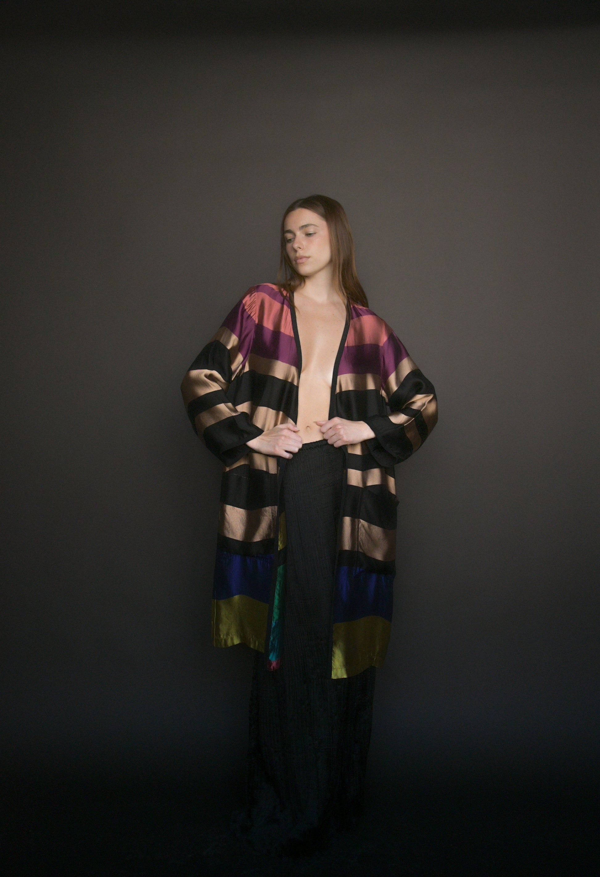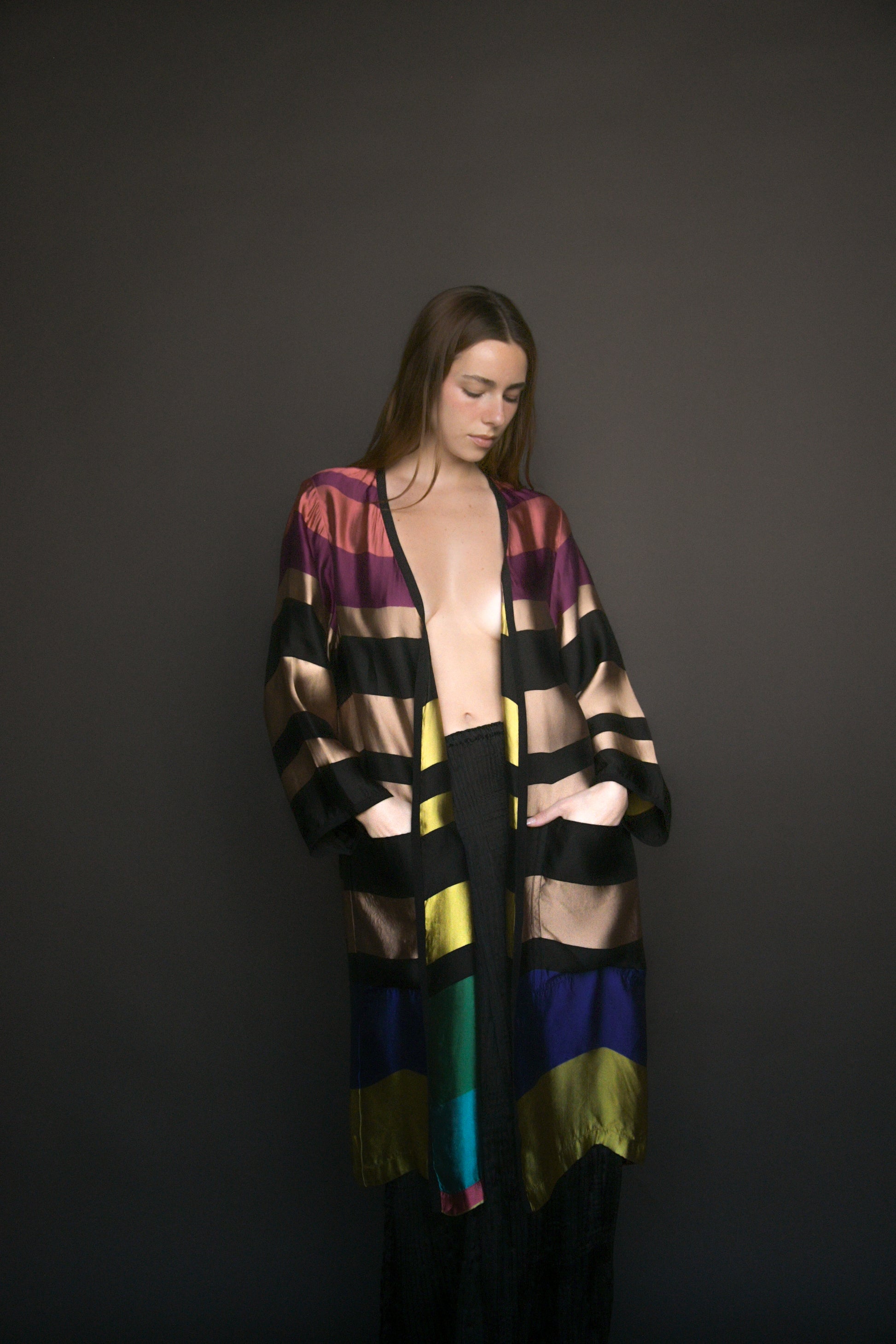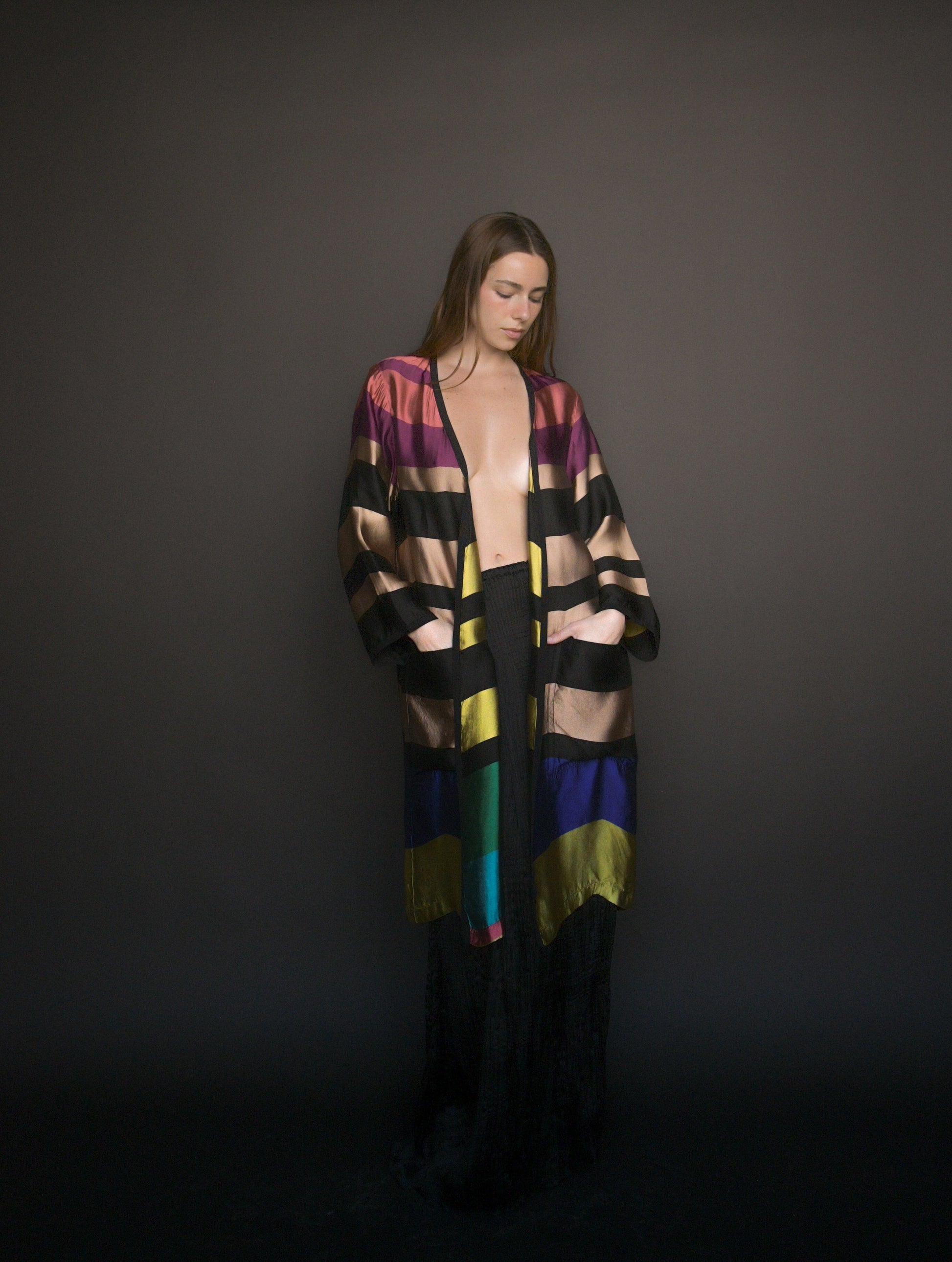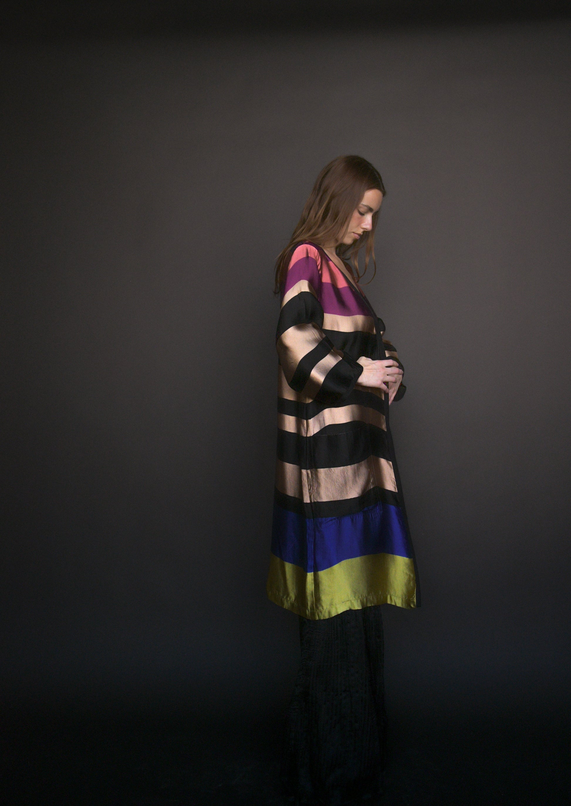 a dries van noten ss 2015 jewel toned silk blend reversible striped coat. oversized fit with no closures. pockets at the hips. unlined. this piece is a beautiful statement coat that is easy to throw on to make an instant outfit.