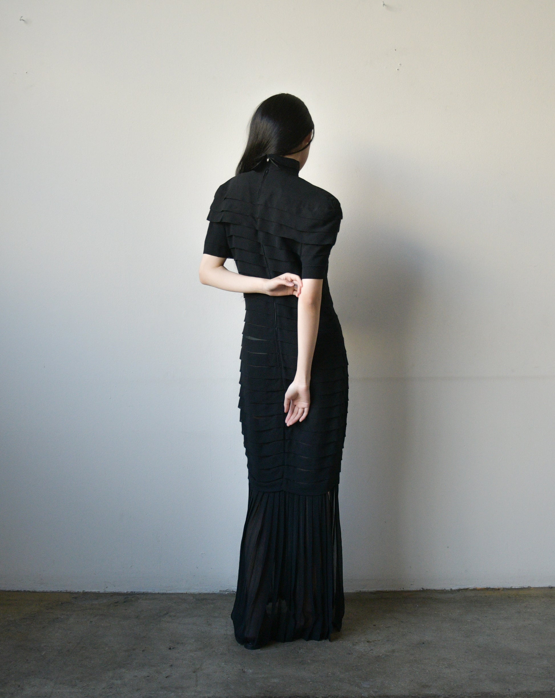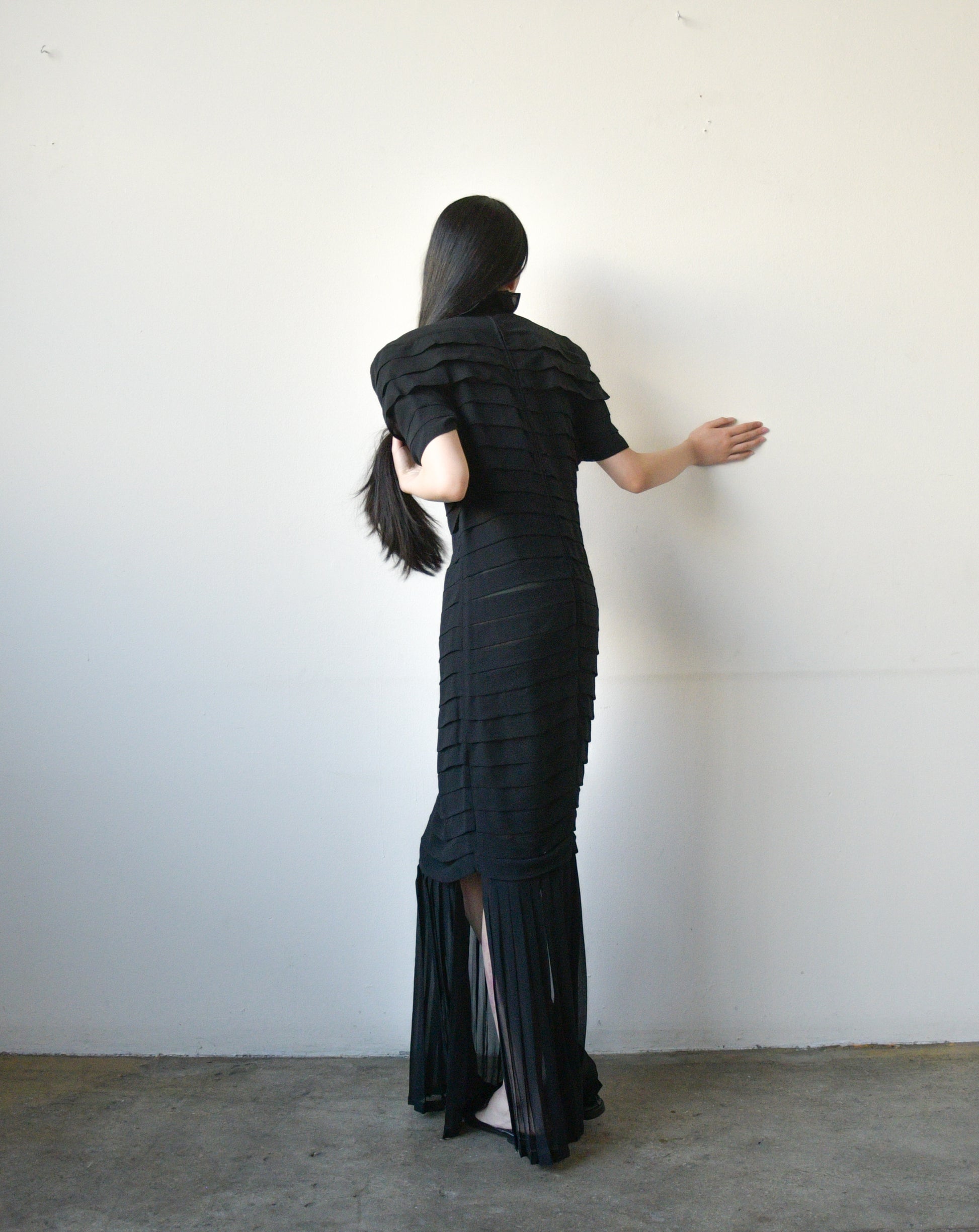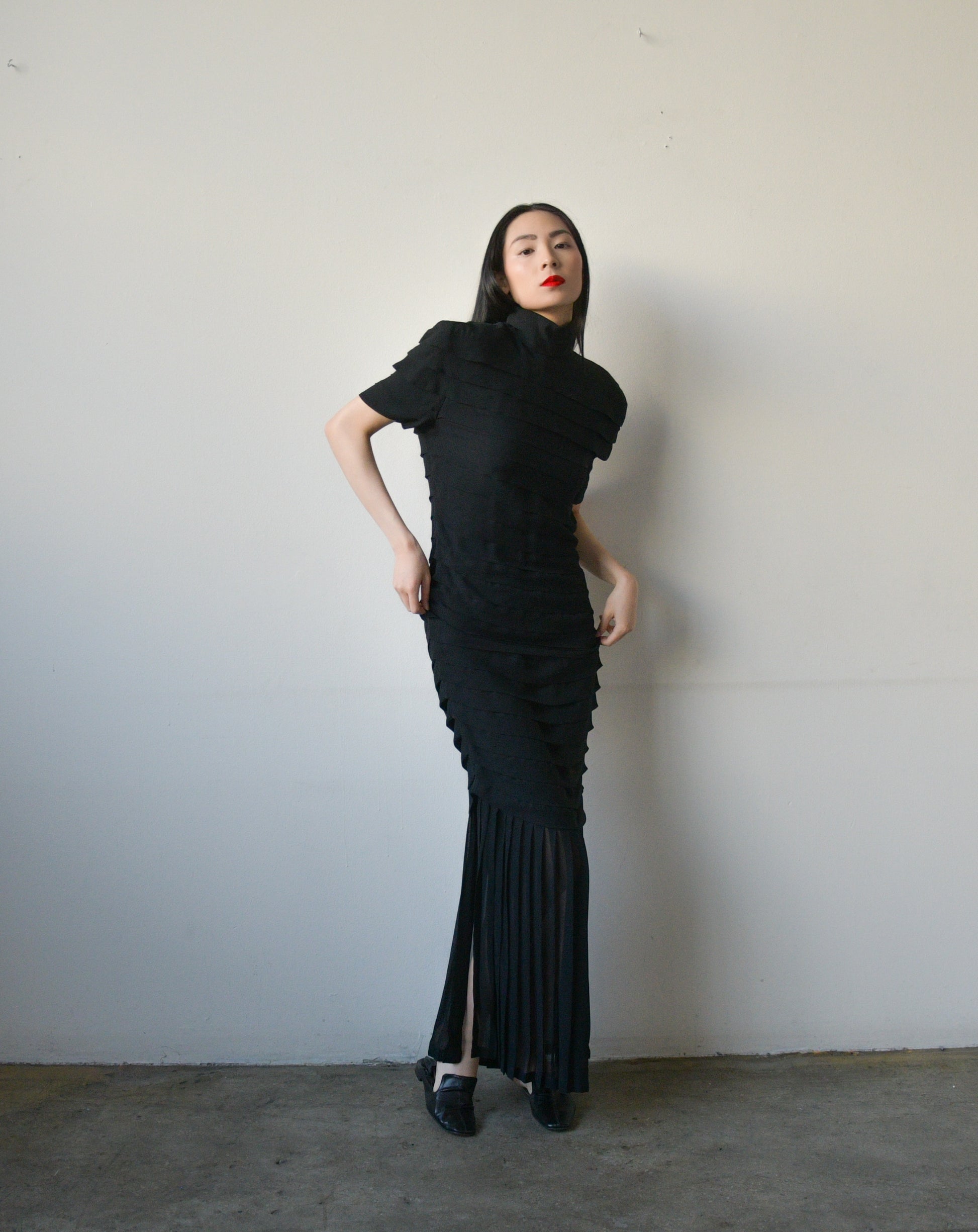 a FW 1987 black silk chiffon pleated dress. the construction of this dress is amazing and features horizontal pleating that contrasts the vertical pleating at the bottom of the dress and almost turns the body into a sculptural form. the bottom of the dress is beautiful in movement and was featured in the ad shown here and is shown in movement in the video provided. there were a few dresses designed with the same theme that season, also featured here.