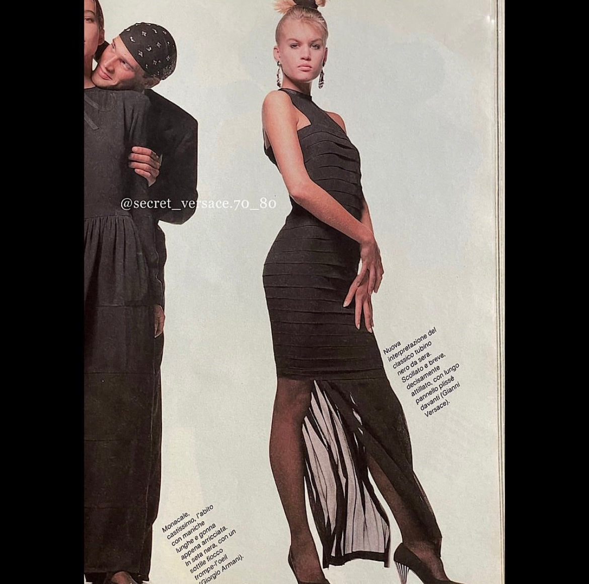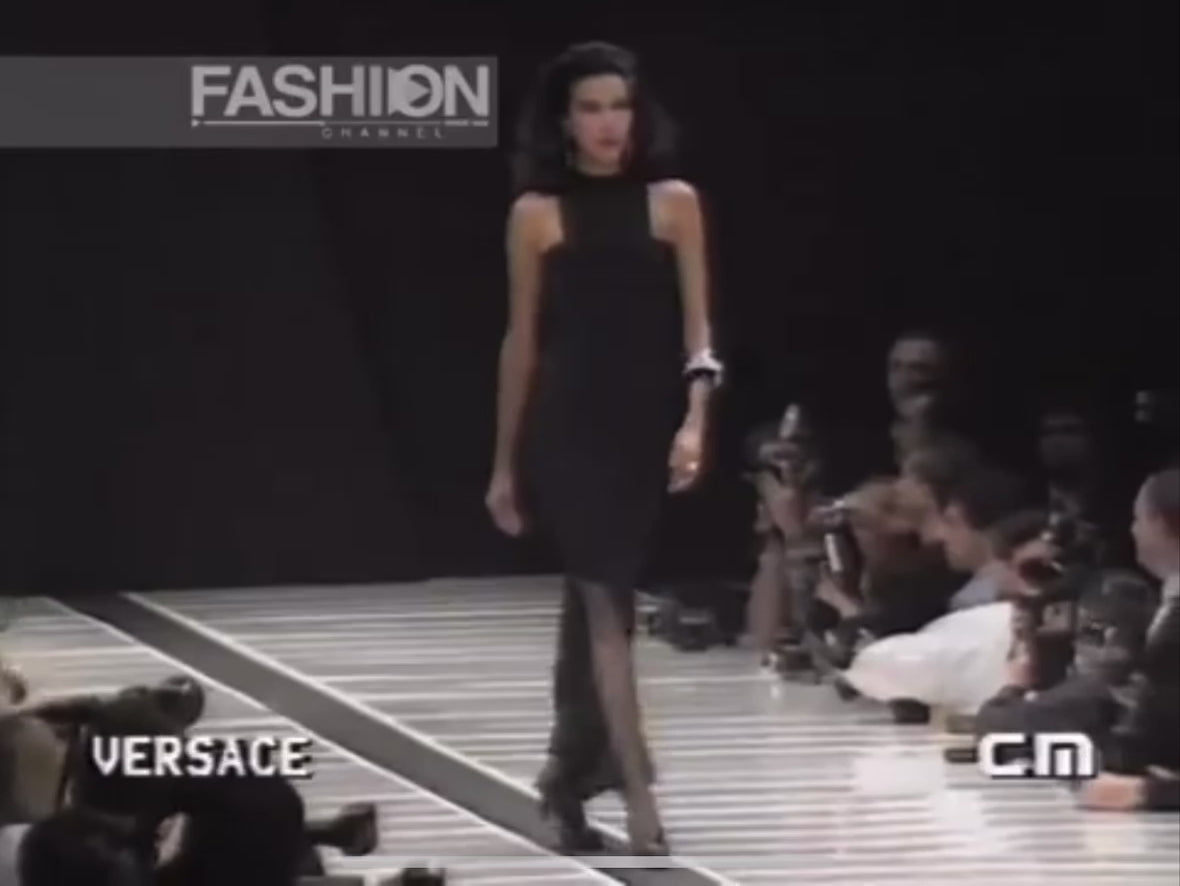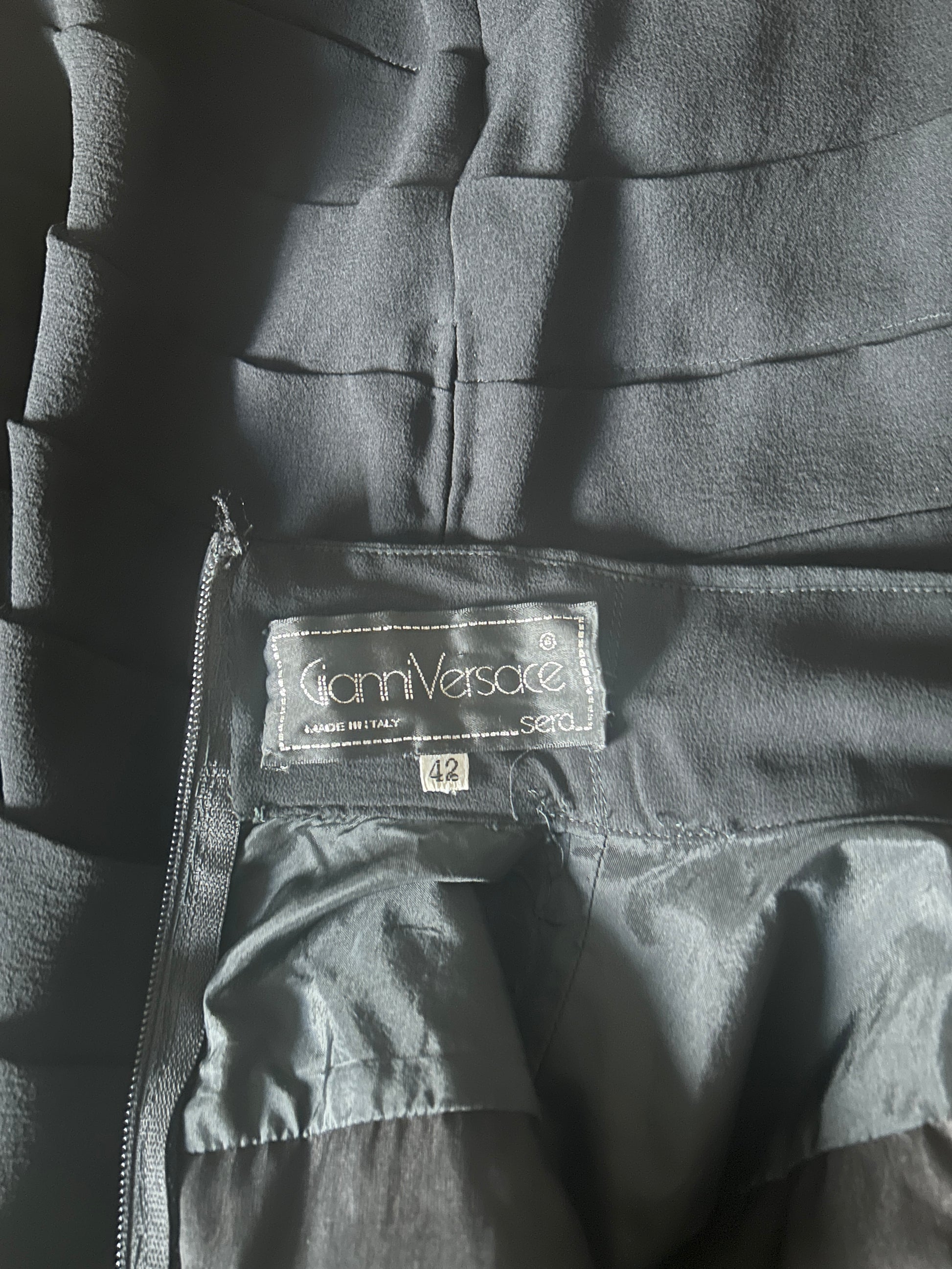 a FW 1987 black silk chiffon pleated dress. the construction of this dress is amazing and features horizontal pleating that contrasts the vertical pleating at the bottom of the dress and almost turns the body into a sculptural form. the bottom of the dress is beautiful in movement and was featured in the ad shown here and is shown in movement in the video provided. there were a few dresses designed with the same theme that season, also featured here.