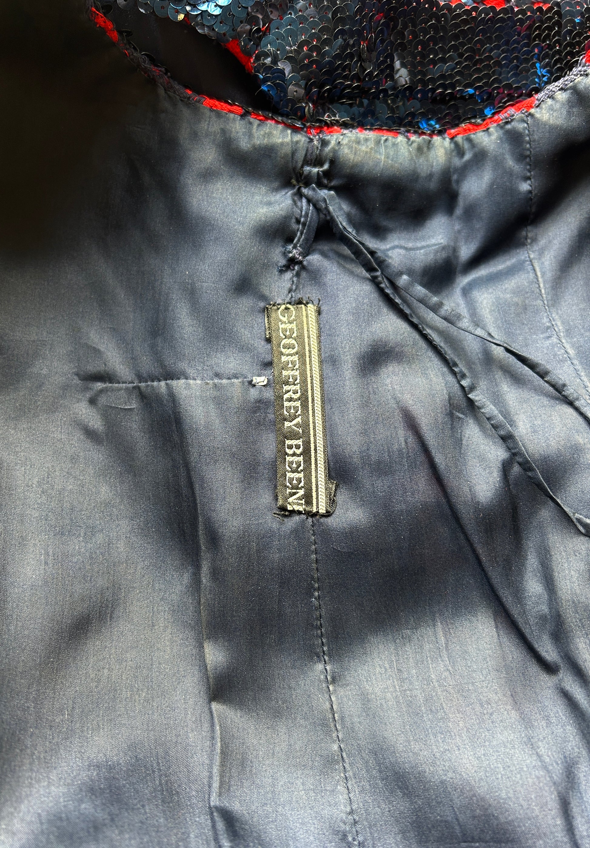 fits like a small, in excellent condition - there is some wear on some of the blue sequins and some lightened discoloration in the silk lining.