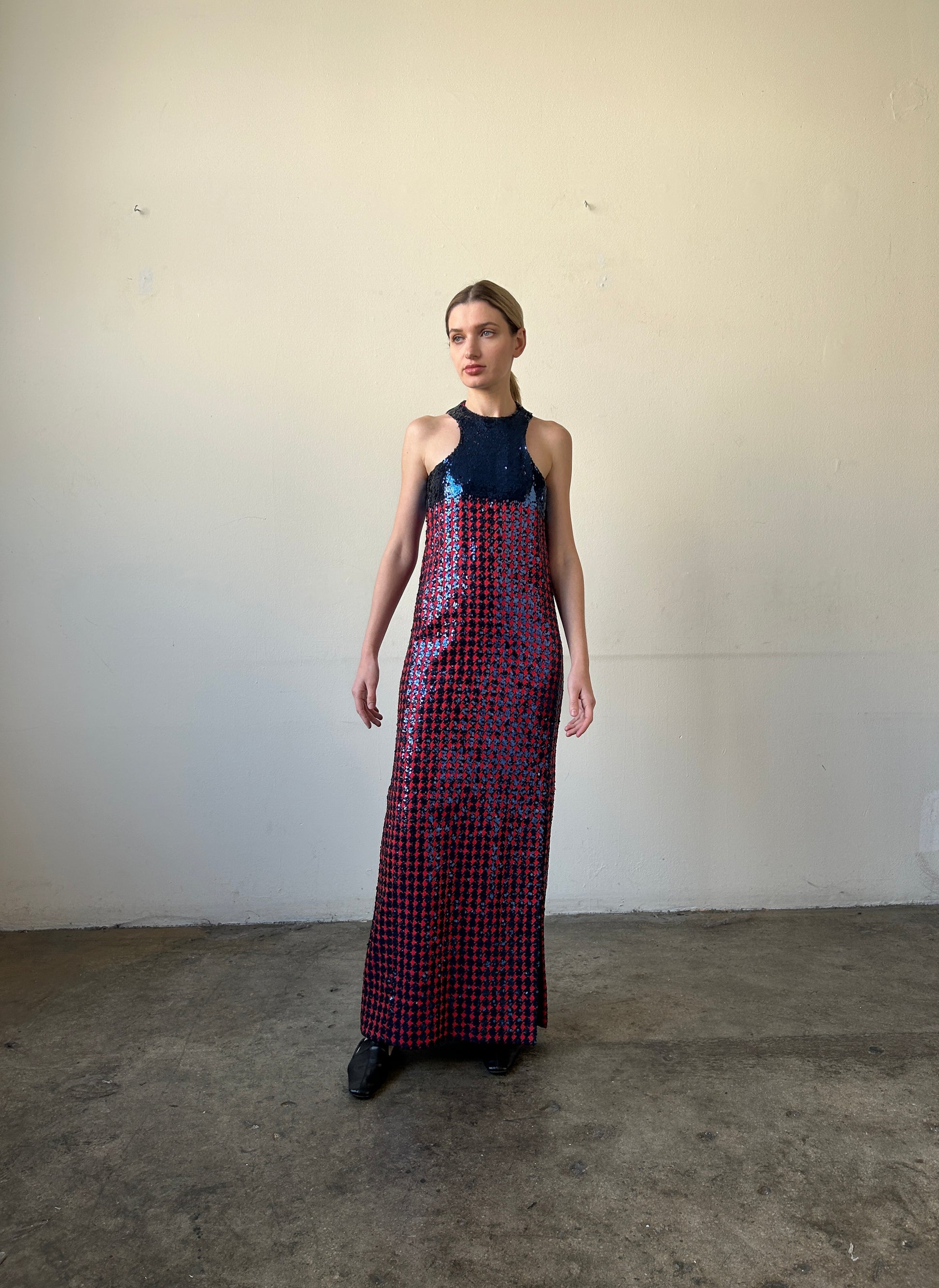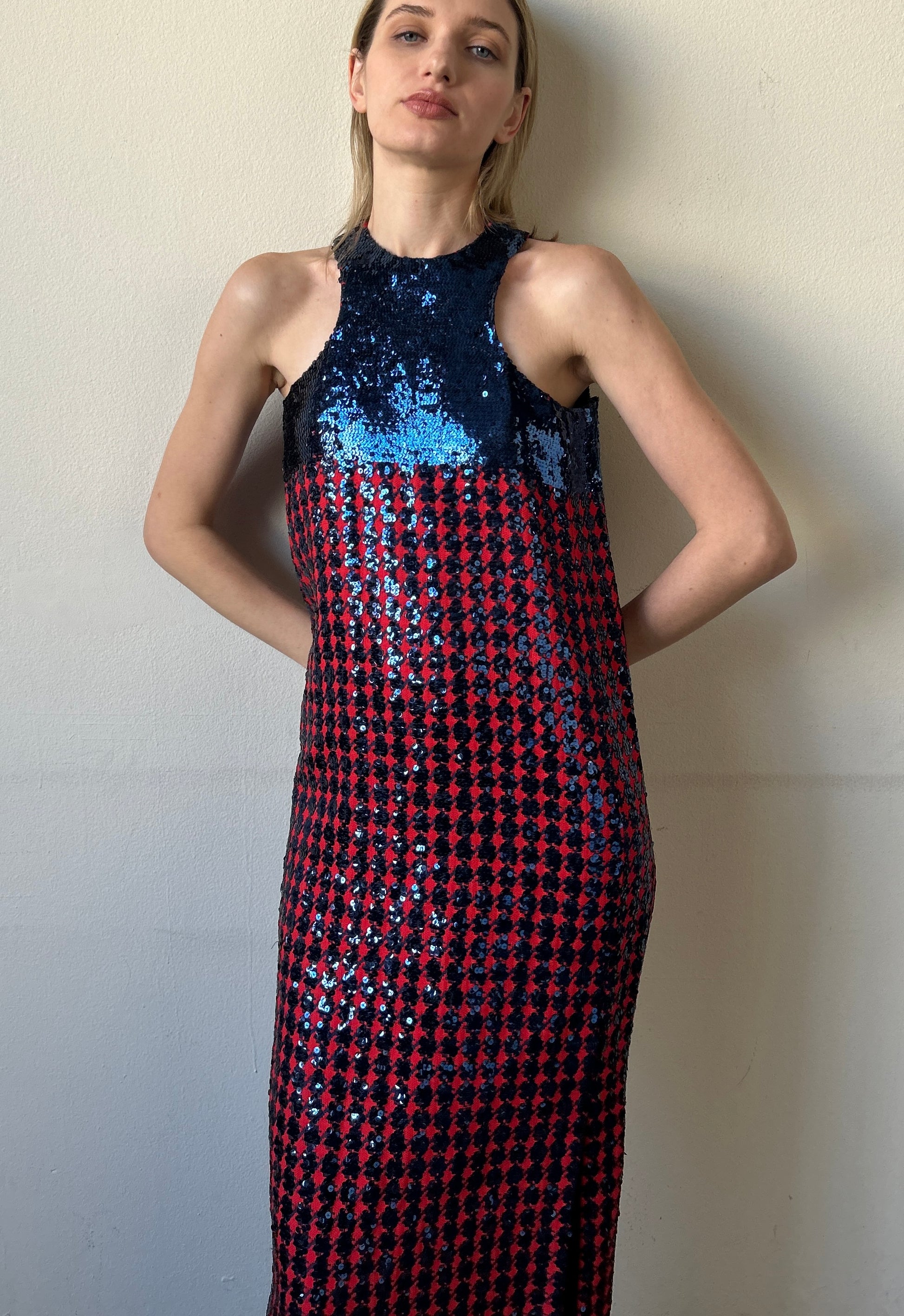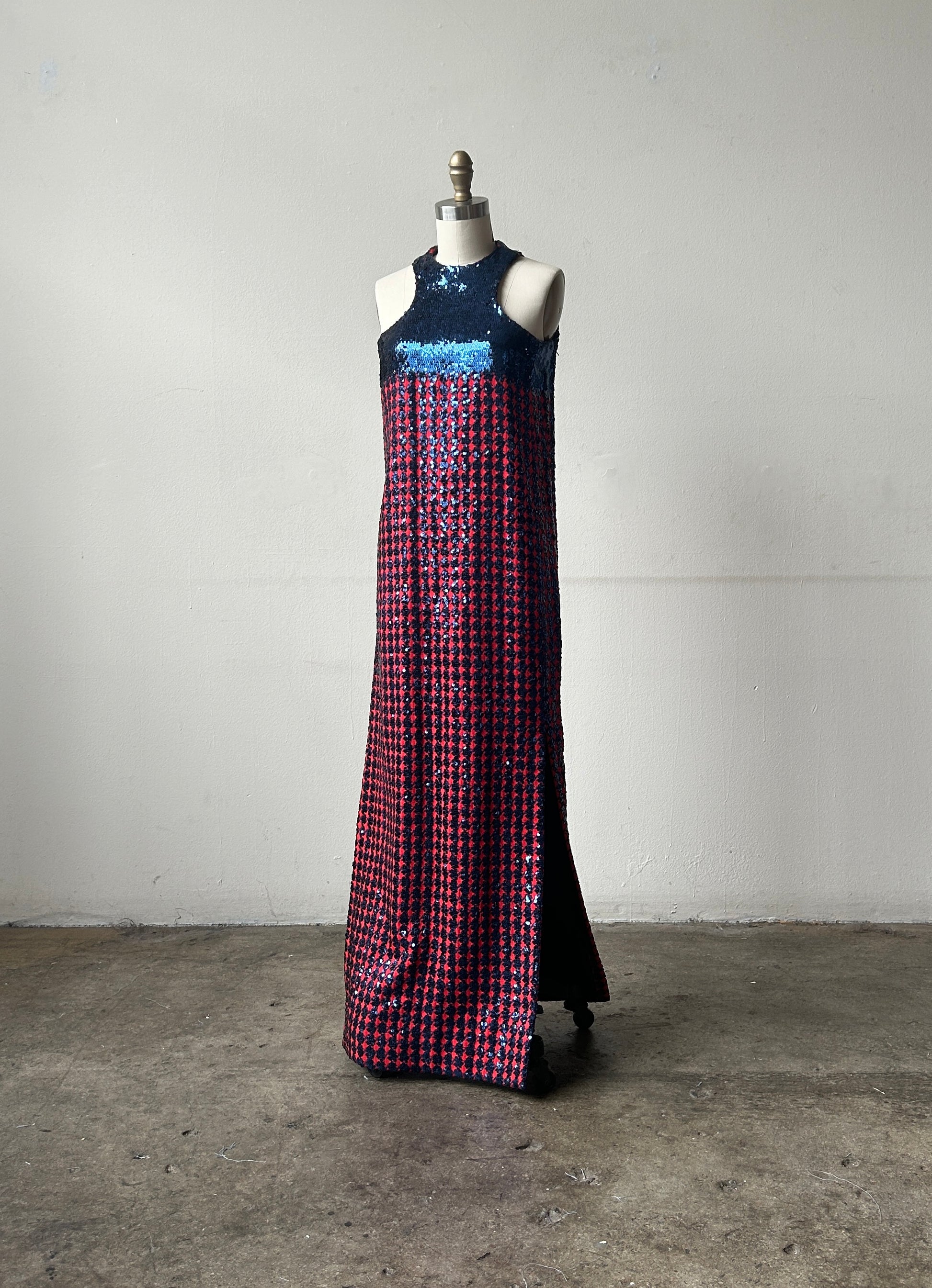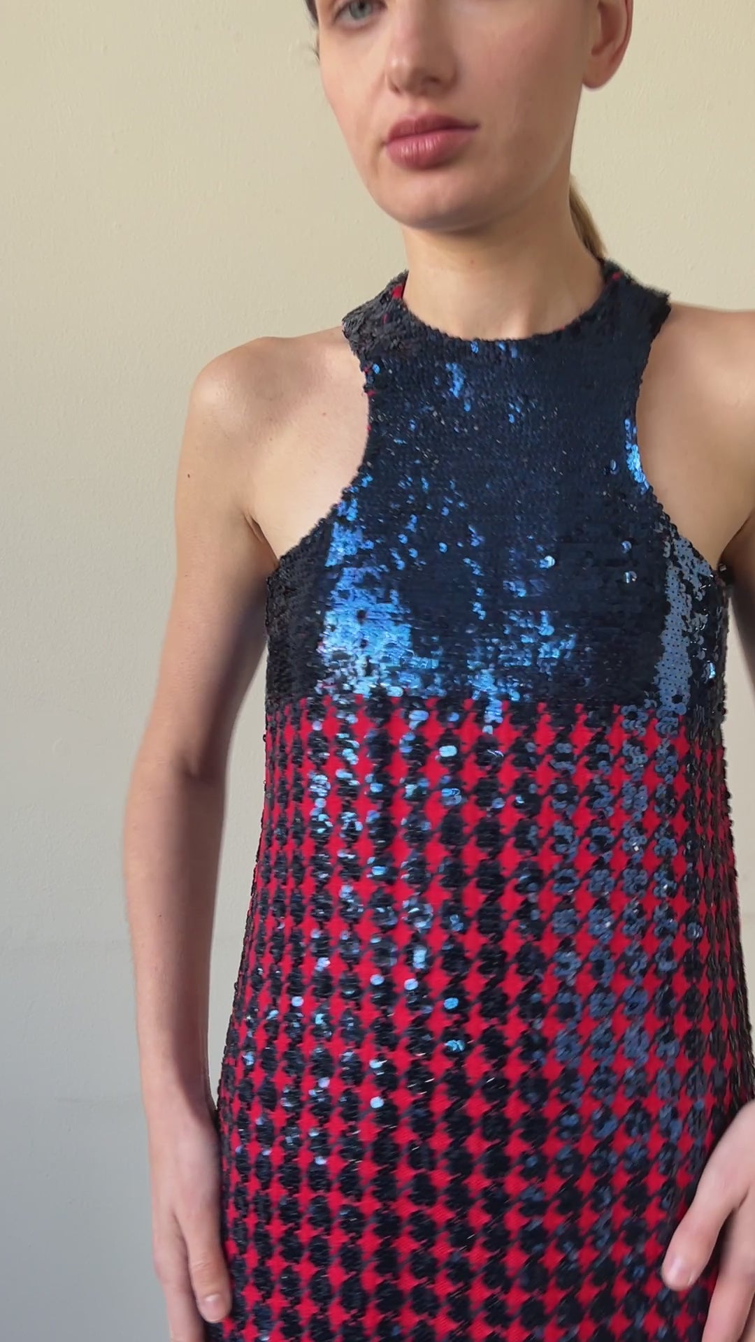 available is a rare and iconic 1960s geoffrey beene sequin houndstooth column dress. early in his career while designing experimental but massively wearable pieces, beene felt that evening wear had become too structured, "incompatible with the modern taste for freedom." this dress is very much a product of that time, with its playful take on a classic houndstooth pattern by adding sequins for shine and texture, as well as a sporty racerback bodice that contradicts the typical "evening gown" of that era and was likely revolutionary for that time. attached are also photos of his famous football jersey gowns from that era that continue with the sporty motif. an important piece of fashion history for the right collector.