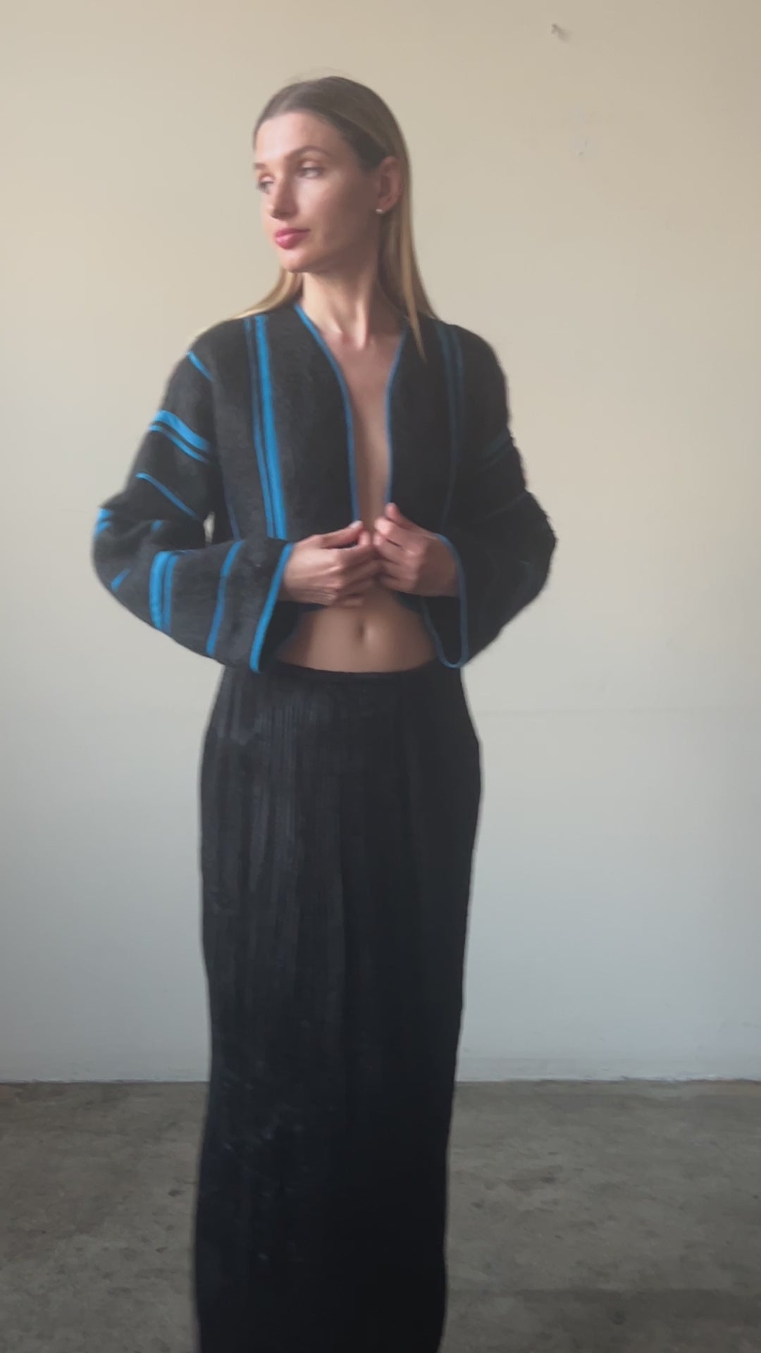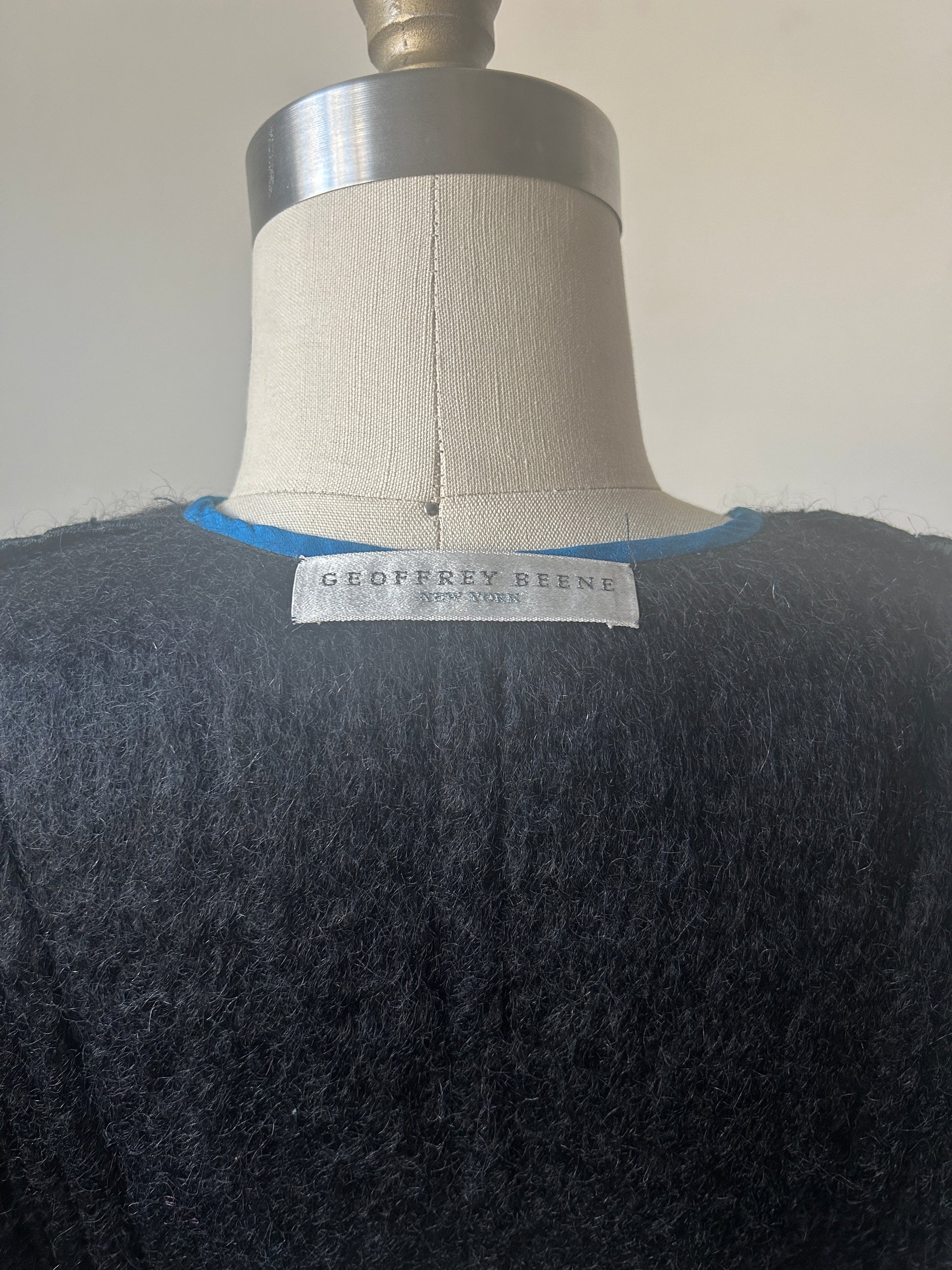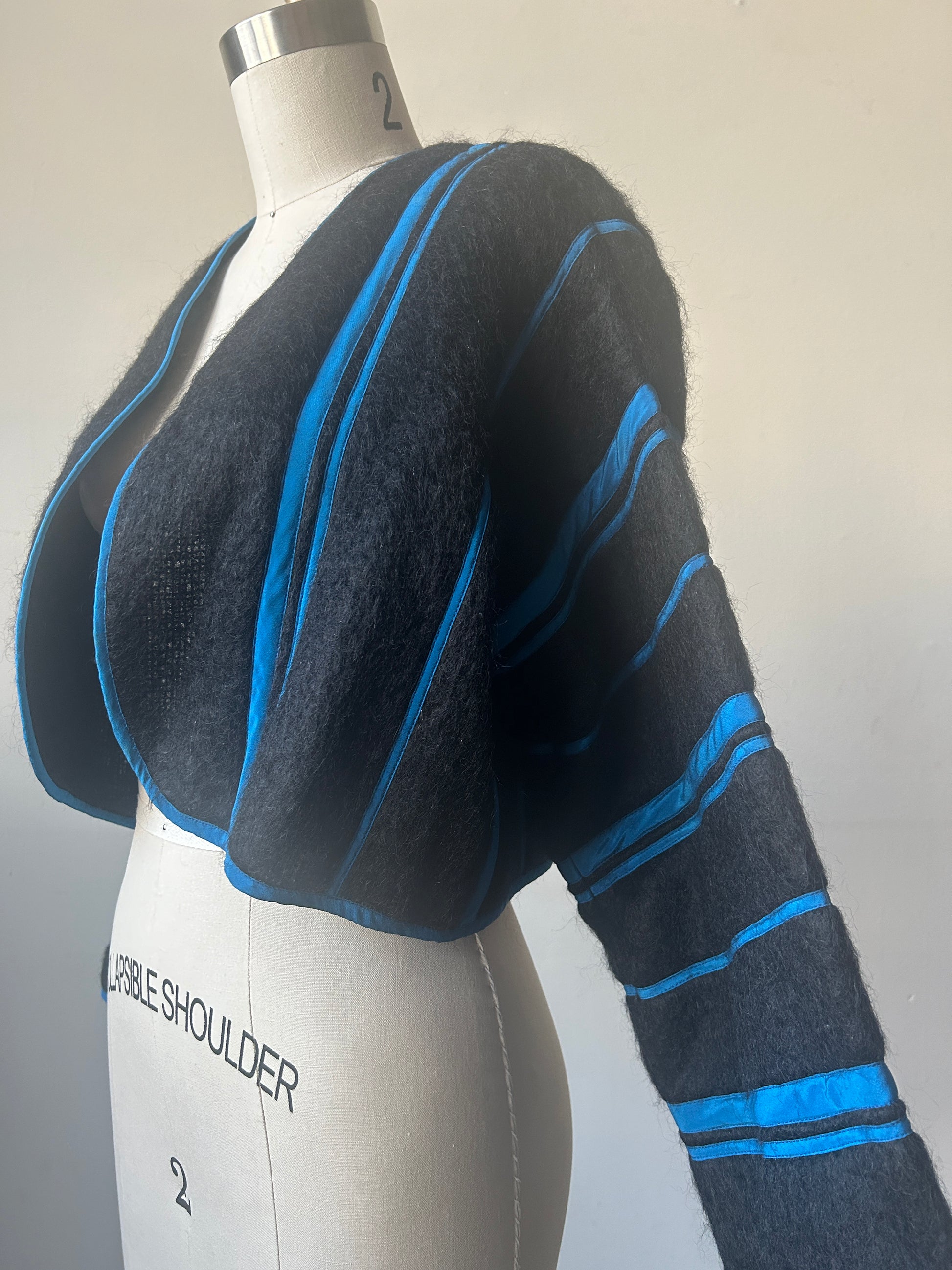 geoffrey beene 1980s black and blue striped mohair cropped bolero jacket. black mohair with blue silk strips. the jacket has a minimalist kimono feel due to the shape of the wide sleeves. no closures.