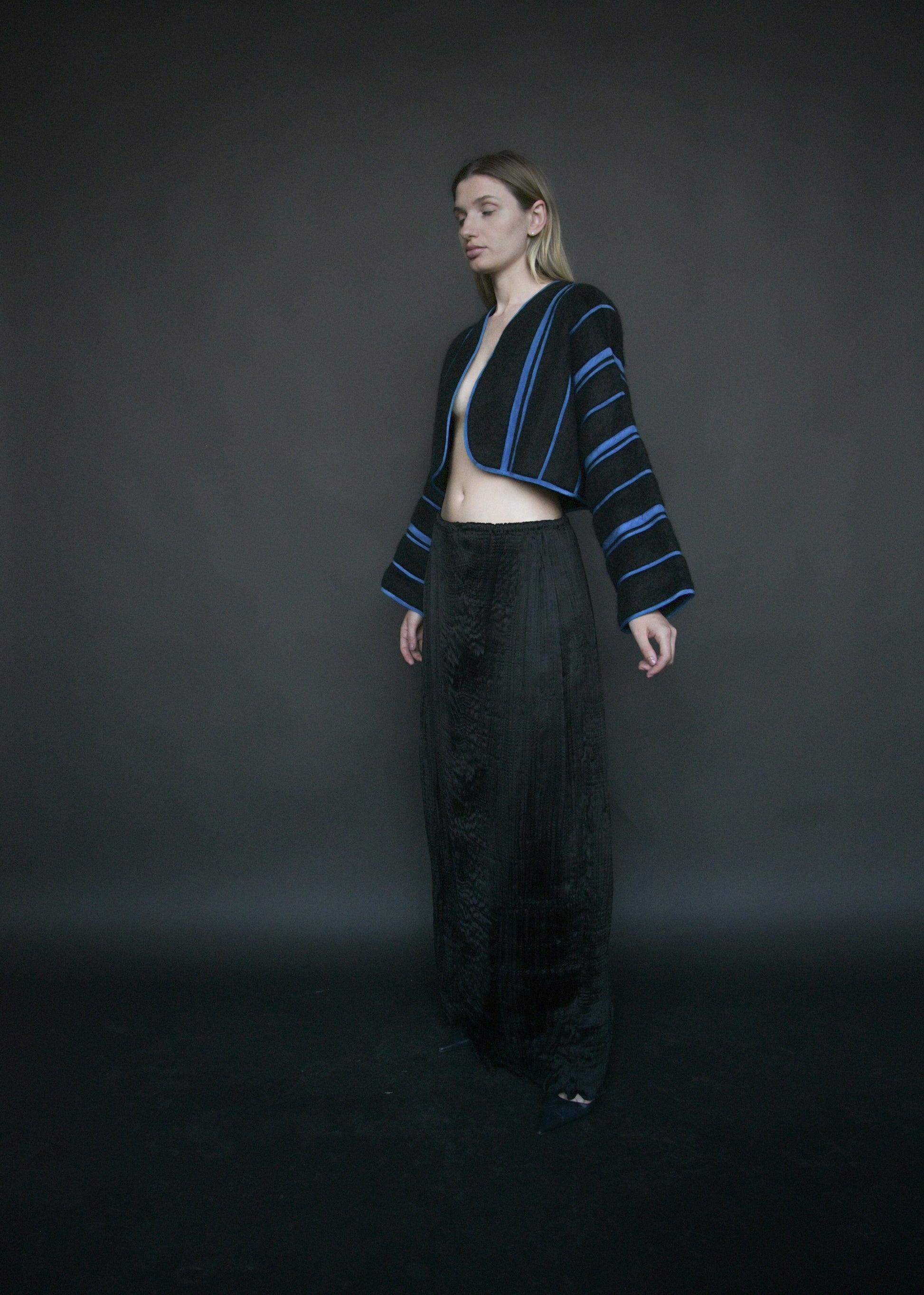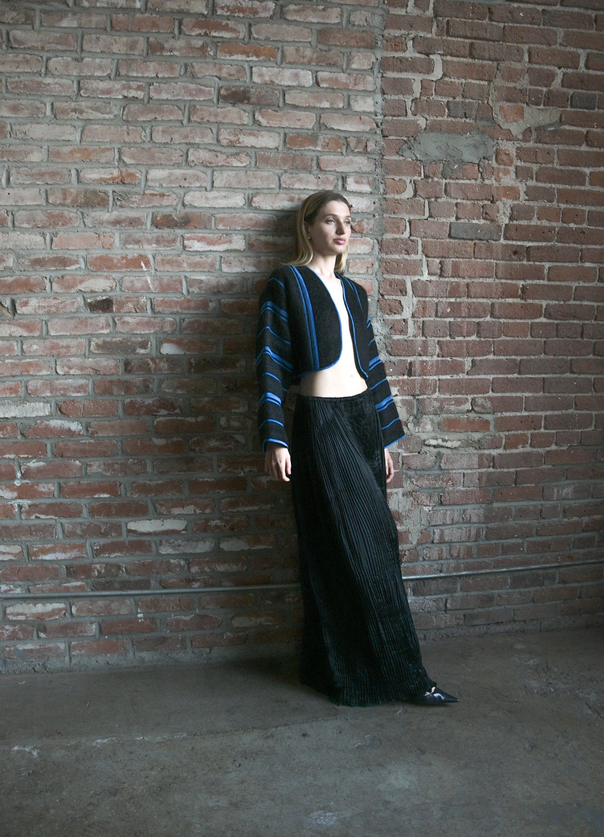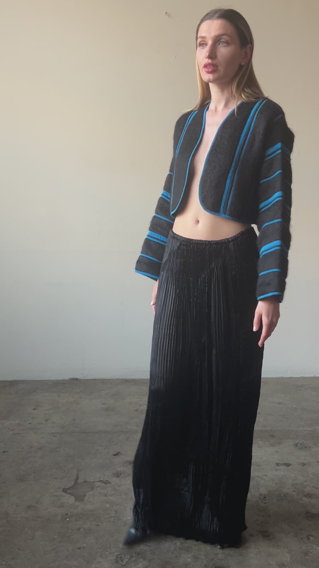 geoffrey beene 1980s black and blue striped mohair cropped bolero jacket. black mohair with blue silk strips. the jacket has a minimalist kimono feel due to the shape of the wide sleeves. no closures.