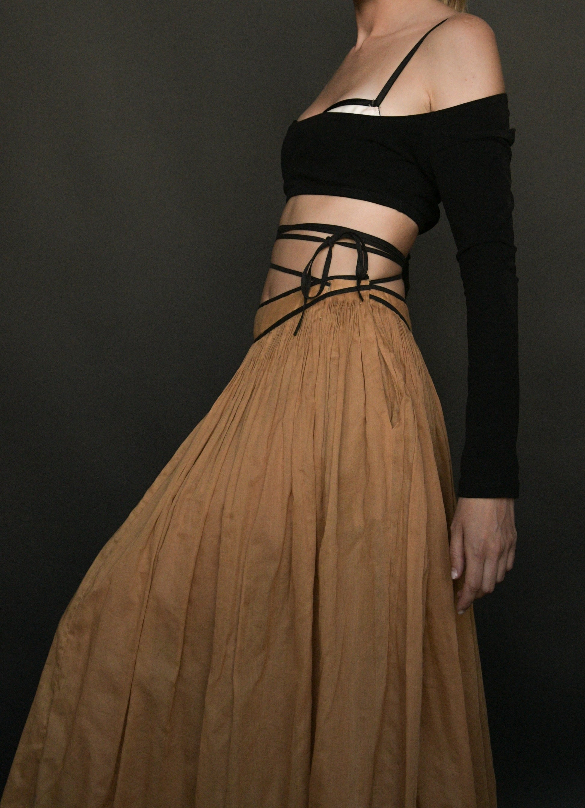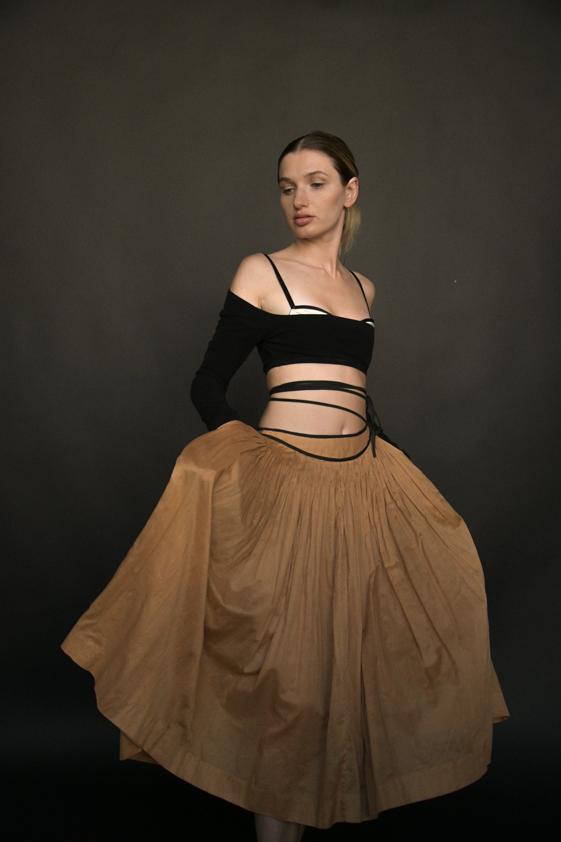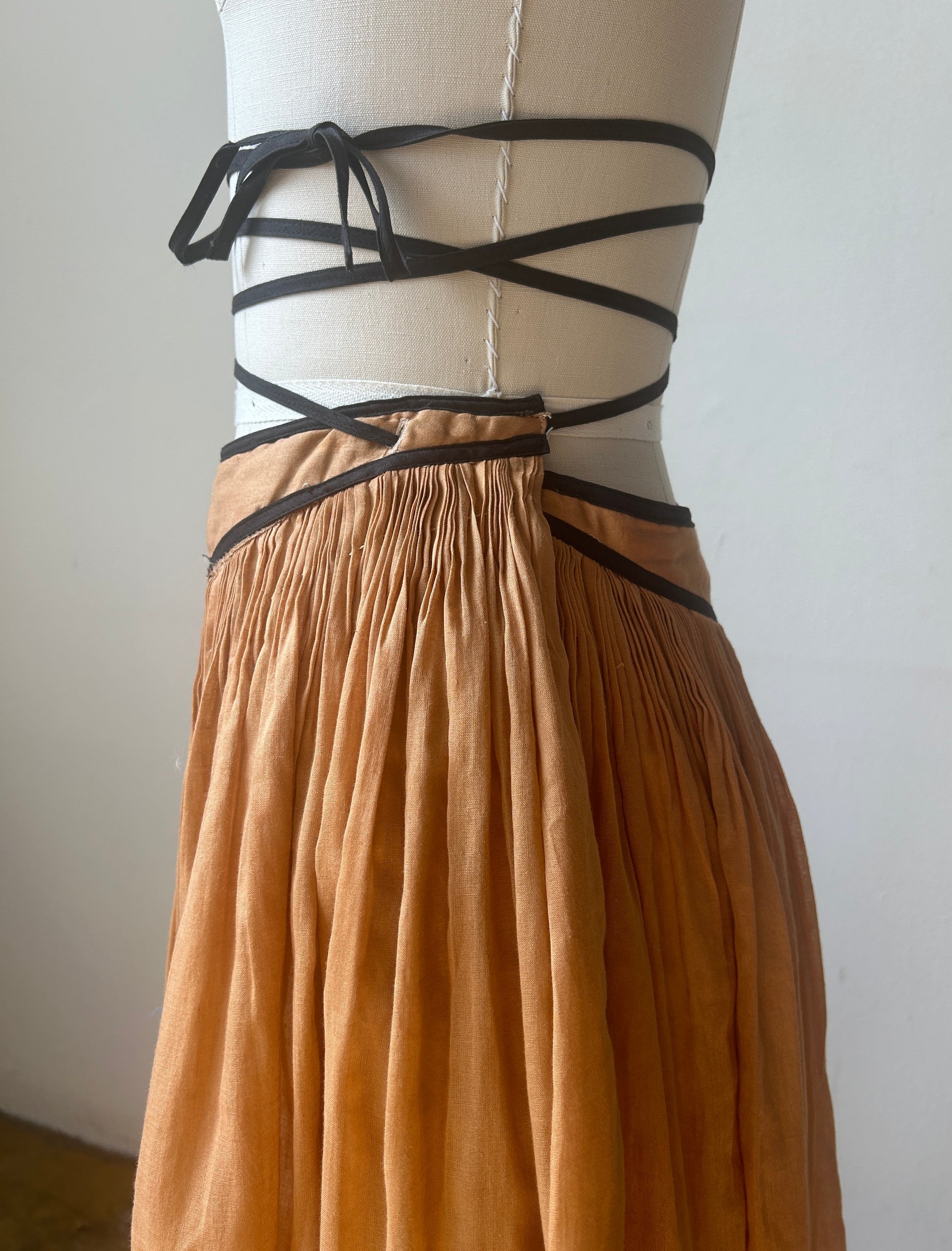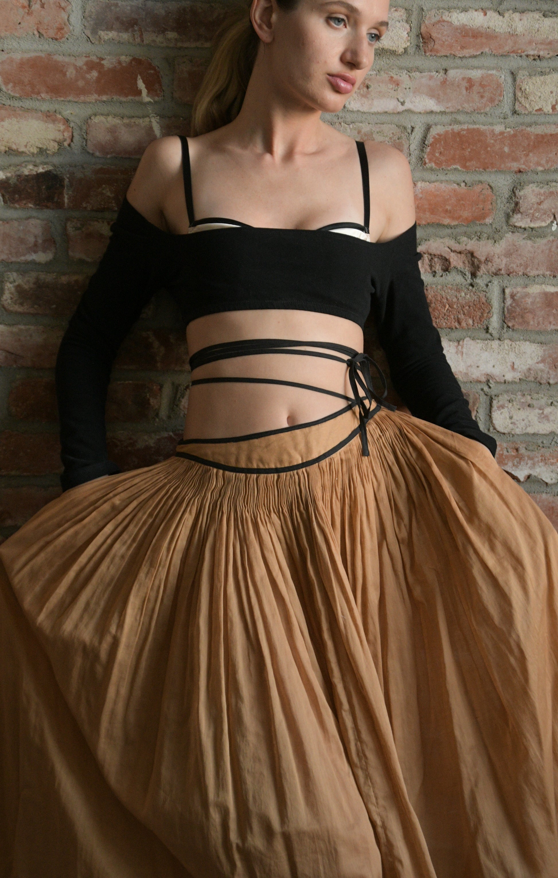 geoffrey beene 1980s toffee and black cotton midi skirt with distinctive wraparound tie (extra long to wrap around the waist a few times), hand pleating at the skirt. pockets at waist, unlined.