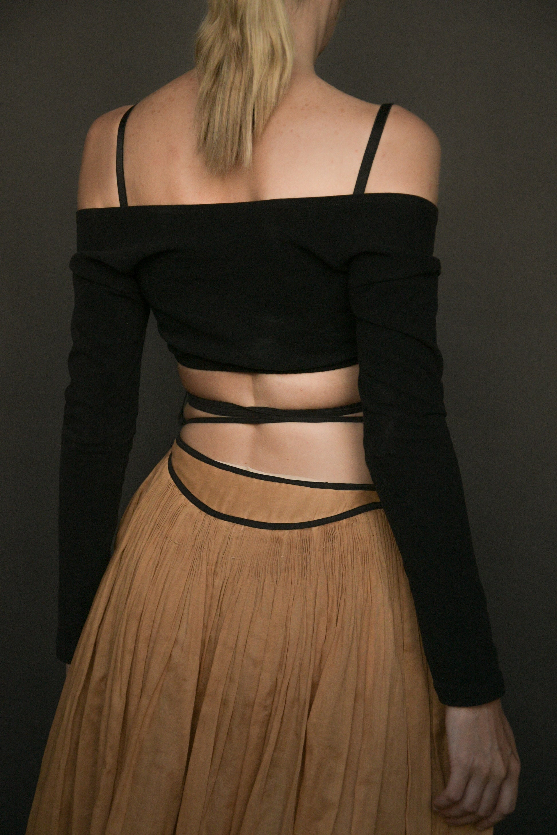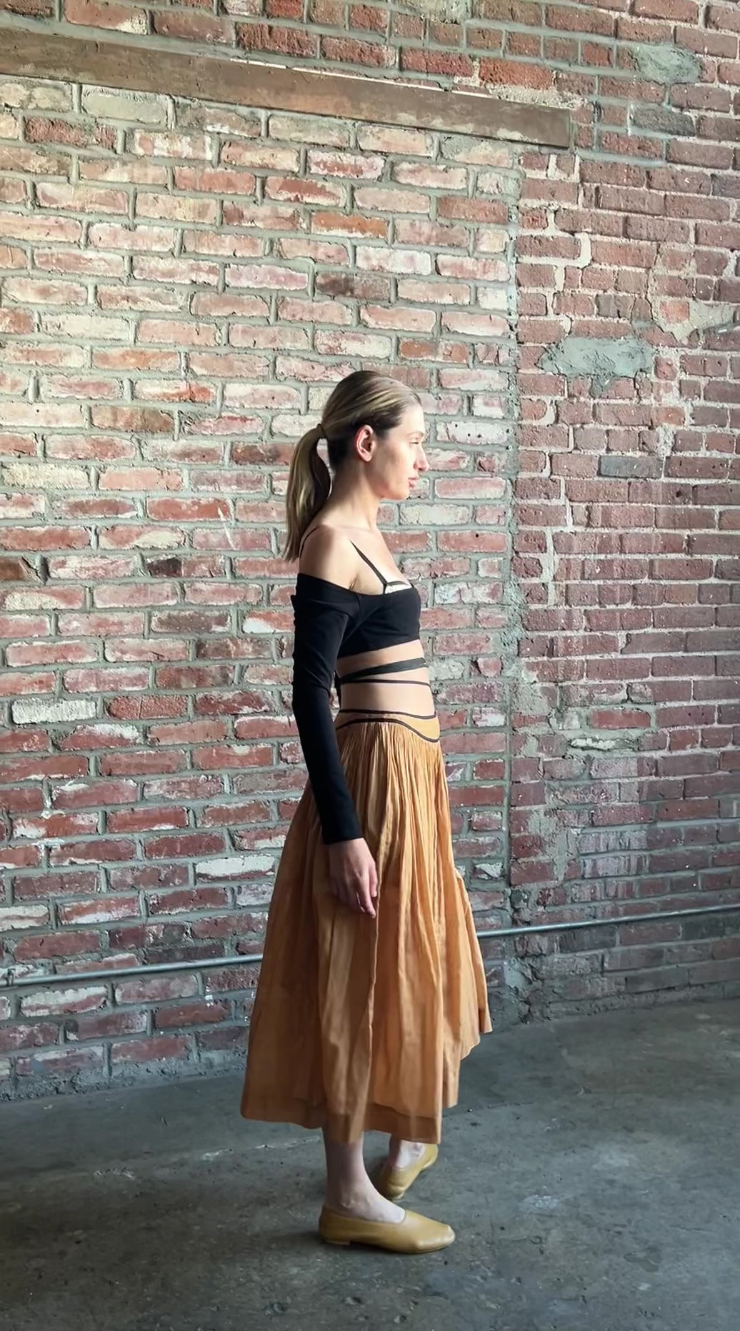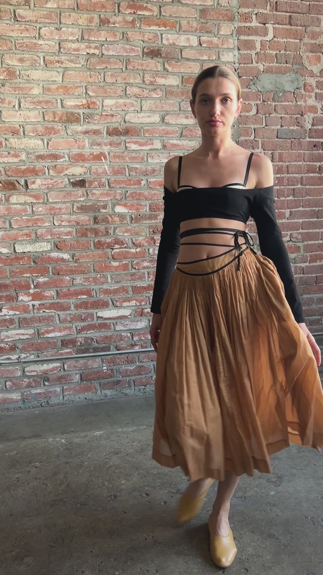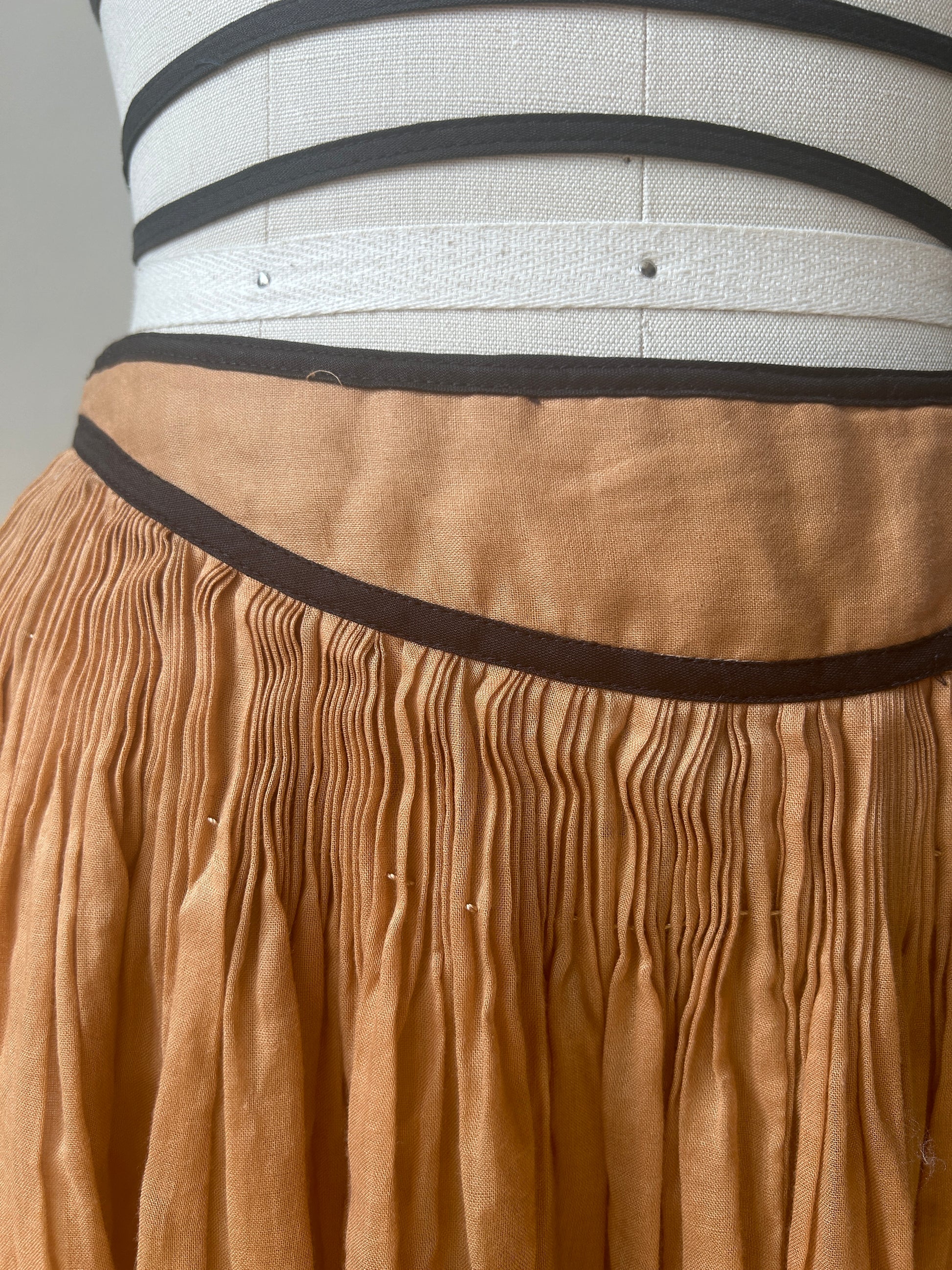 geoffrey beene 1980s toffee and black cotton midi skirt with distinctive wraparound tie (extra long to wrap around the waist a few times), hand pleating at the skirt. pockets at waist, unlined.