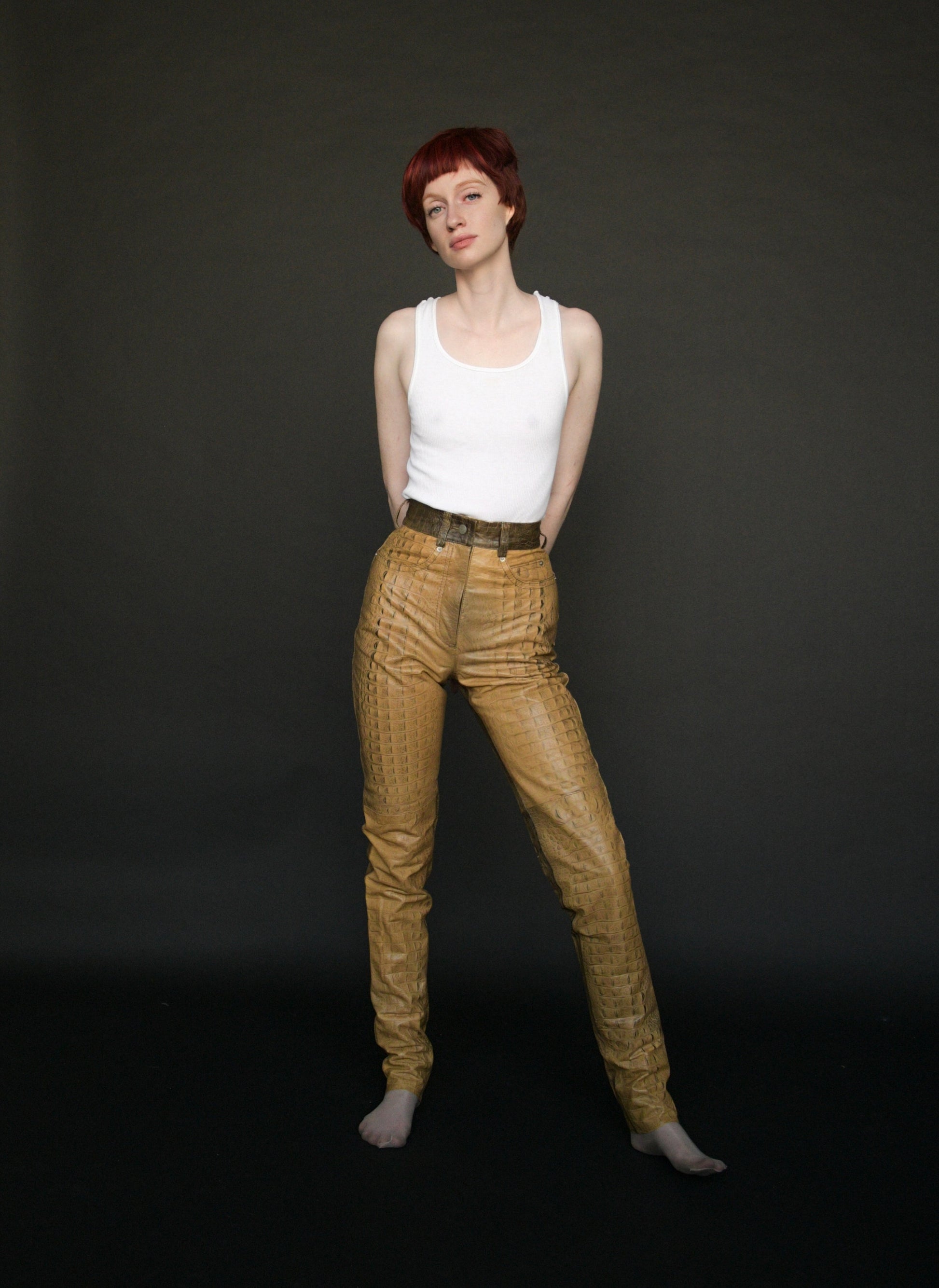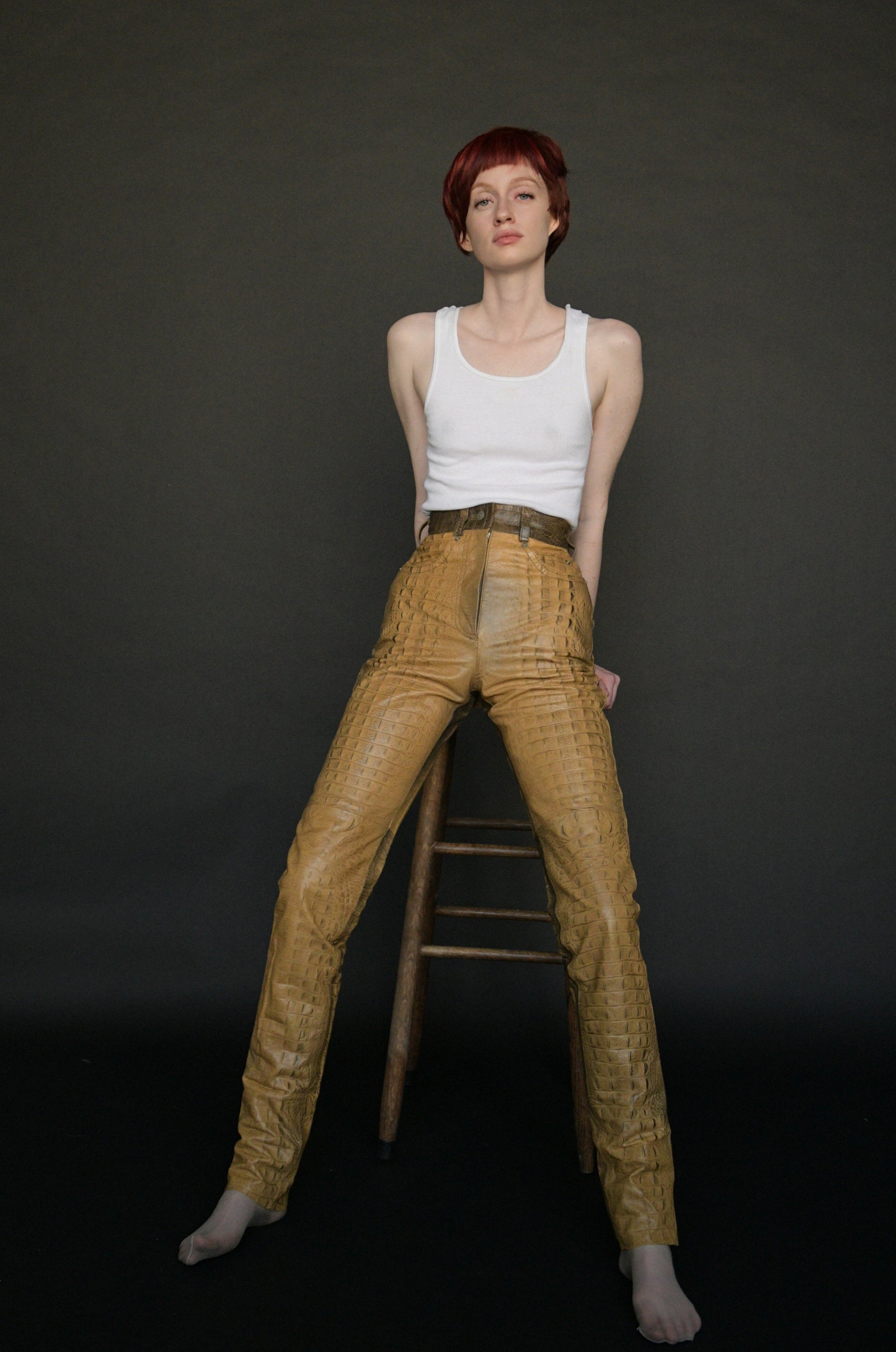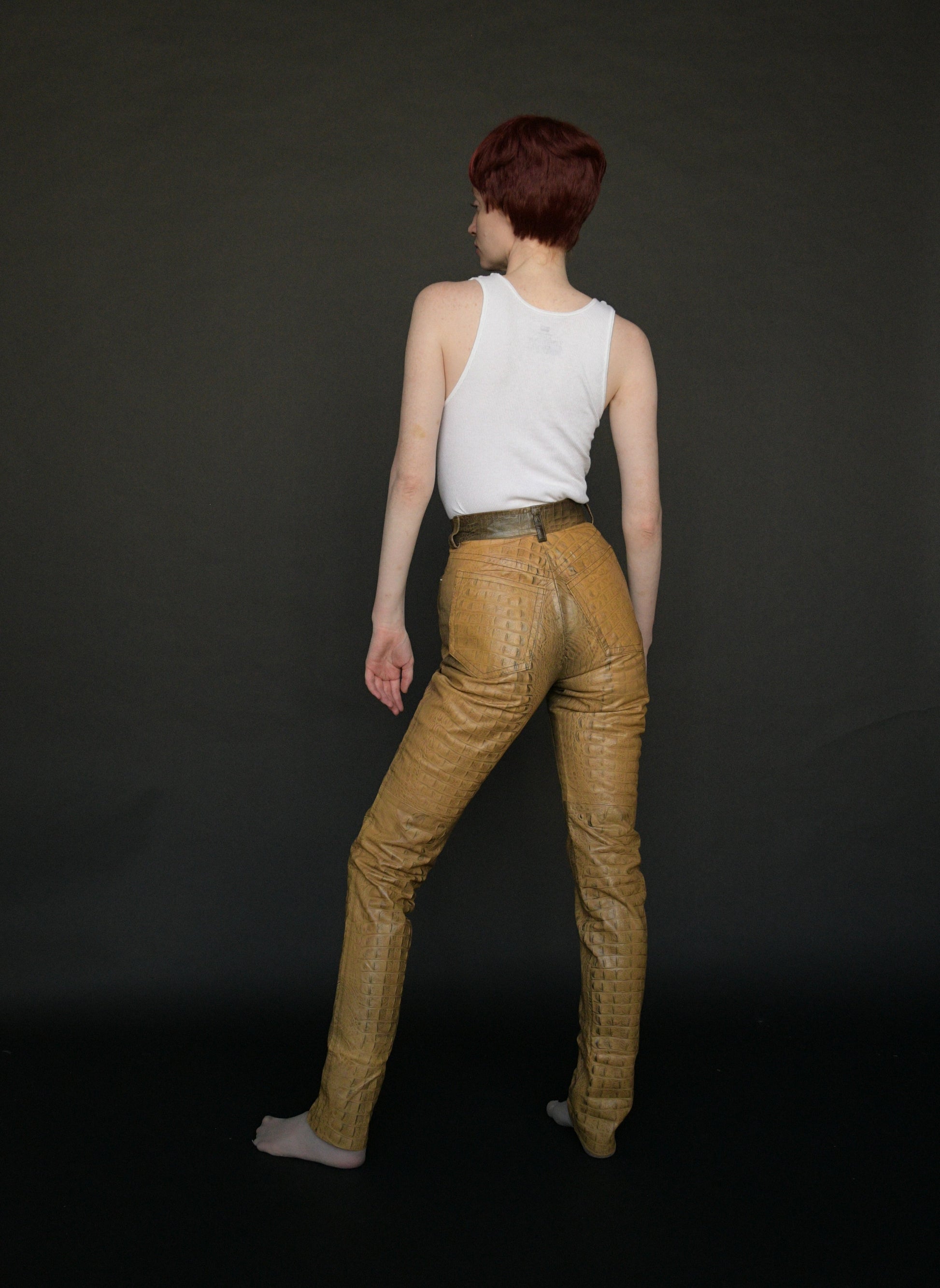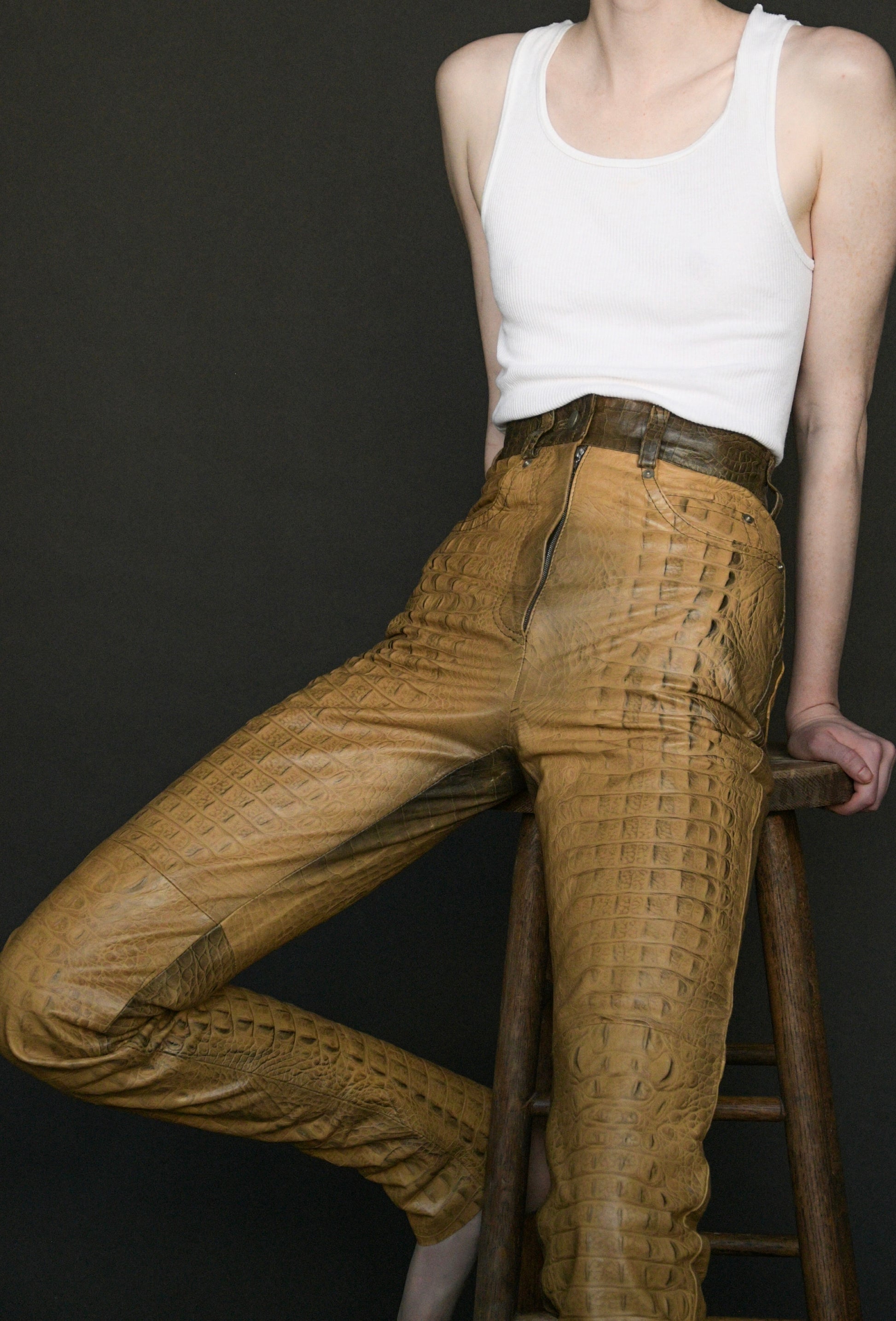 gianfranco ferre croc embossed tapered napa leather pants. (amazing raised embossed pattern - please see last photo). five pocket styling with zip and button closure. high rise and tapered leg-- amazing fit for the right person. unlined.