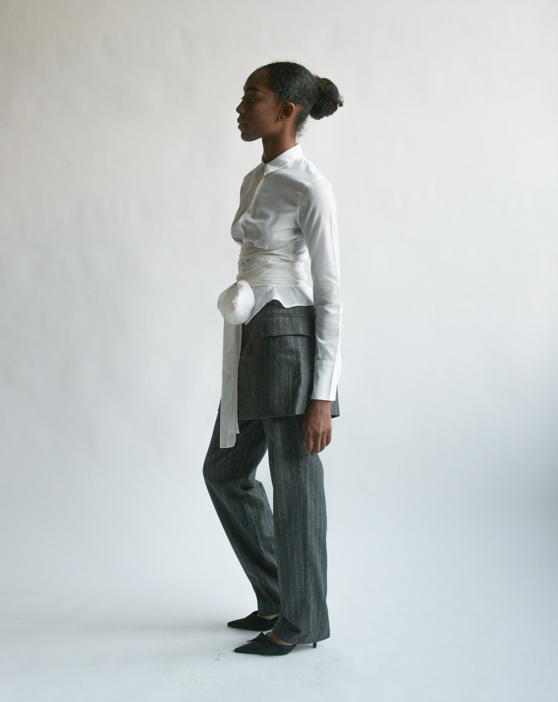 gigli white cotton button down shirt with unique wrap-around cummerbund sash. can be wrapped a variety of ways.