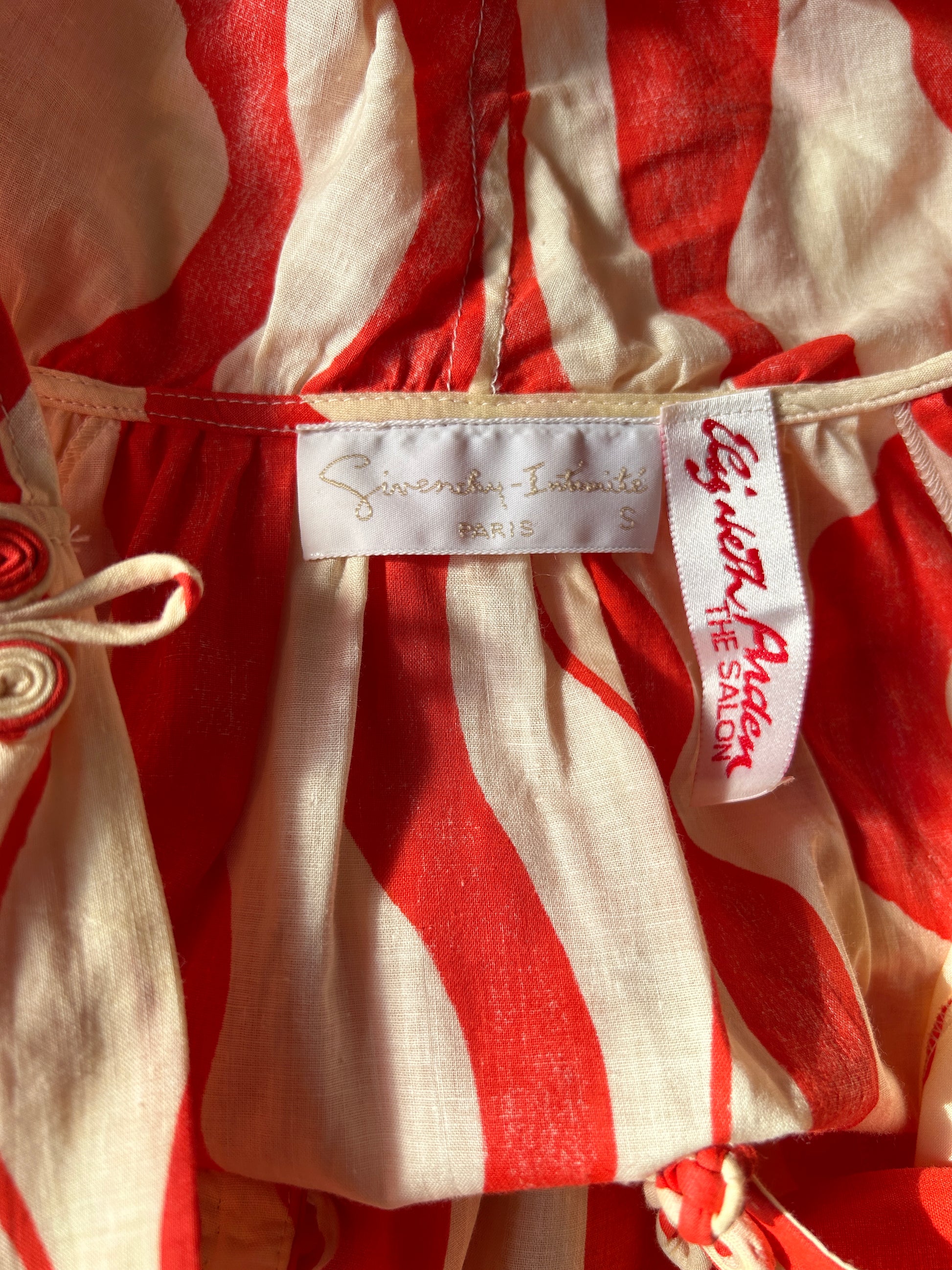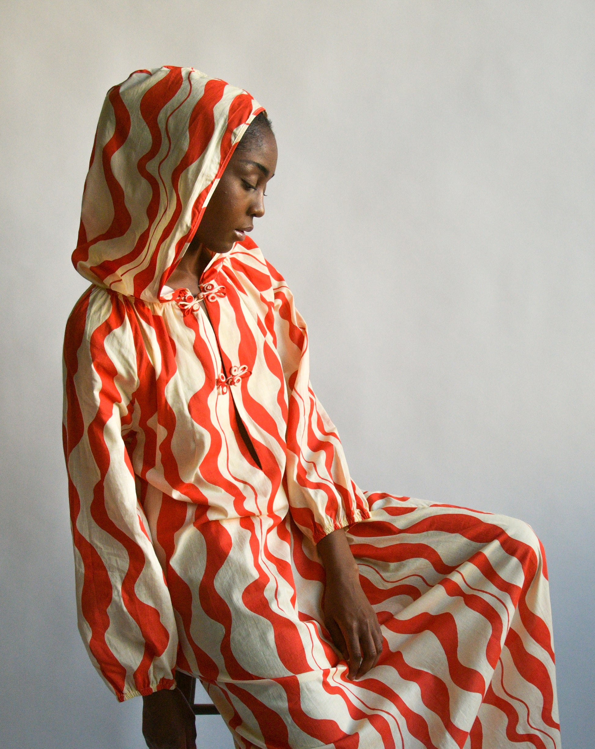 at a certain point in life, nothing says "chic" more than comfort and ease in a good caftan, and especially a rare vintage caftan. this is a great 1970s givenchy cotton caftan with a standout red print and oversized hood, slightly fuller sleeves, frog button closures, and pockets. chic, timeless and easy to wear.