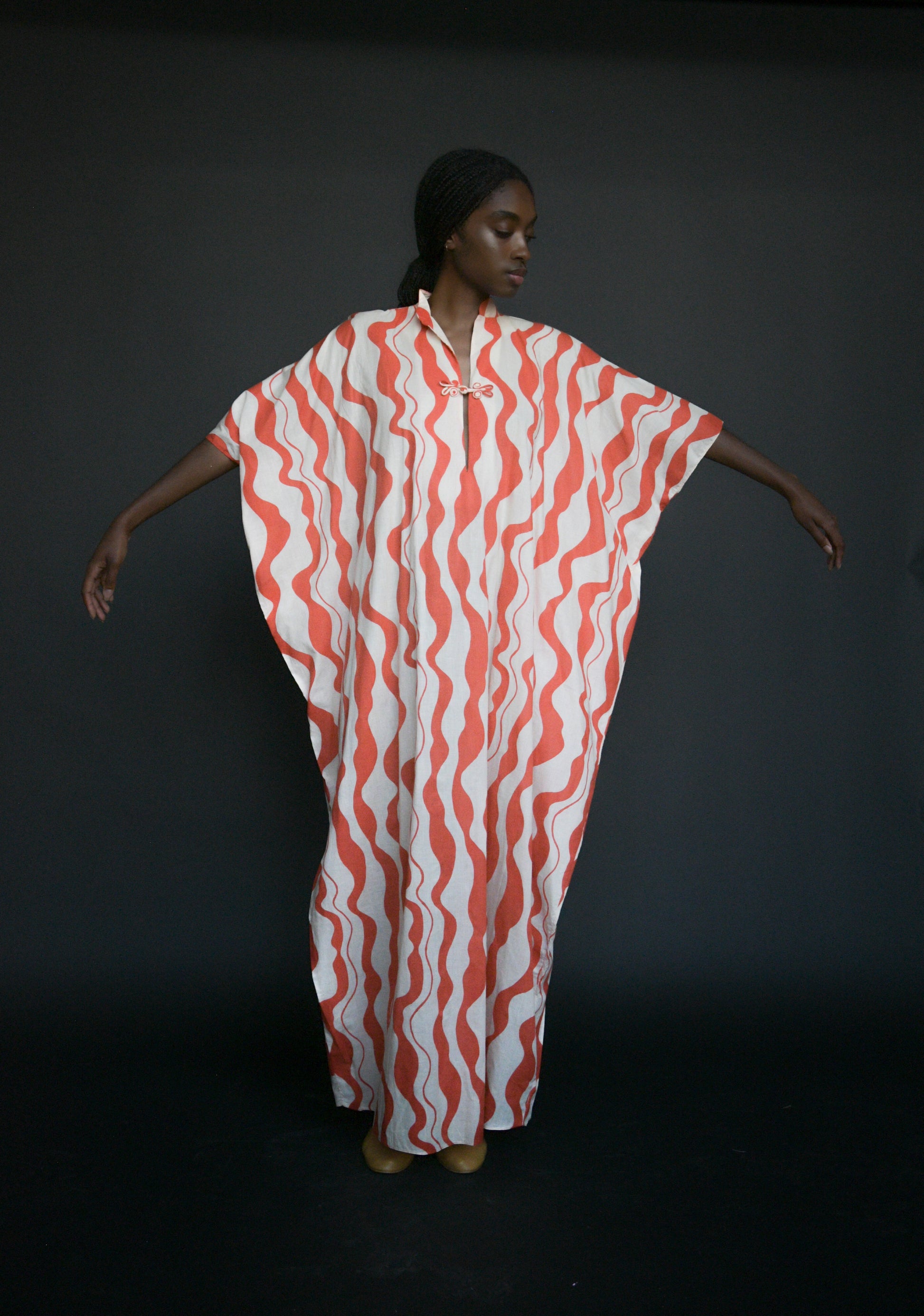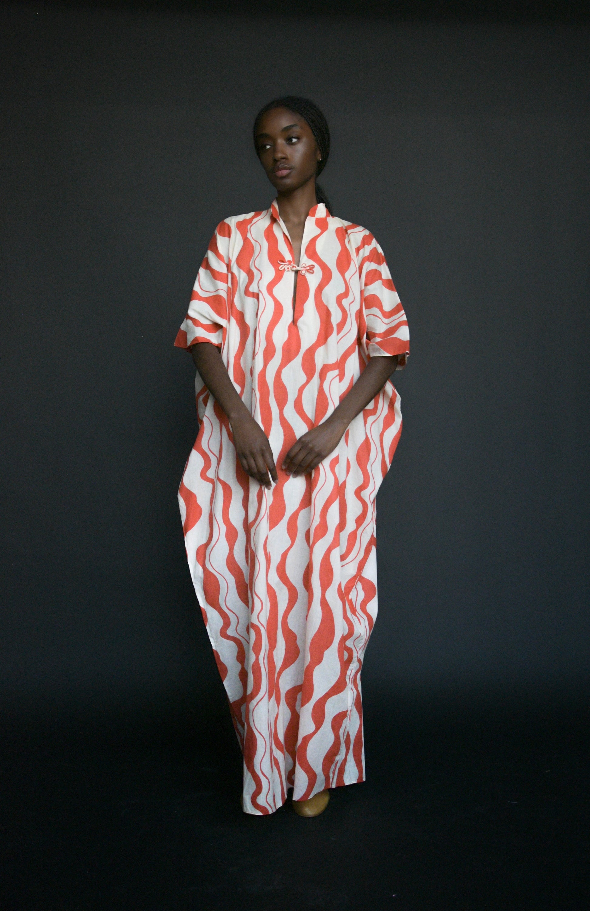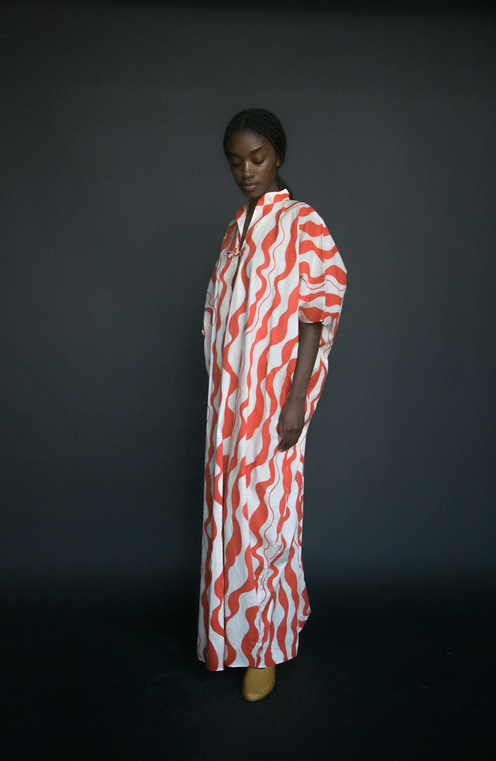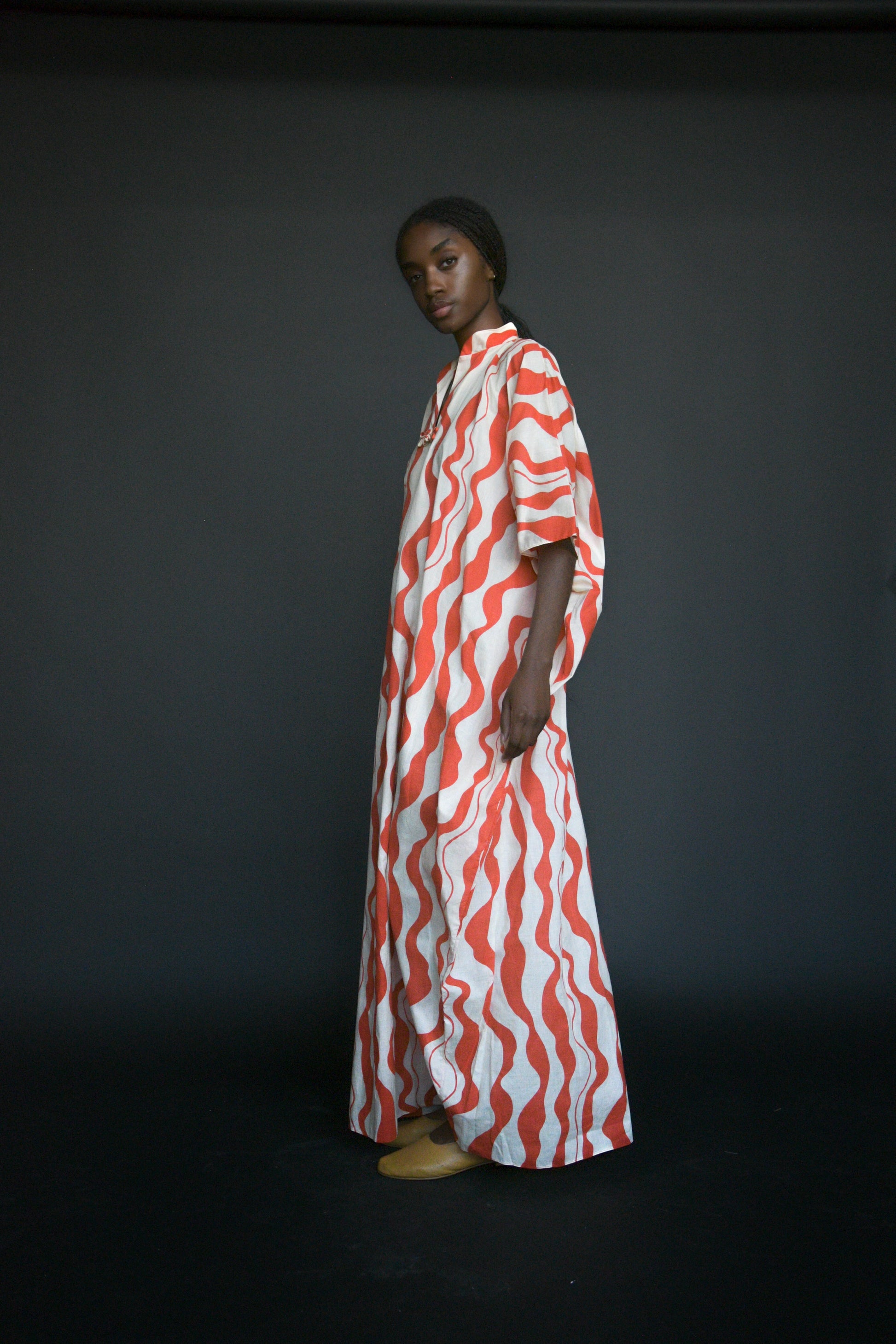 a 1970s givenchy cotton caftan with red and white bold print. stand up collar with frog closure at bust.
