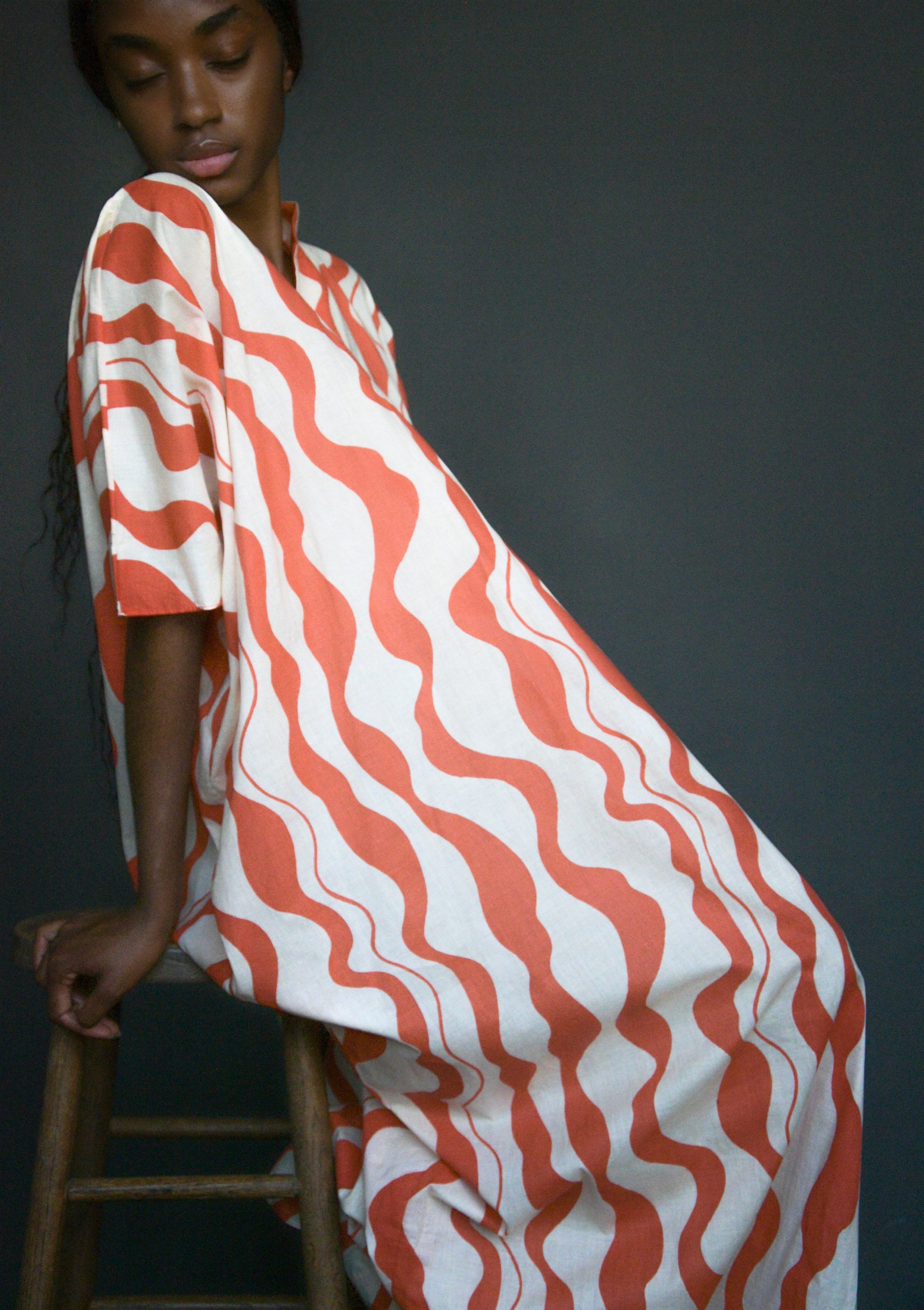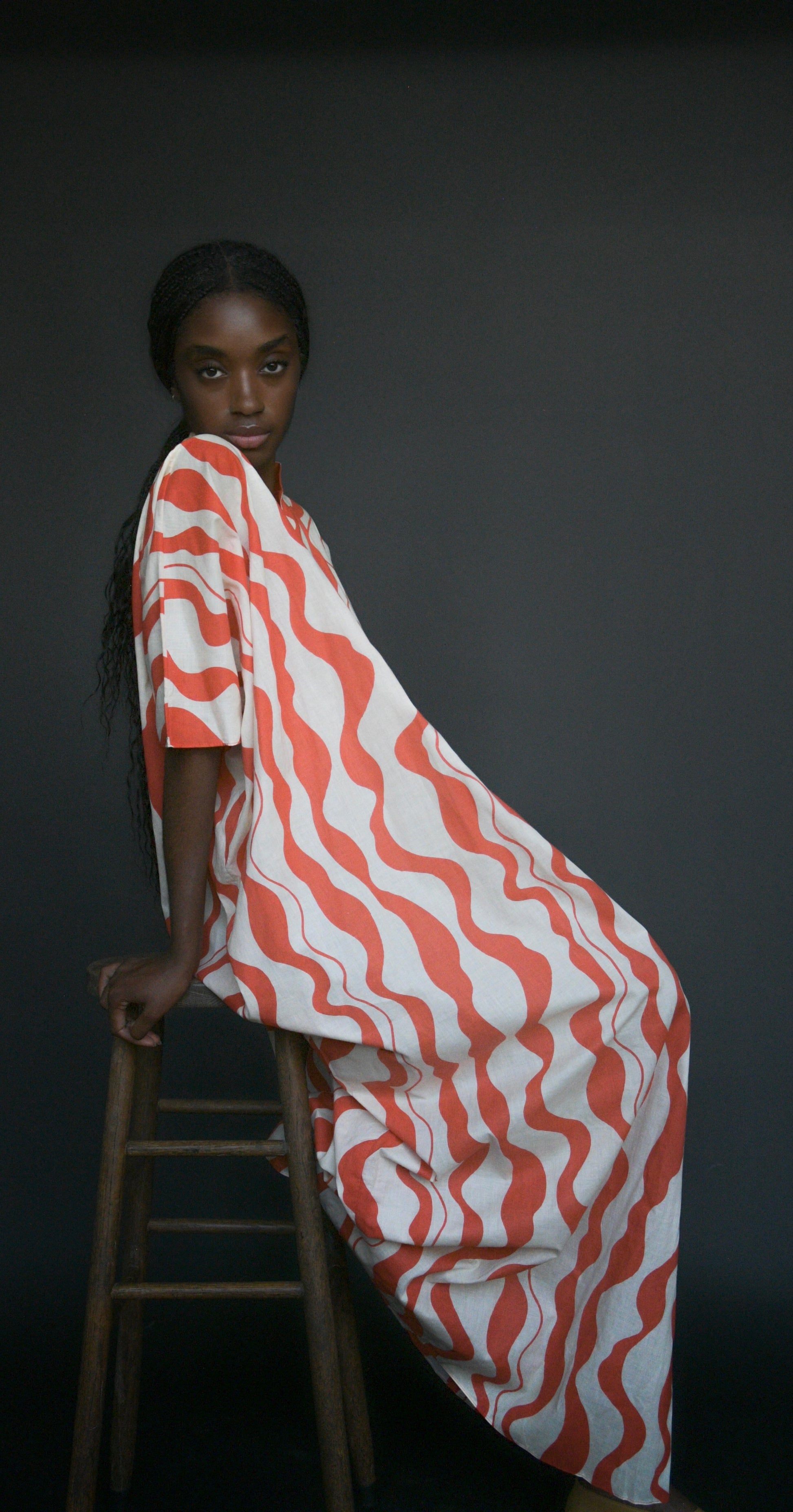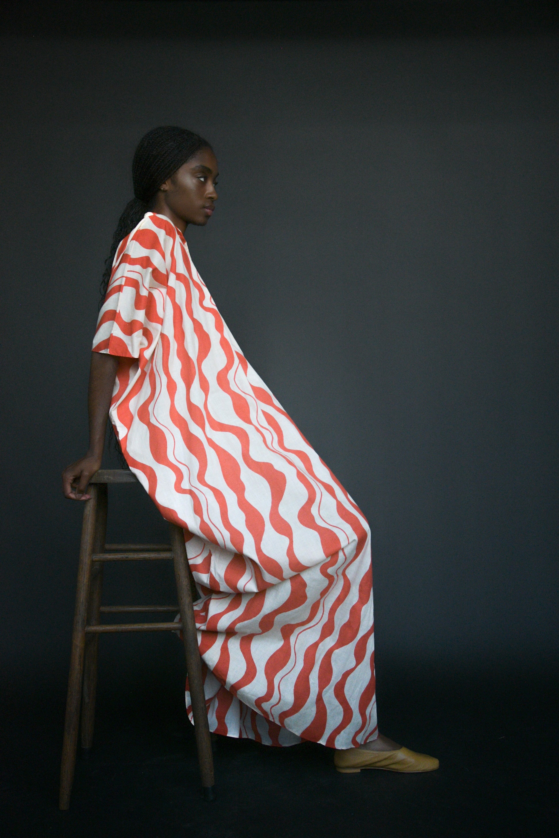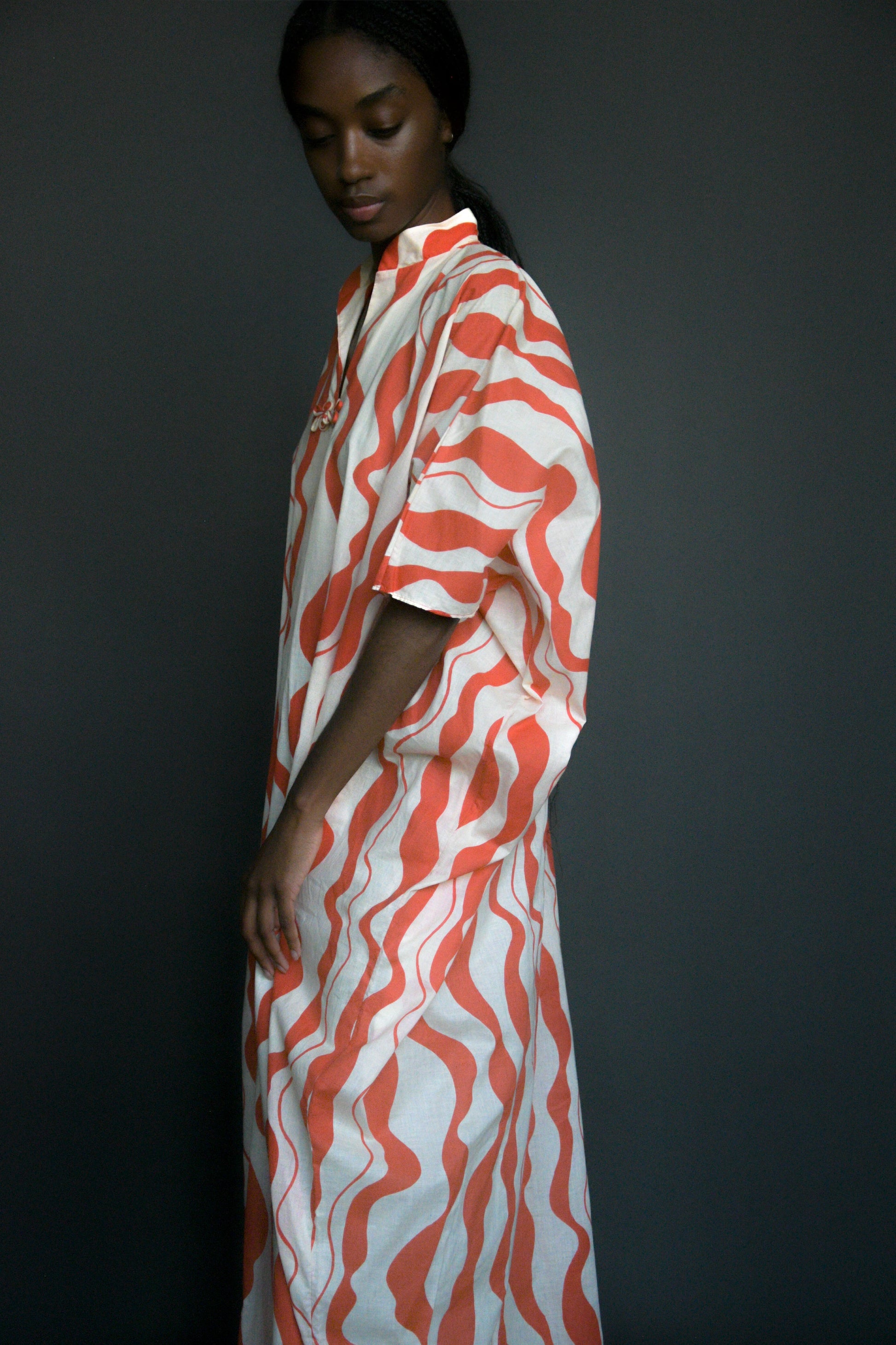a 1970s givenchy cotton caftan with red and white bold print. stand up collar with frog closure at bust.