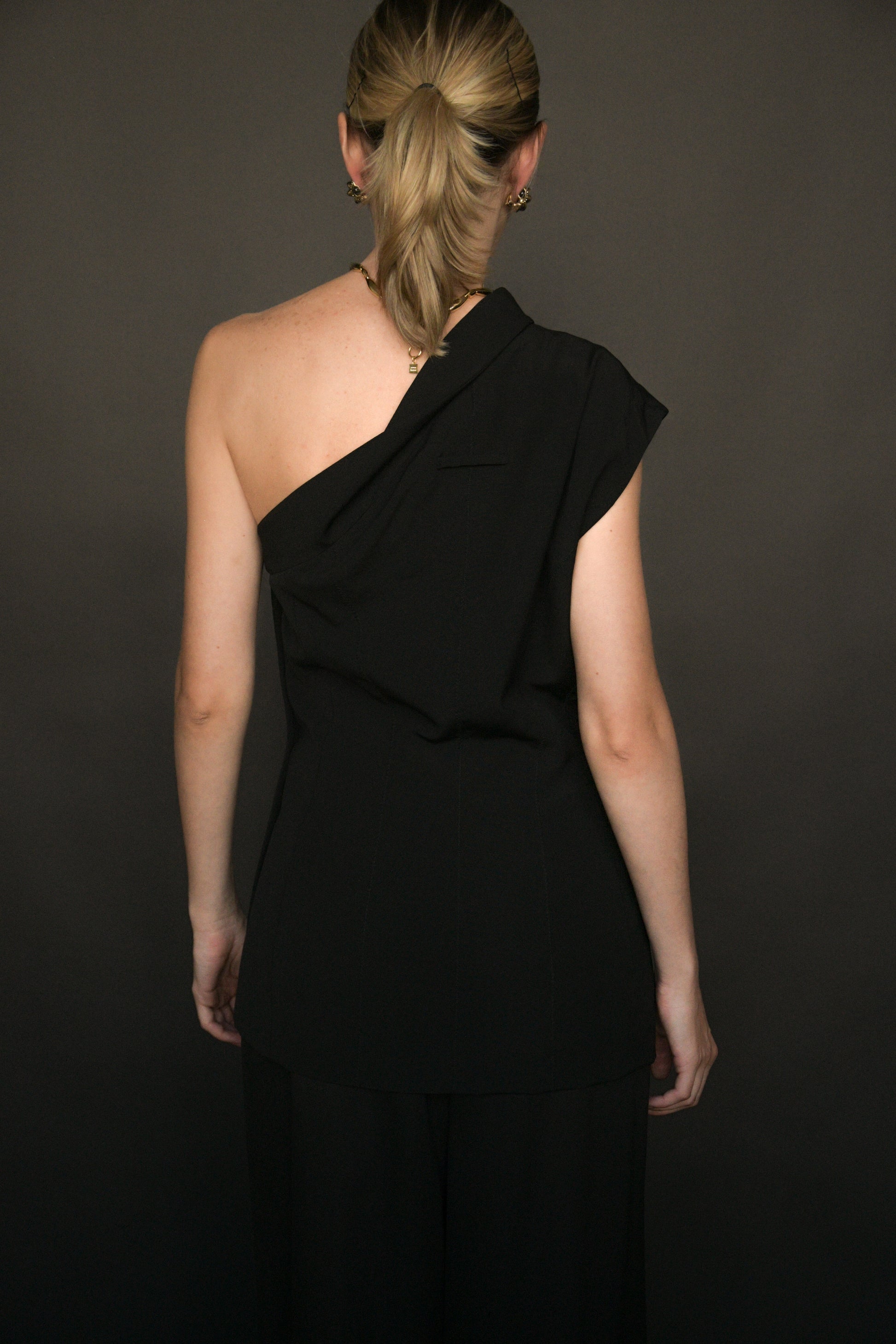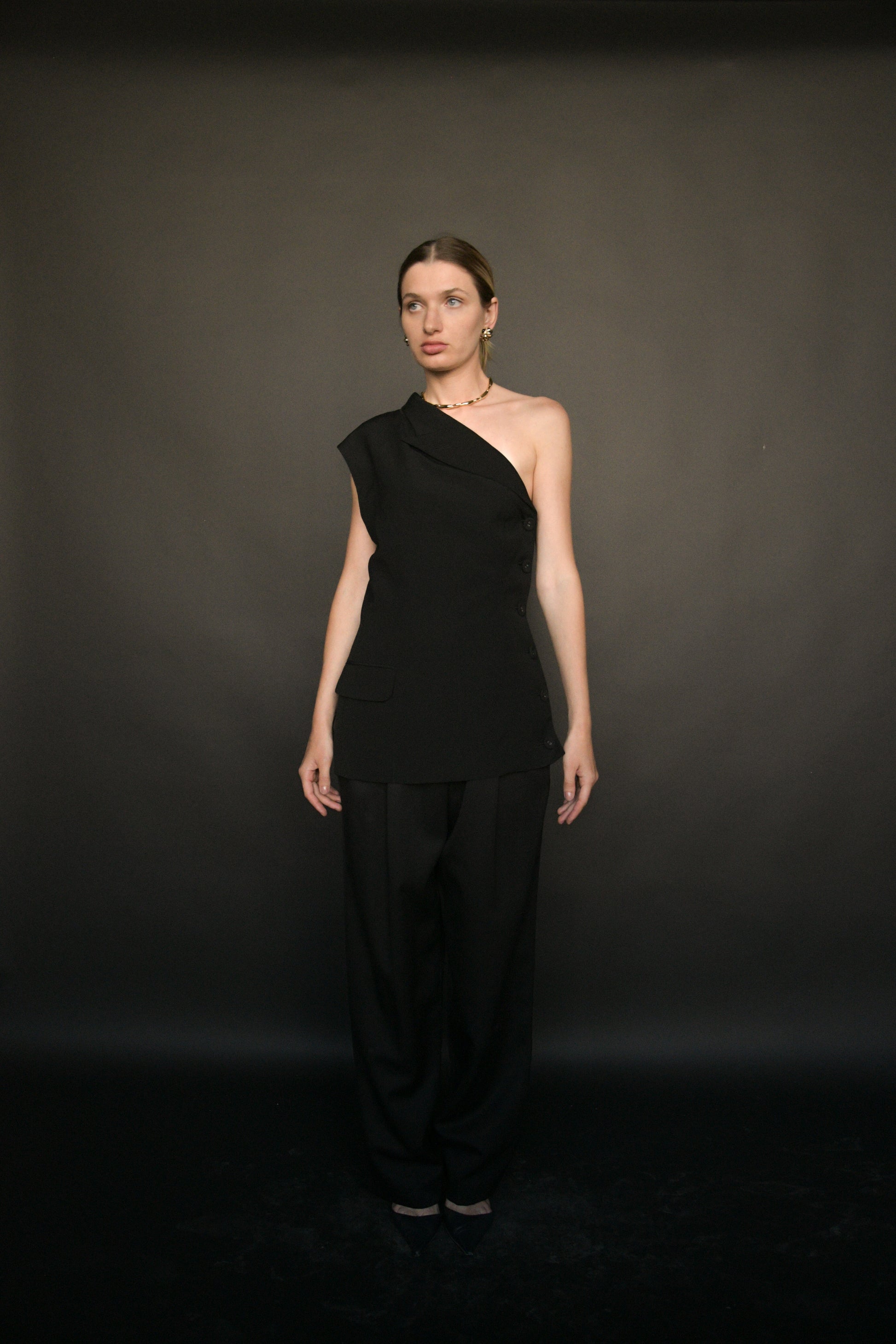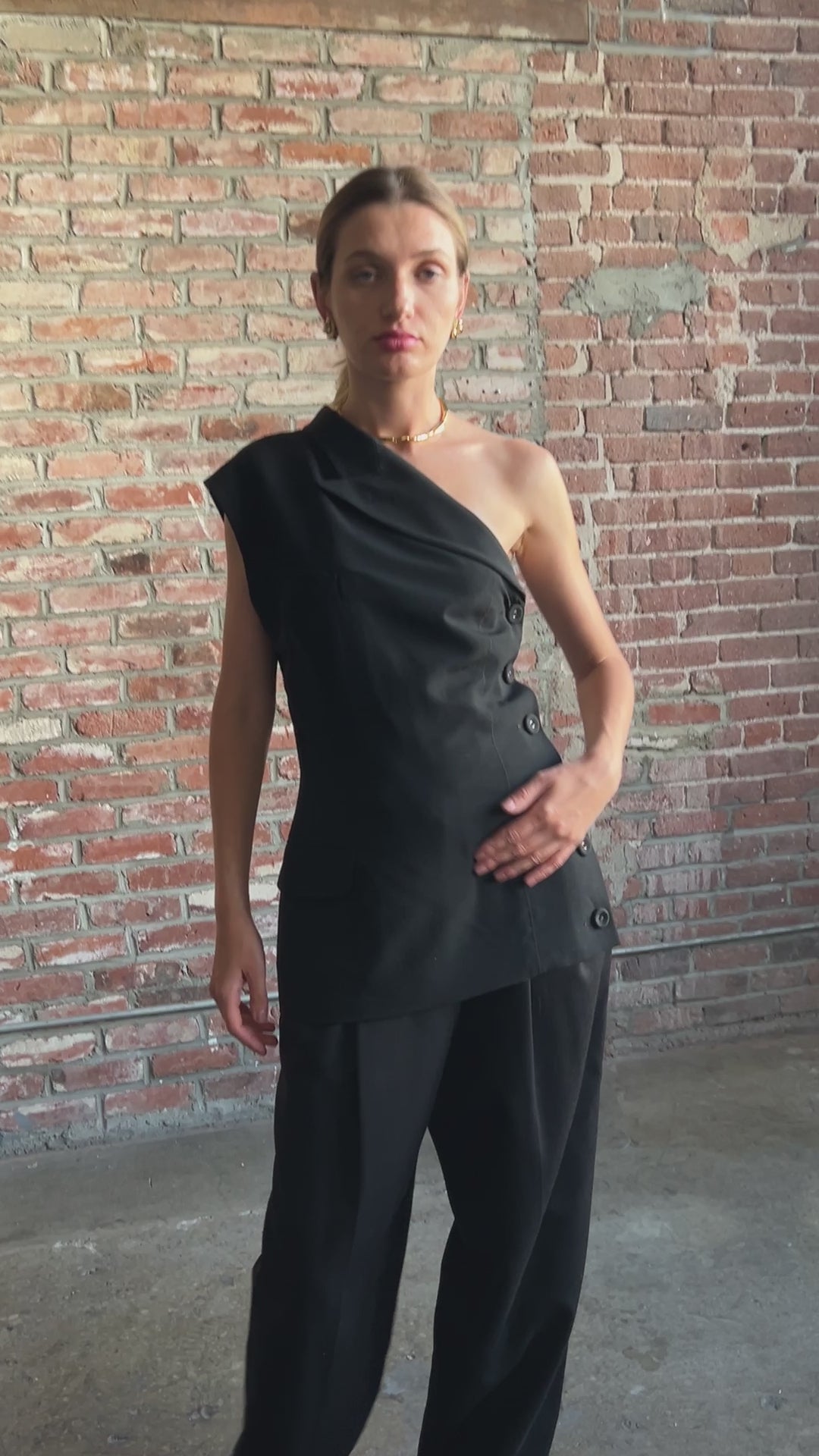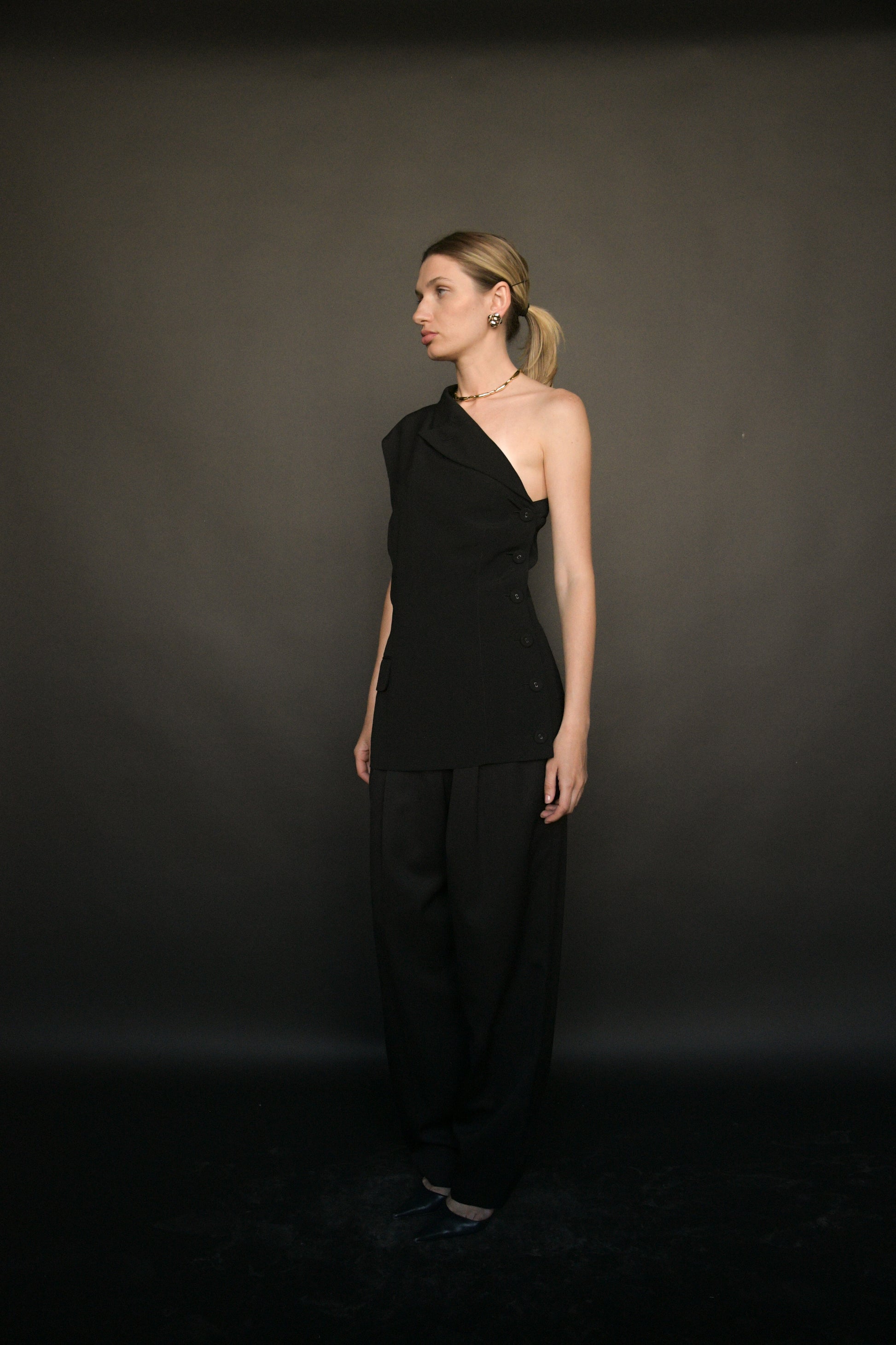 jean paul gaultier spring 1990 deconstructed blazer top, from his collection made famous when he outfitted madonna's 1990 blonde ambition tour. although the styling on the runway read "insane asylum" with the bandage headwear, the piece is actually timeless and chic and super easy to wear. asymmetric design that is a play on a classic black blazer. lined, buttons down the side. composition tag missing - feels like a wool blend.