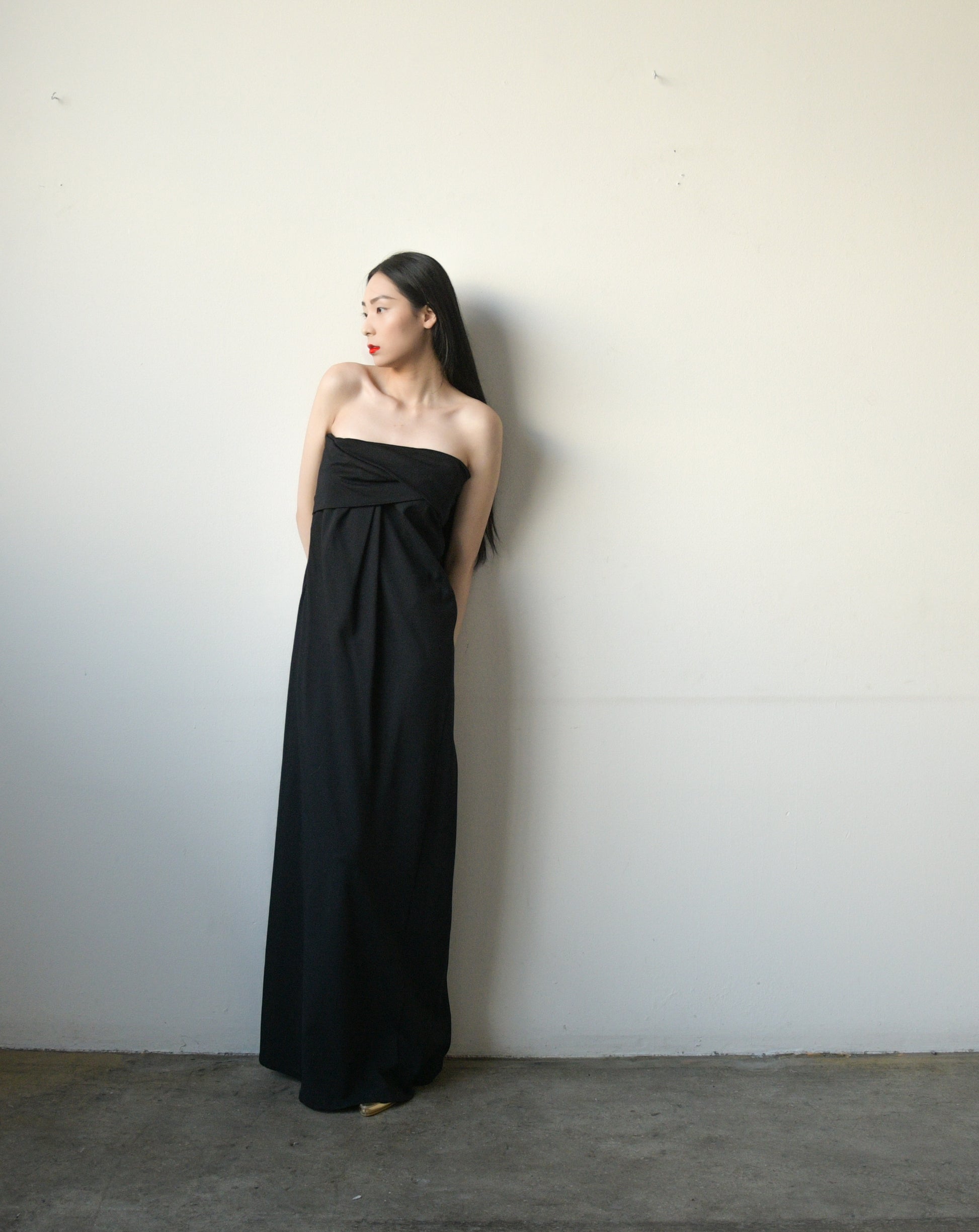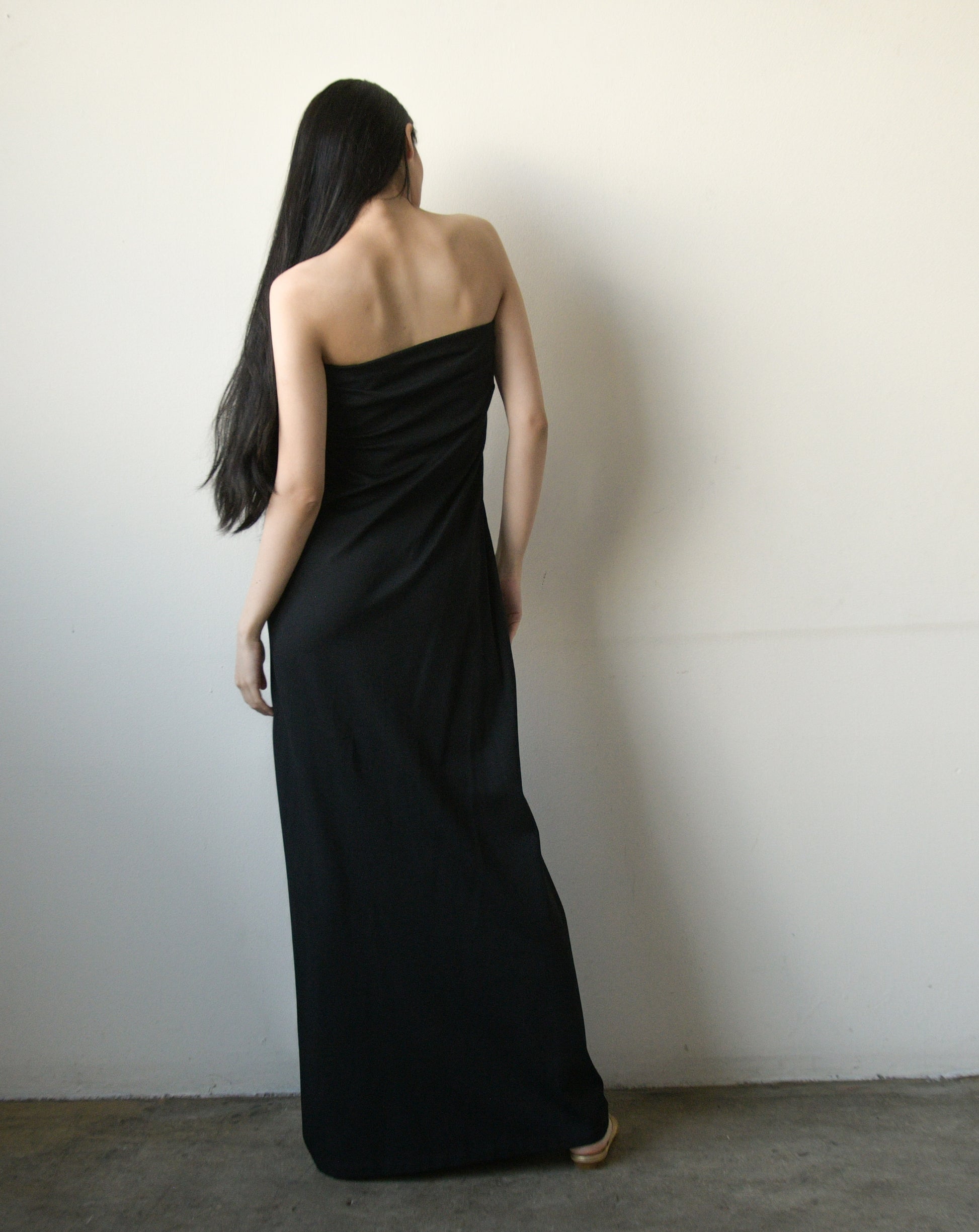 jil sander black strapless gown with foldover detail at bust. incredibly chic and easy to wear minimalist shape, that doesn't cling tightly to the body but falls really elegantly and slims the body. there is an inner band at the bust to secure the dress and help hold it up. unlined, side zip closure.