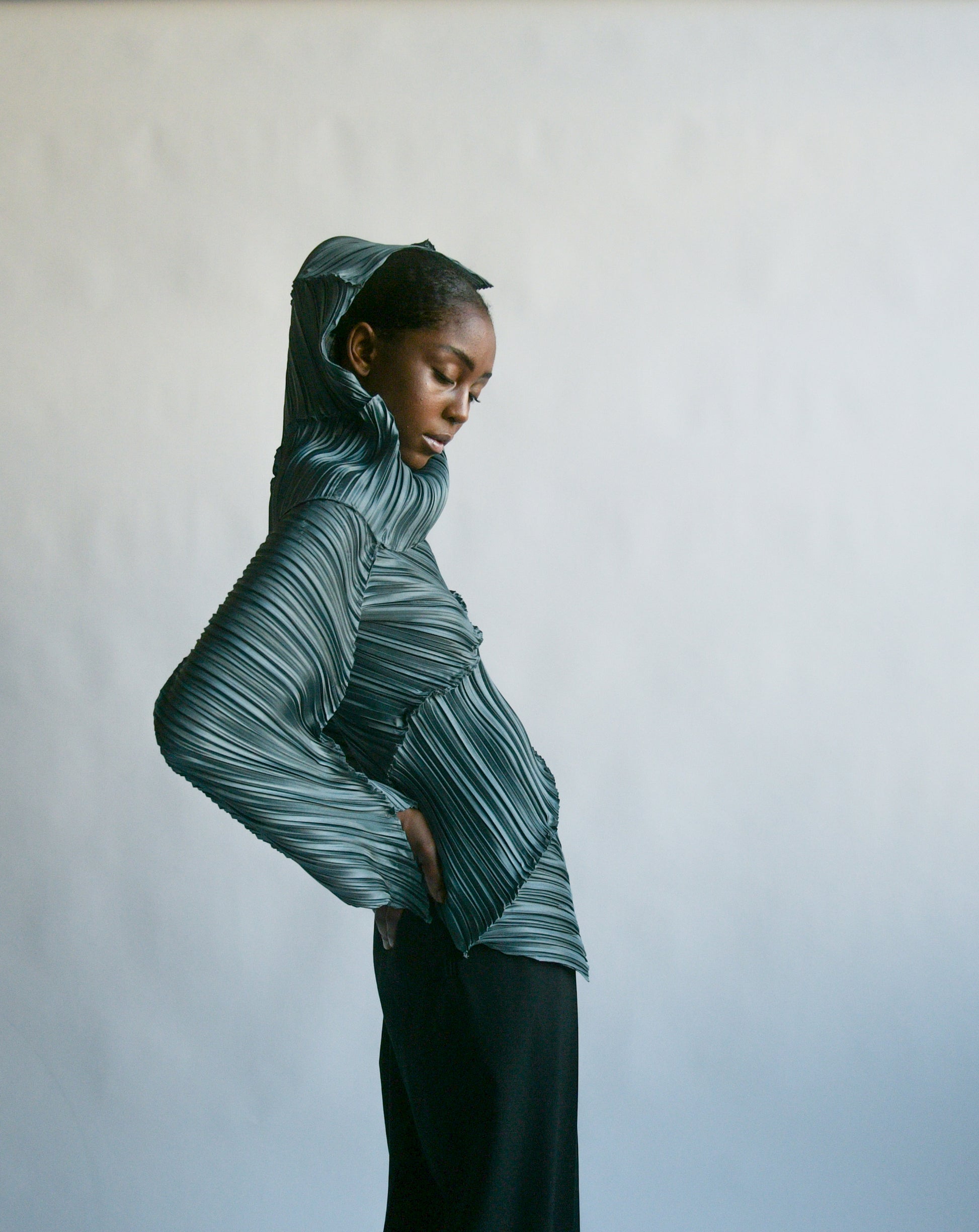 this slate gray silk plisse top is a great example of her work. it features asymmetric seams that piece together plisse pieces cut to point at different angles, creating an effect that feels like fabric in motion, like waves of pleating. there's an oversized collar and the sleeves have an interesting, angular shape. a beautiful art piece and great addition for a collector or lover of plisse pieces.