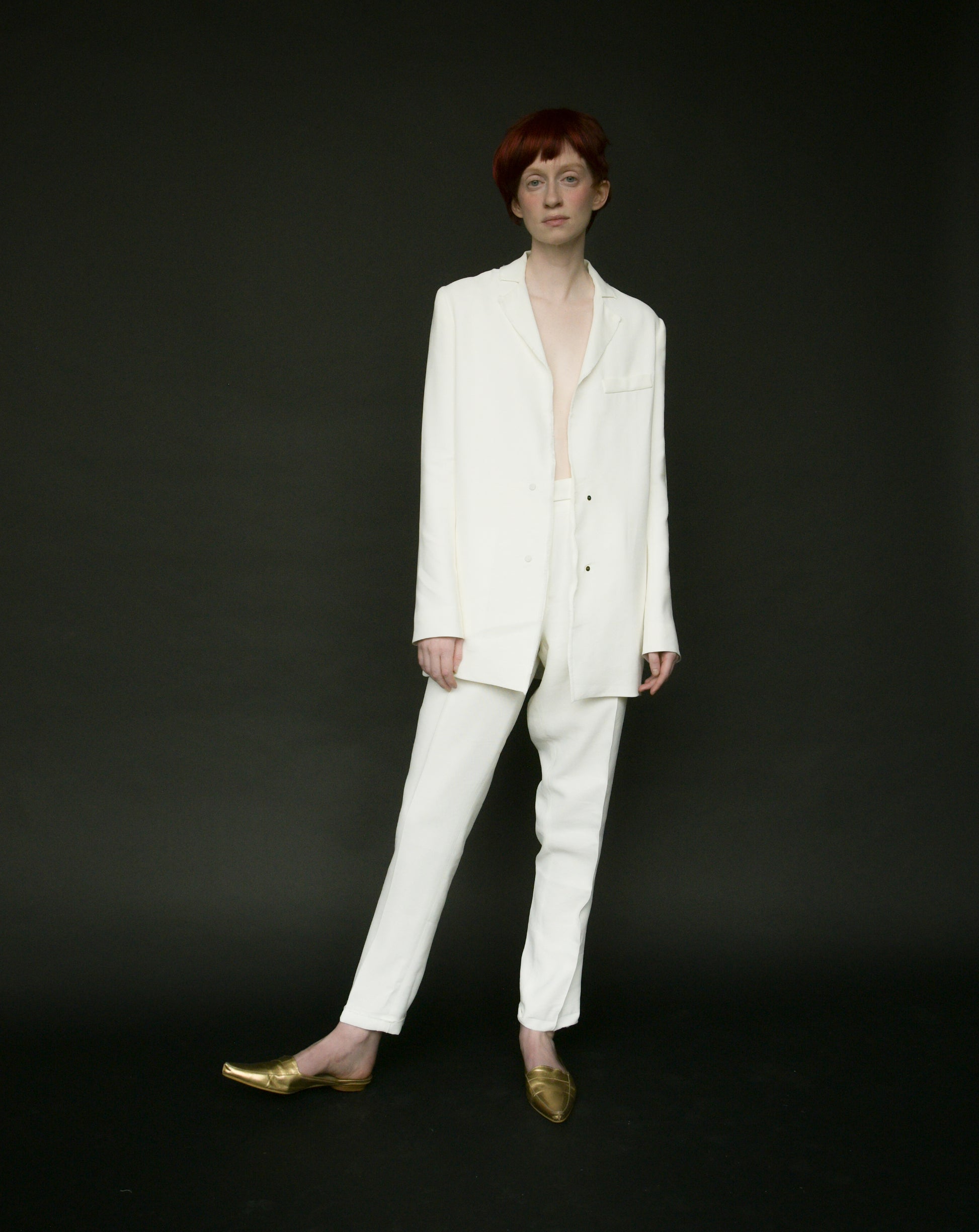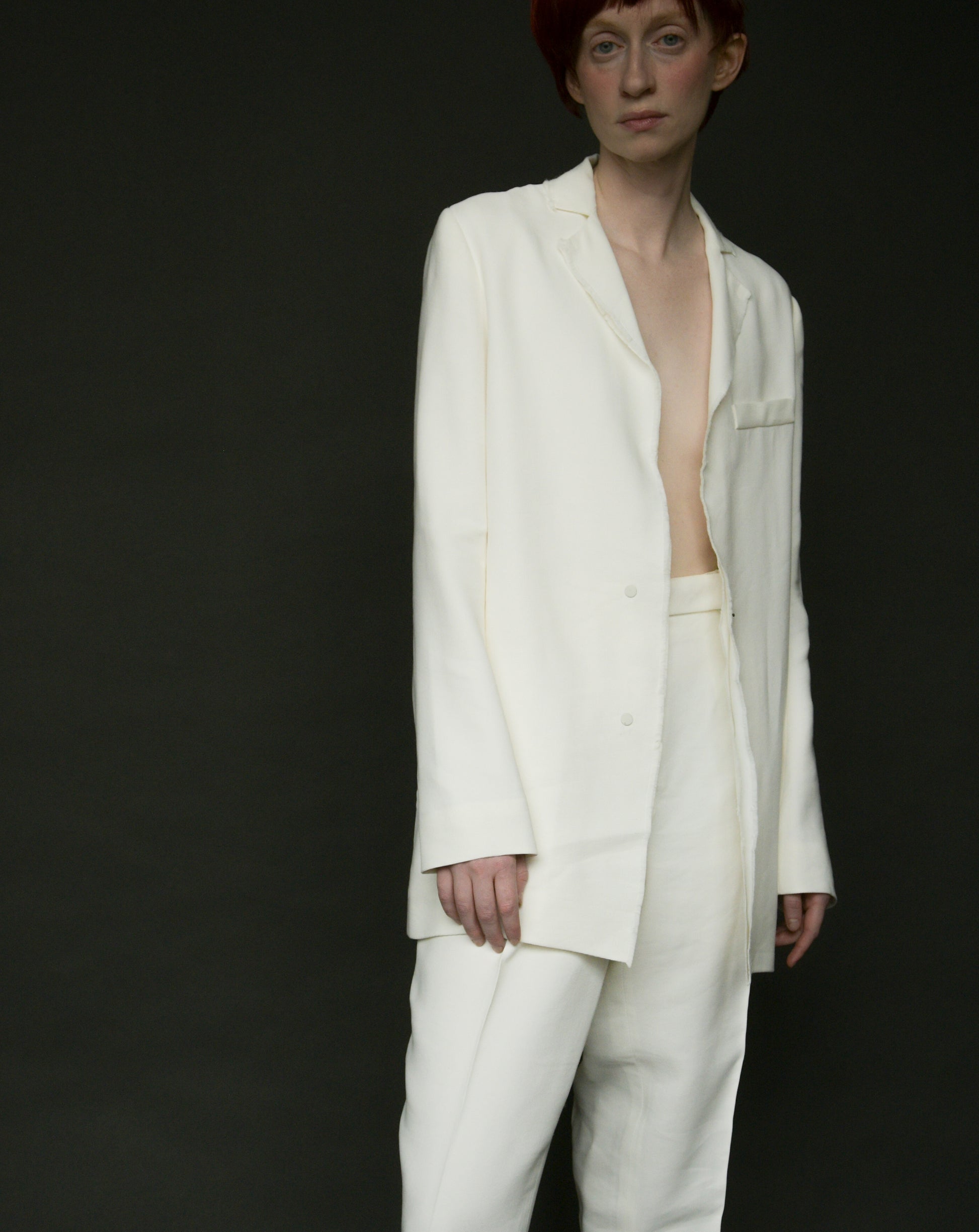 lanvin white pant suit. slightly longer jacket (lined) with snap button closures. raw edges on the jacket and pant hem. unlined trousers. a woven viscose / ramie.