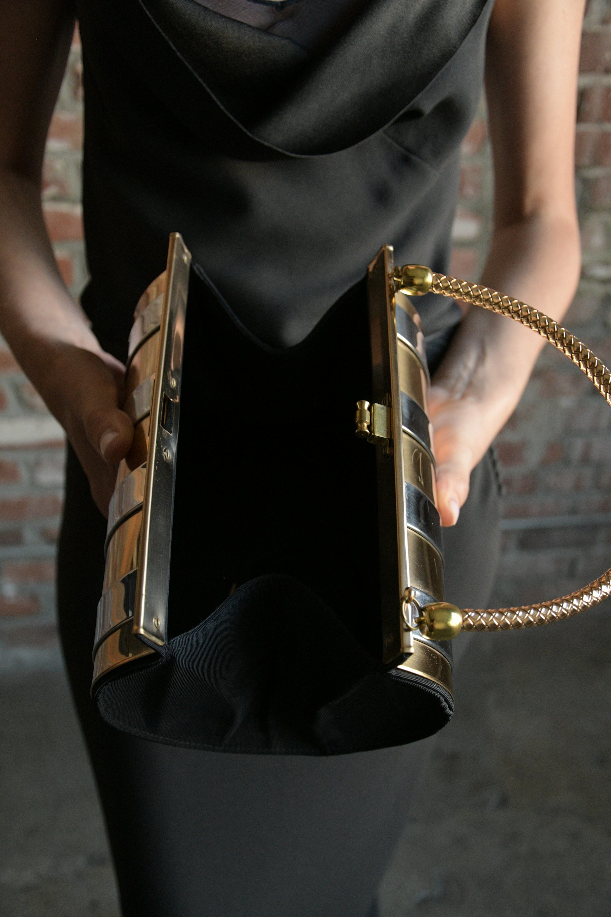 midcentury mixed metal purse in a rare cylinder shape. silver tone metal and a brass. comes with a matching change pouch.