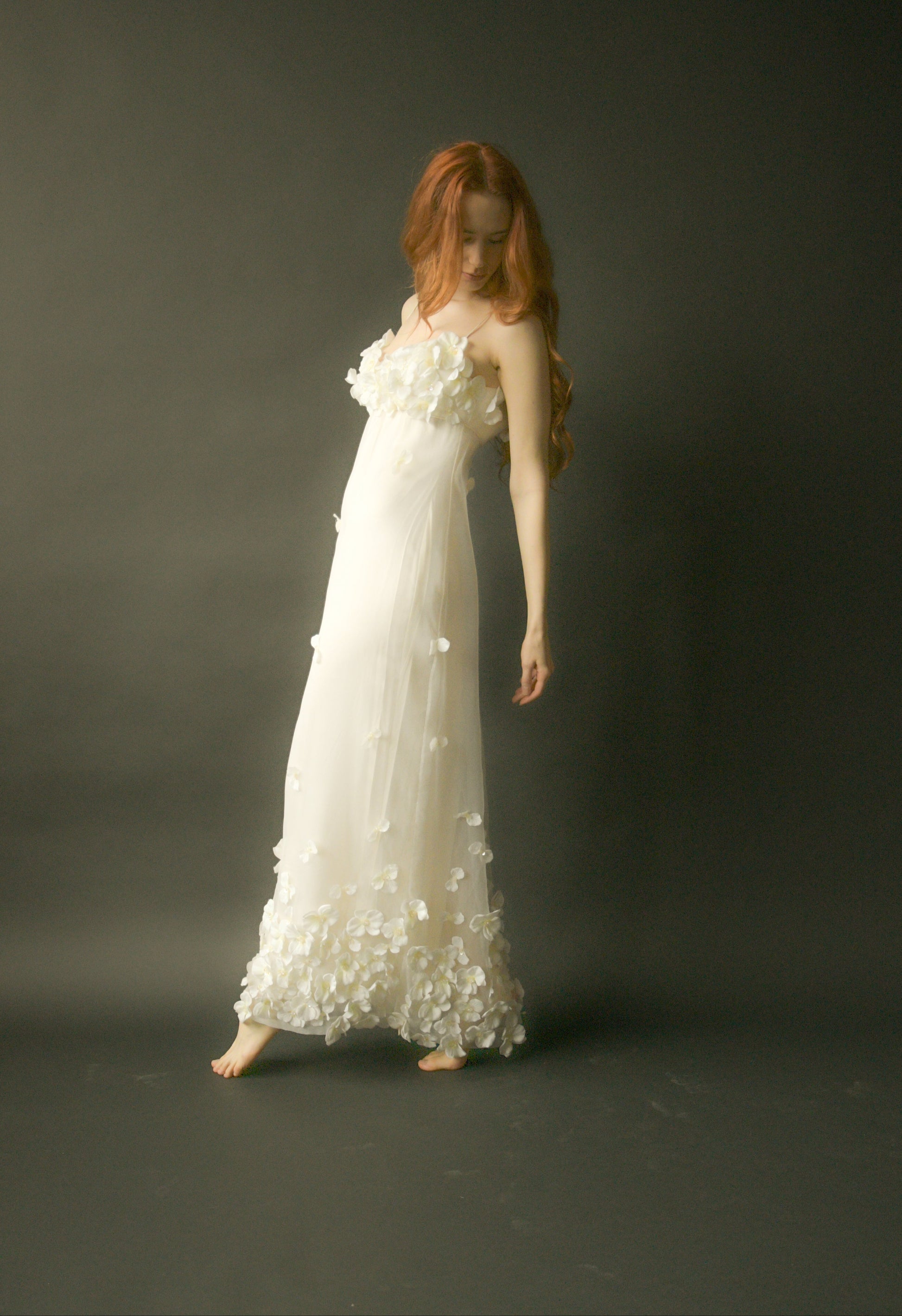 peggy jennings white organza 3D floral applique dress. this dress features an empire waist, a sheer organza layer as well as a nude silk charmeuse lining, and cascading bead and sequin 3D floral appliques that give the effect of flowers falling from the bust down to the hem of the dress. there is a back vent in the lining dress for ease of wear and a back zip closure. peggy jennings was a model-turned-designer who designed romantic clothing with a focus on special fabrics and dresses governors' wives and first ladies, including laura bush and hilary clinton.