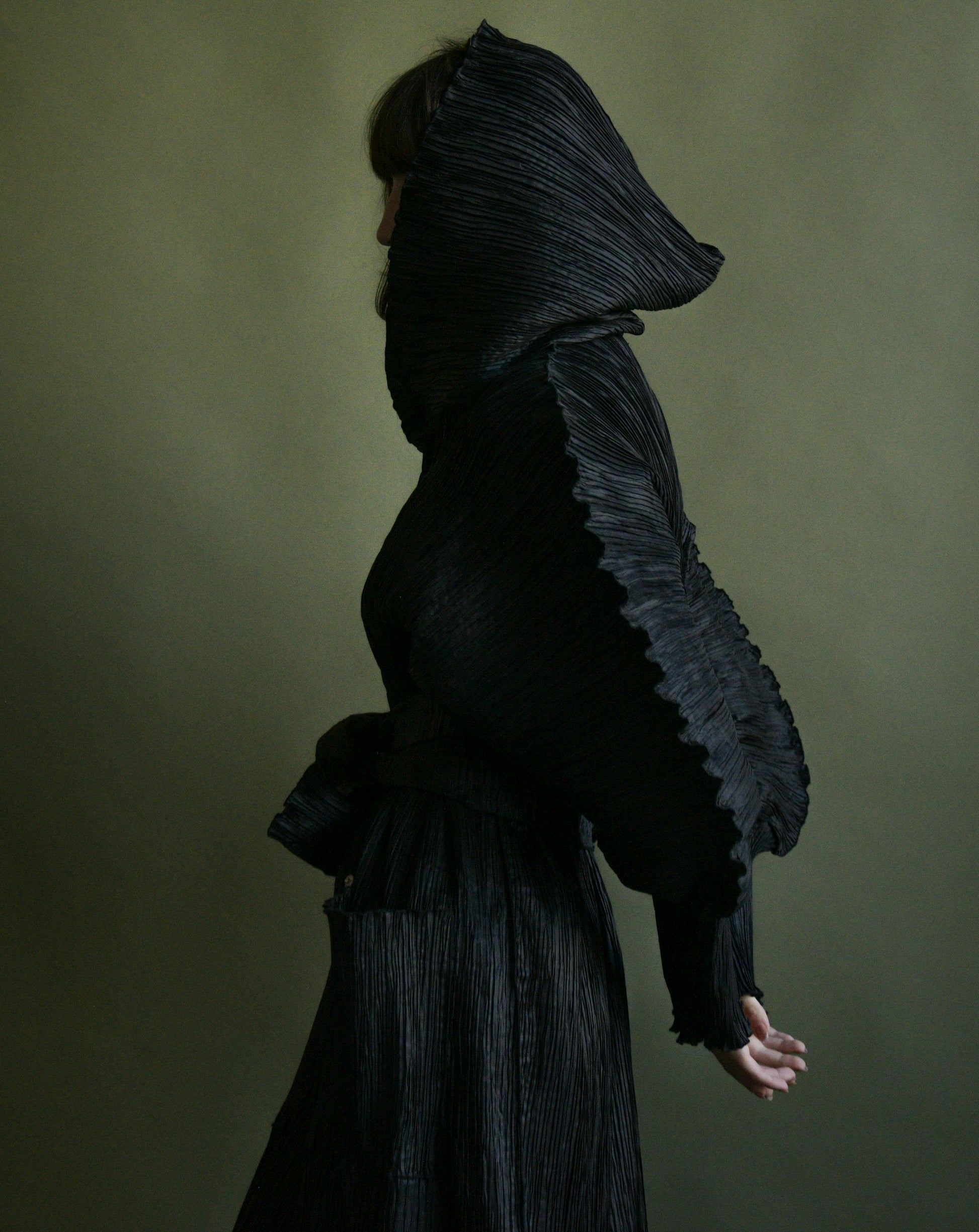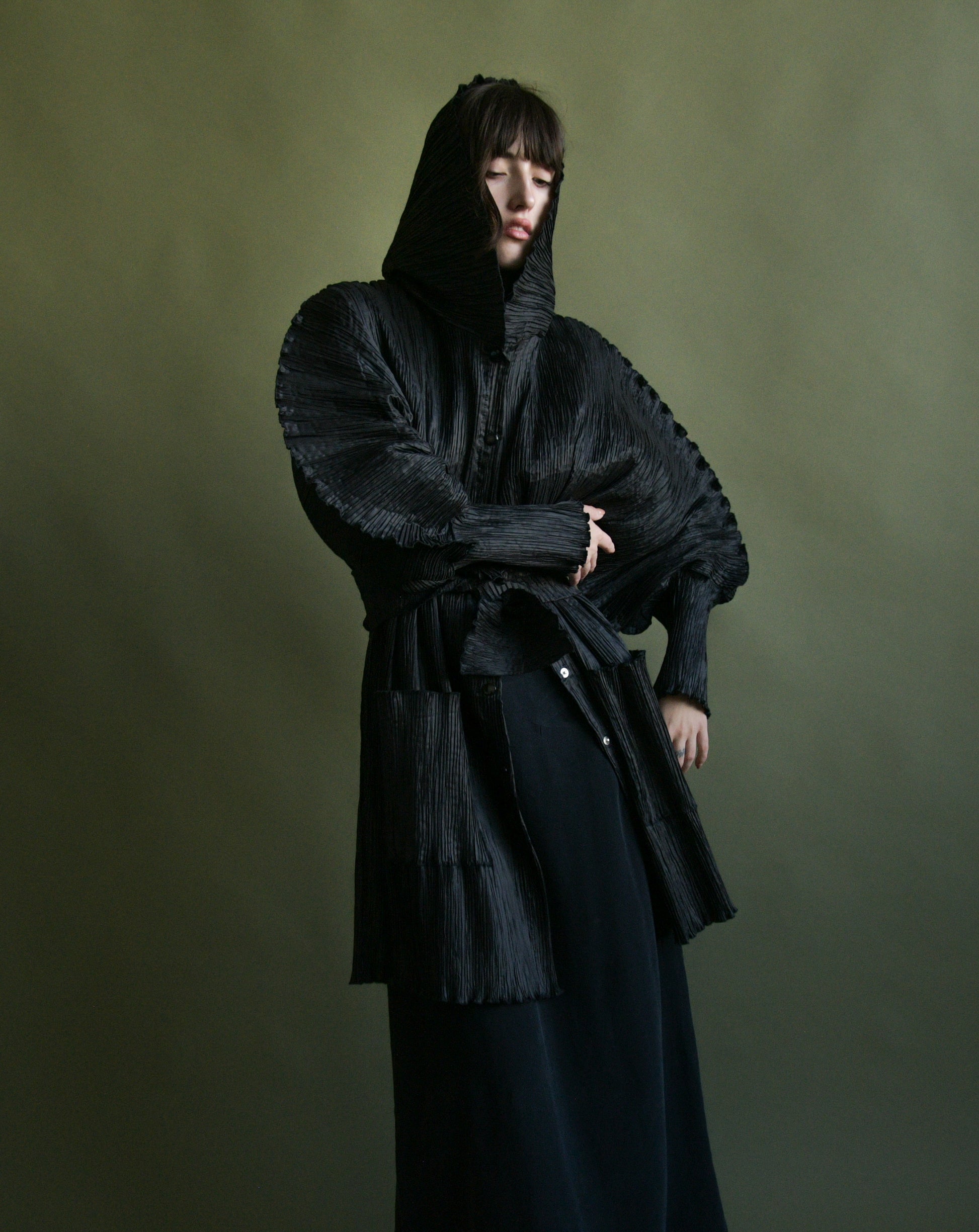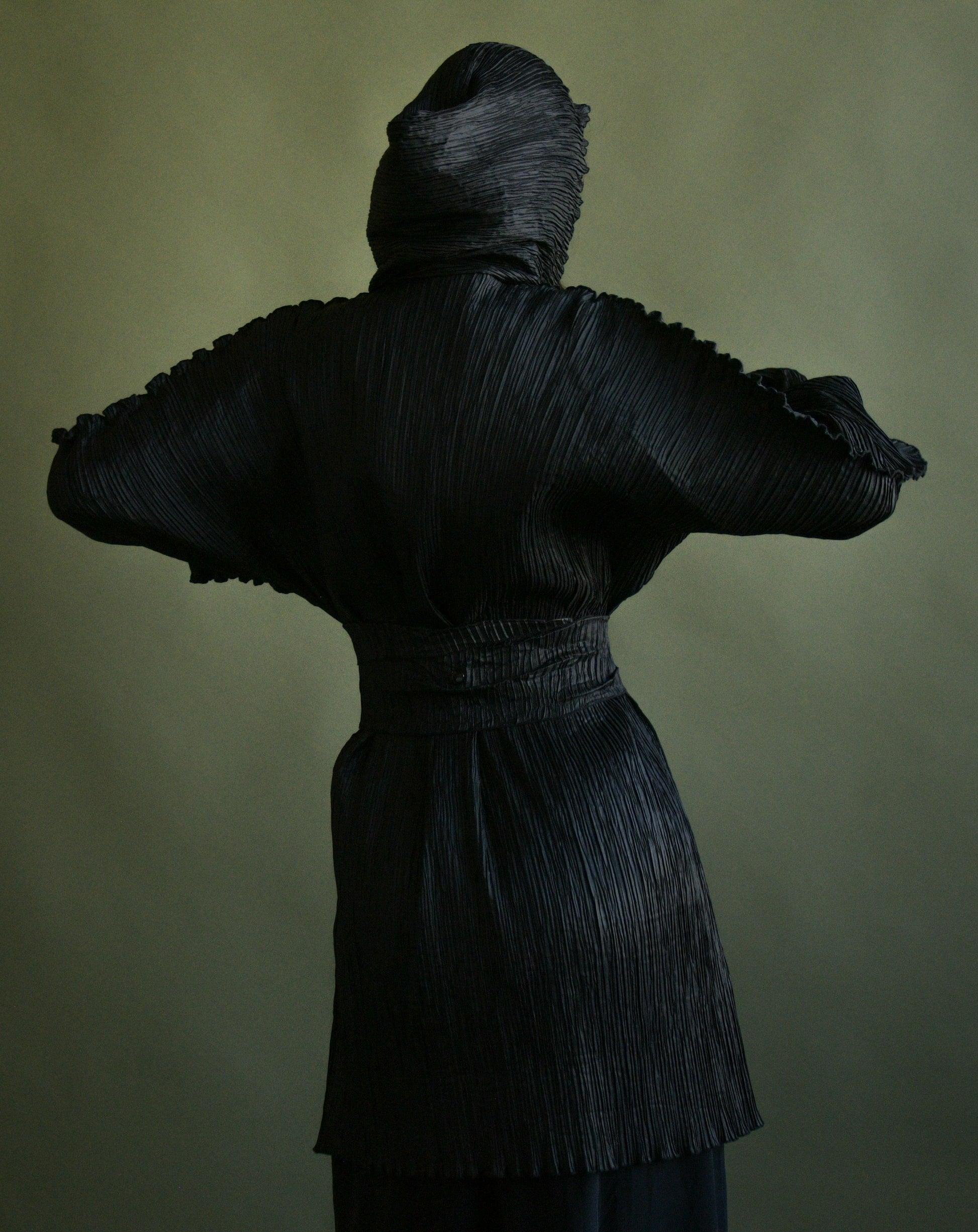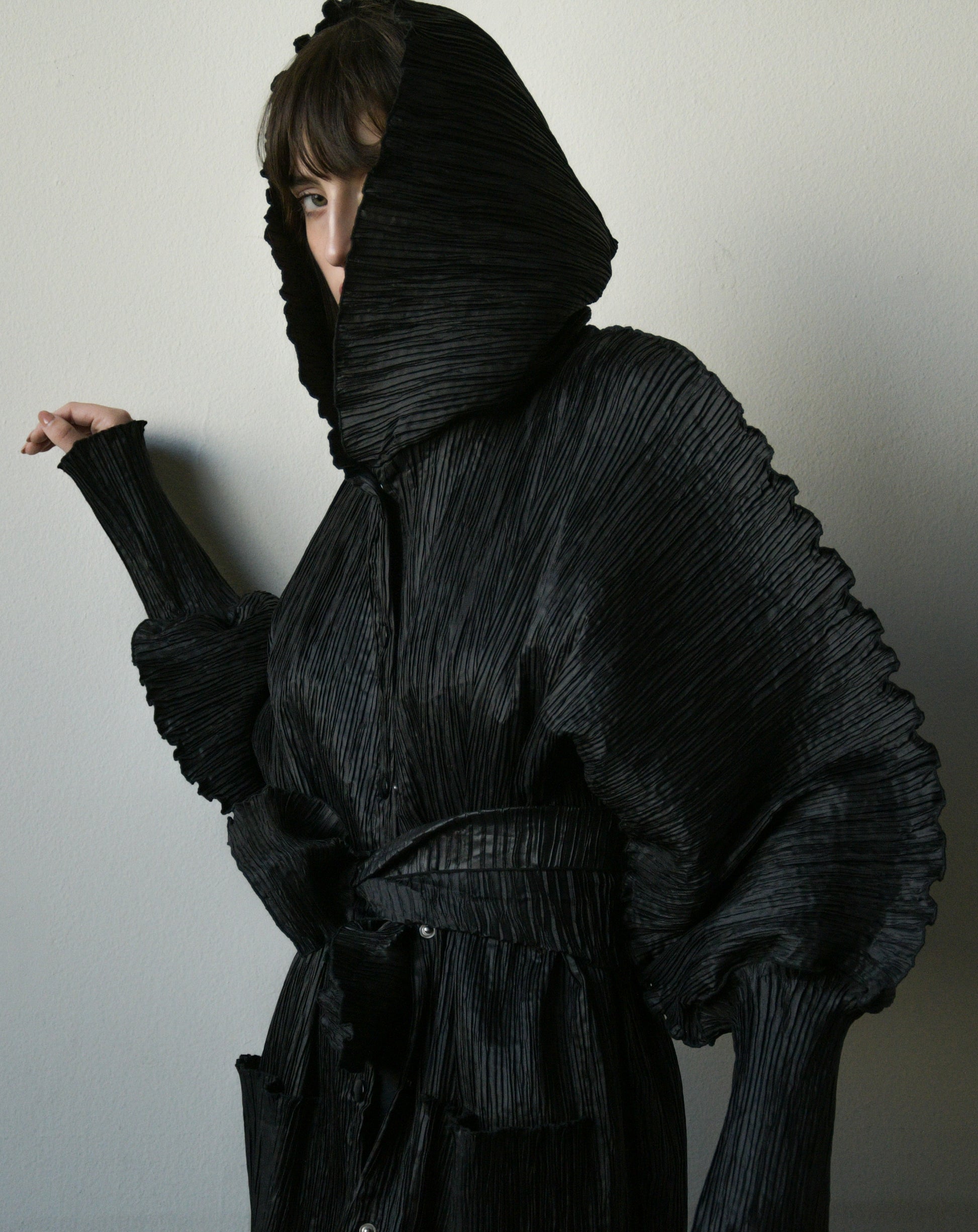 unique black plisse trench coat with best scalloped edge sleeves, long cuff, hood that can be zipped open. amazing shape as you move. snap button closures. matching belt, pockets at hips.