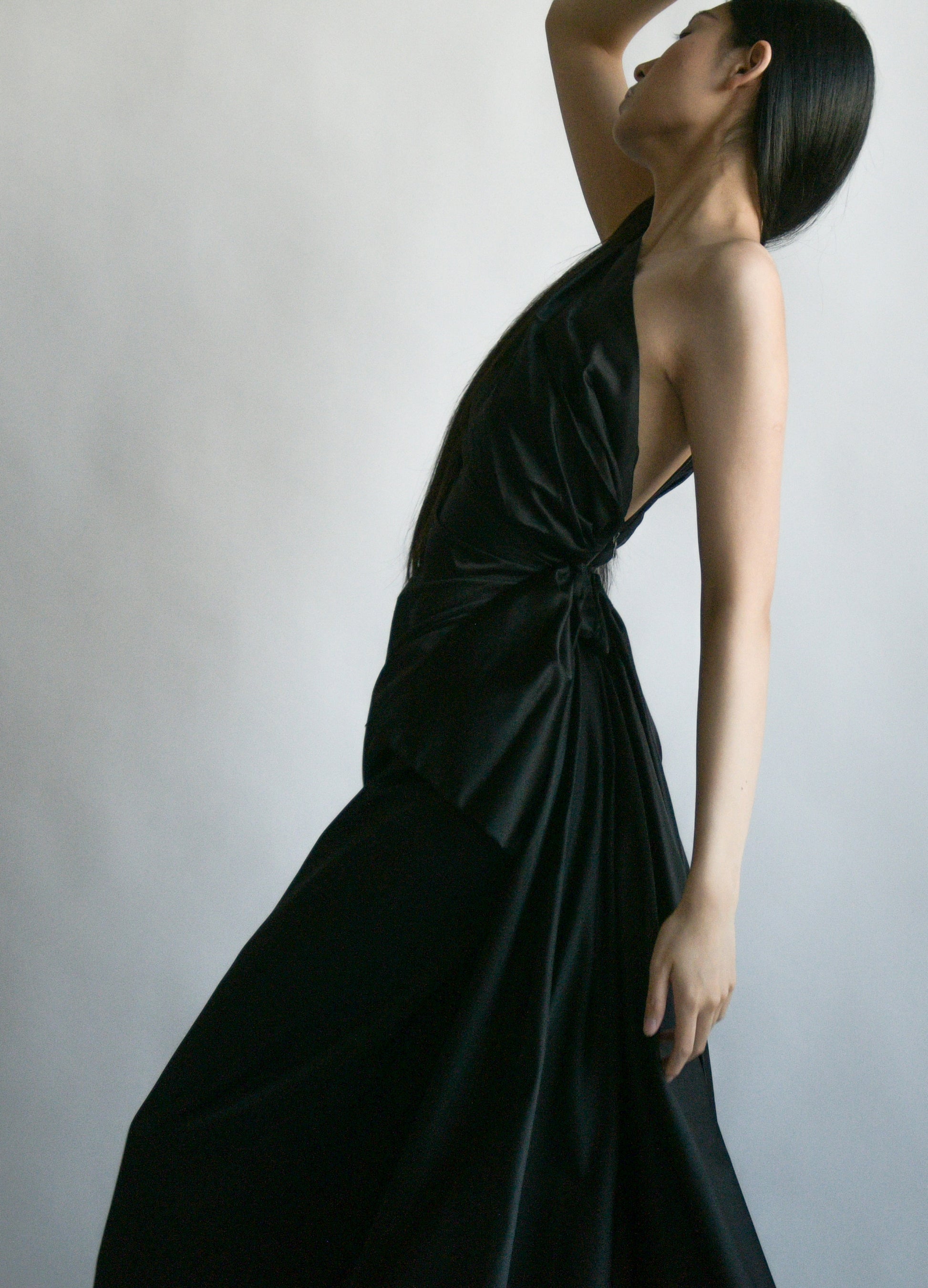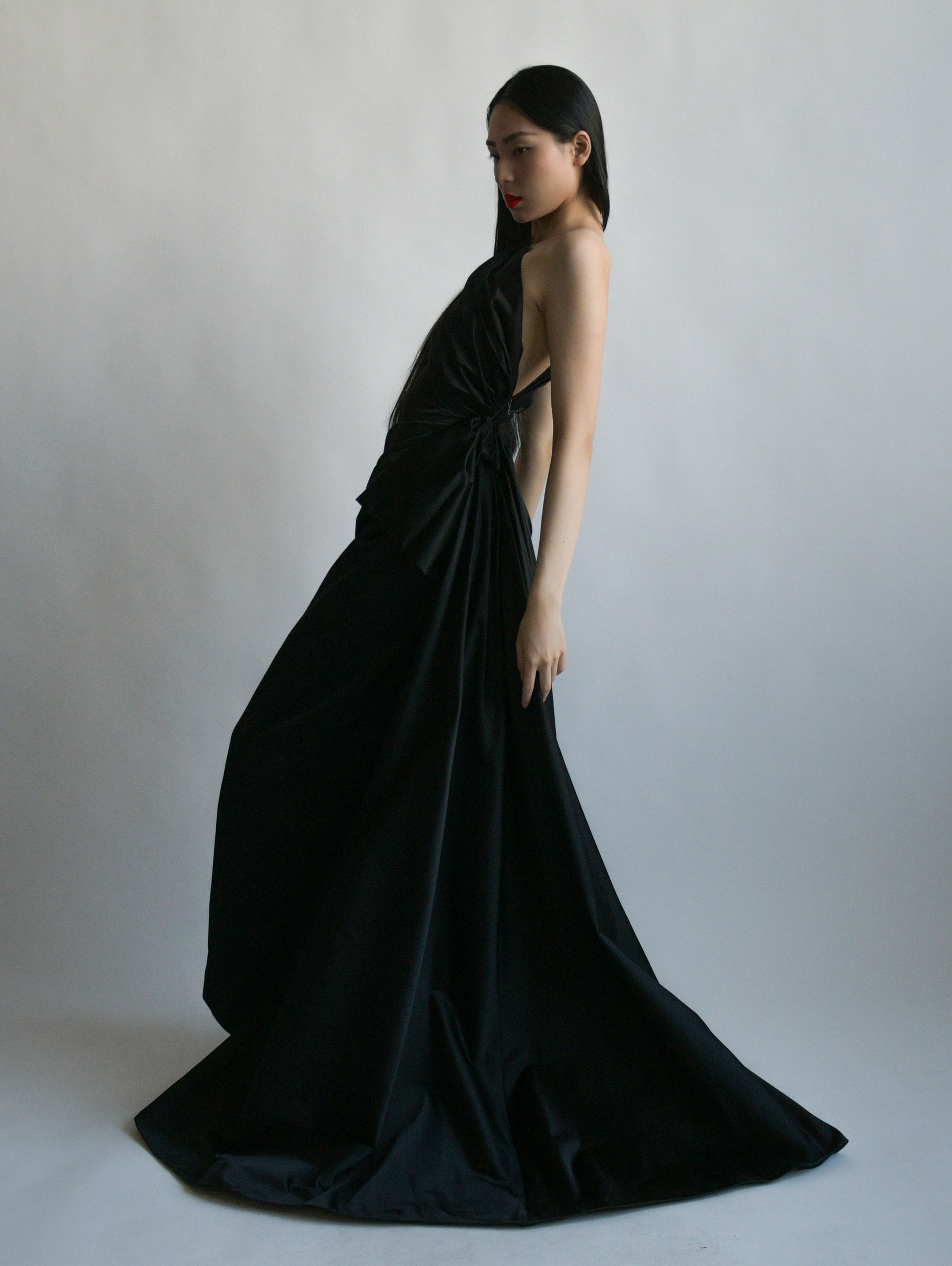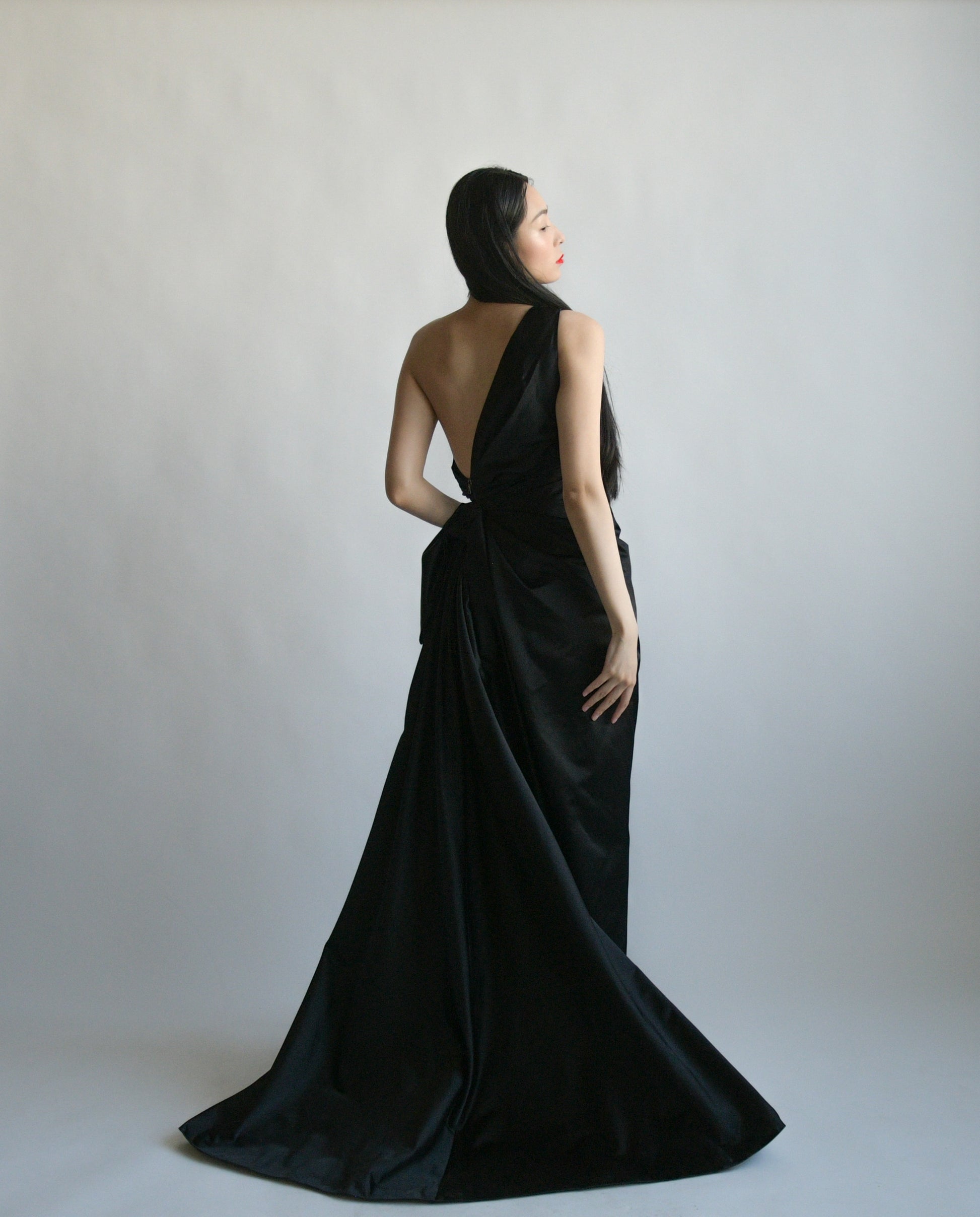 a prada silk taffeta black one shoulder gown. the entire dress drapes beautifully across the body to one point at the side of the waist and ends at a zip closure with oversized bow. (not an obnoxious bow but a very subtle and elegant one.) the draped silk taffeta skirt continues to a train in the back of the dress, which can be placed in different ways around the body (a longer train for more drama, etc)-- the fabric is slightly stiff and will hold somewhat in place. lined in a silk organza. an incredibly classic, elegant and timeless dress, with a hint of 1950s glamour, that should be a dress that can remain in your wardrobe for a very long time.