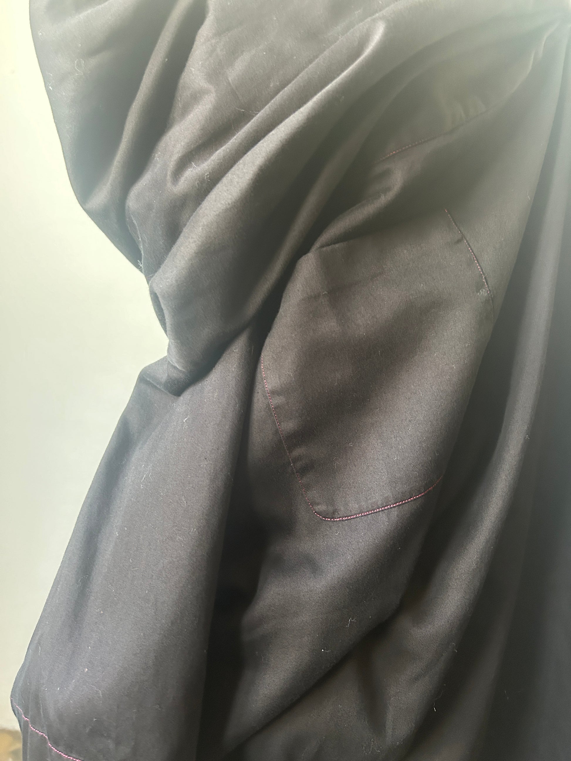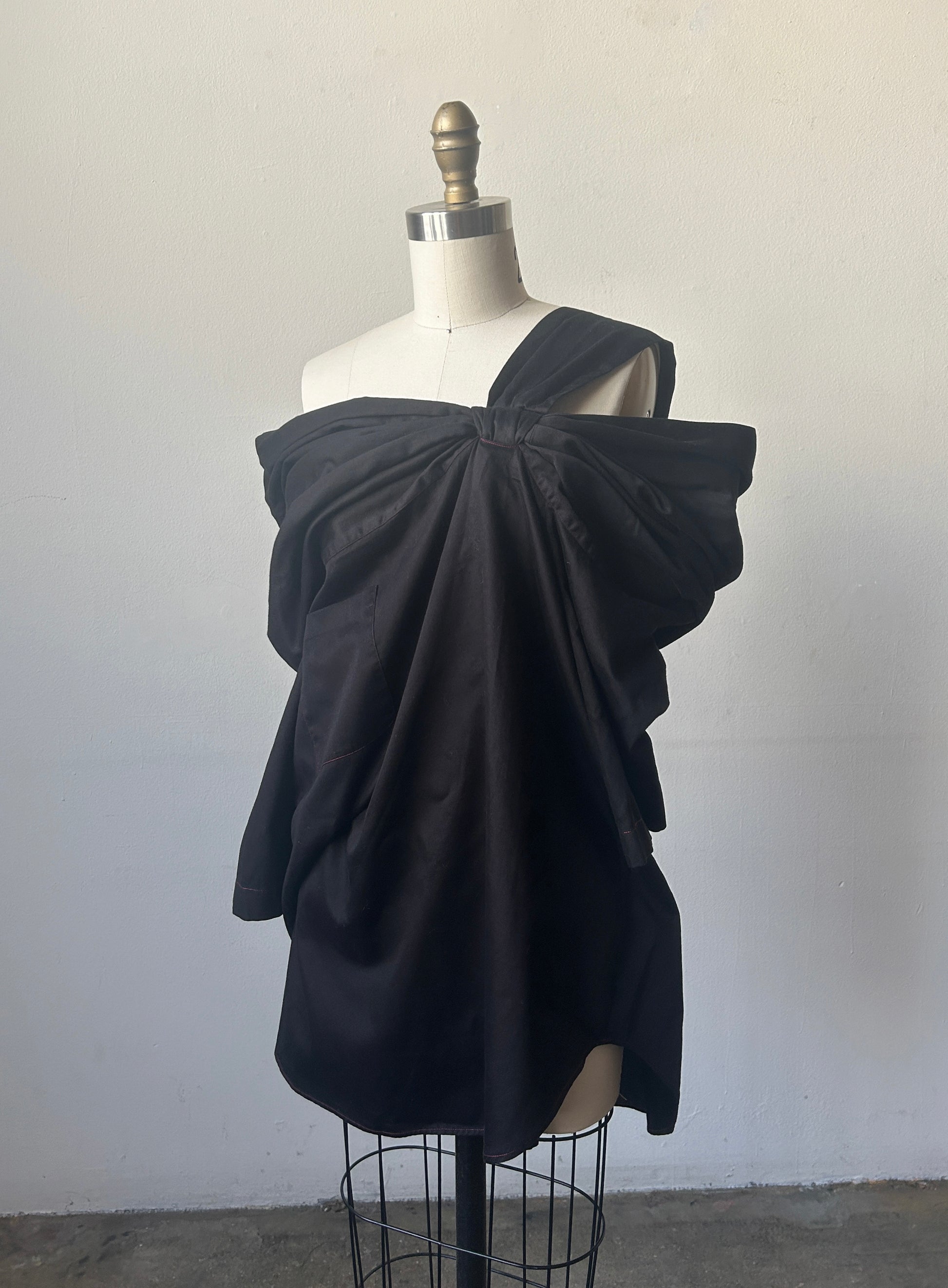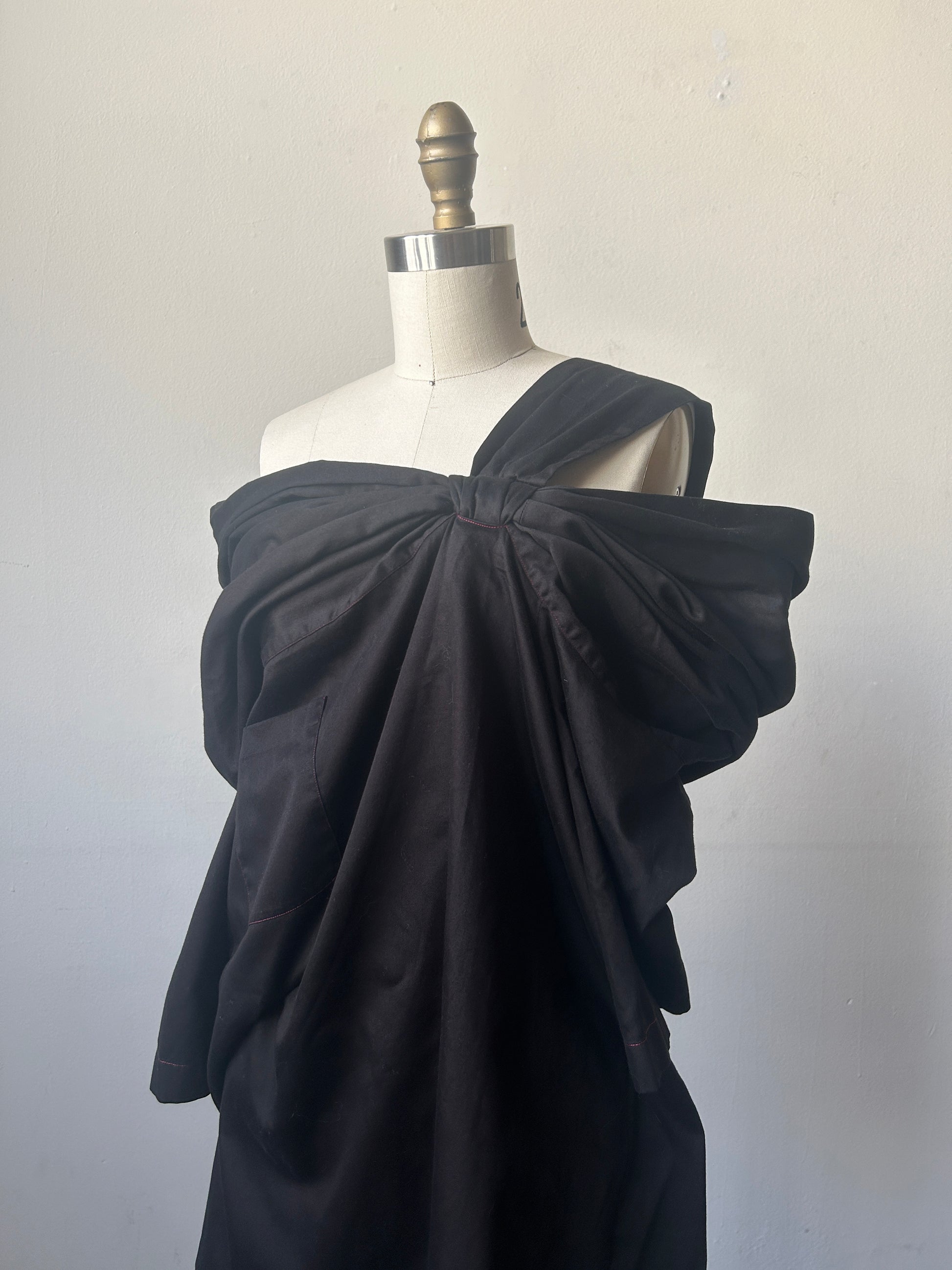 available is a romeo gigli circa 1989 / 1990 black cotton off shoulder top/dress. there is an exaggerated amount of fabric that wraps around the shoulders, that can be arranged for effect, and the top hangs from a single asymmetric shoulder strap, exposing the shoulders and making this volumious top somehow still very chic and feminine. the top has that pre-raphaelite feel but is also incredibly modern, which gigli does so well.