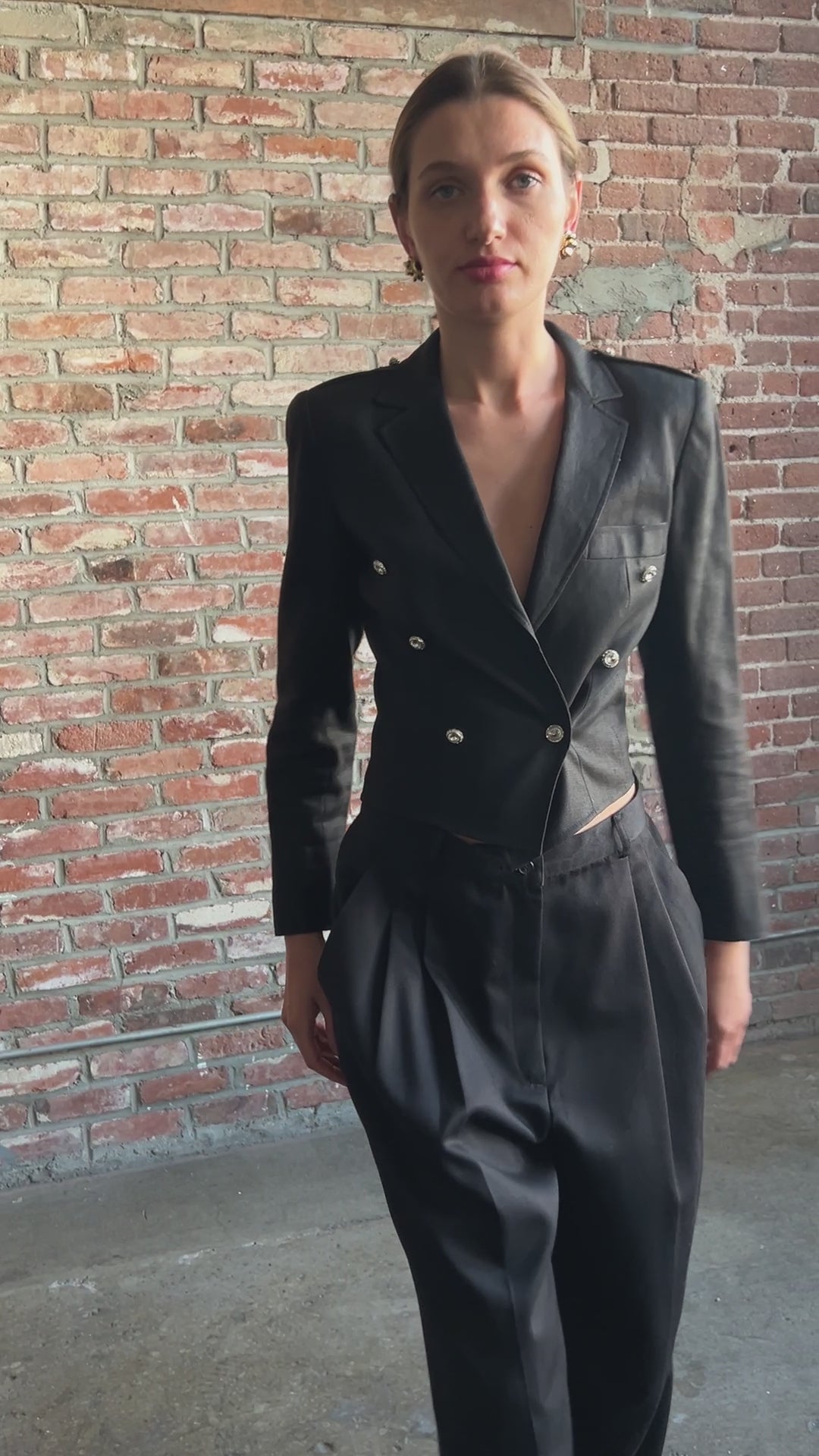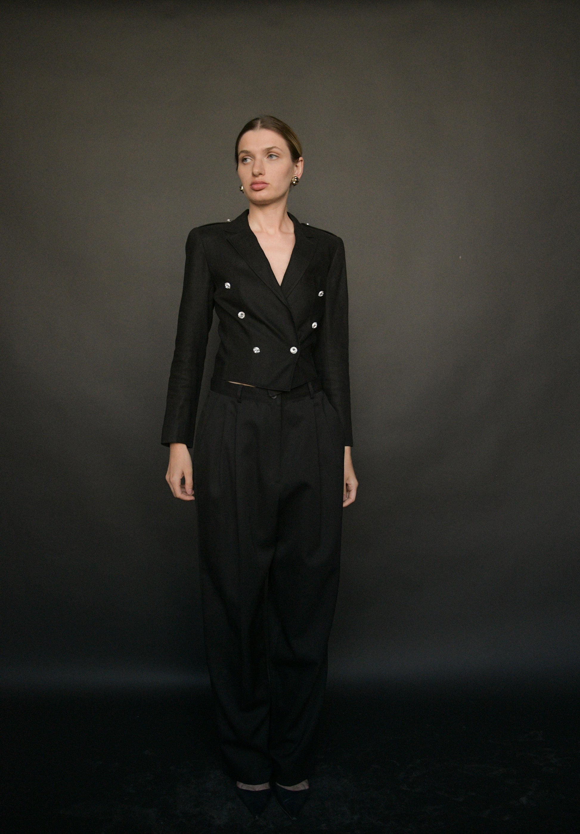 valentino black woven flax cropped jacket with rhinestone buttons. military styling with epaulets.