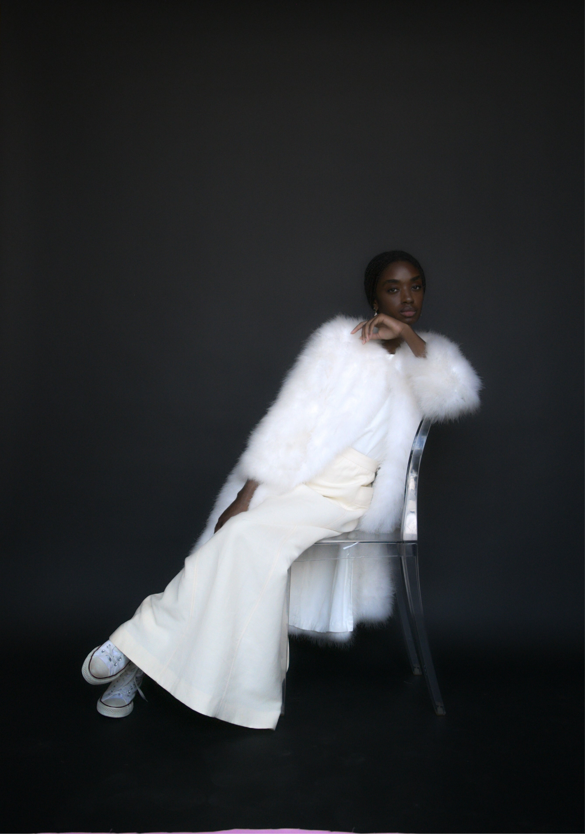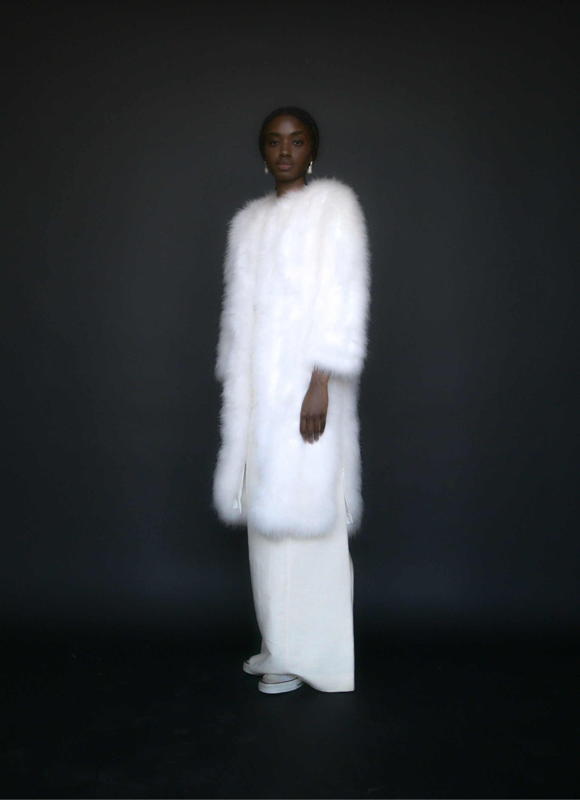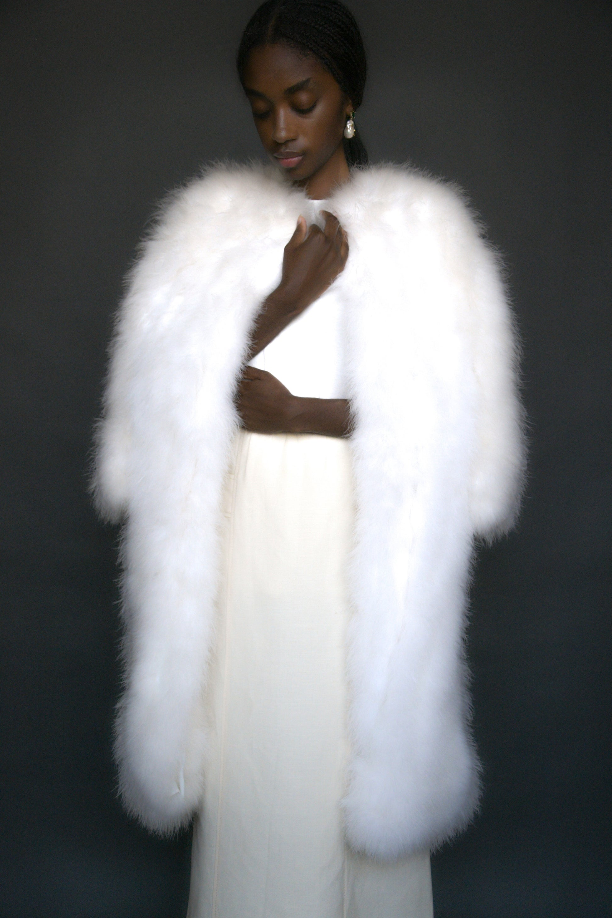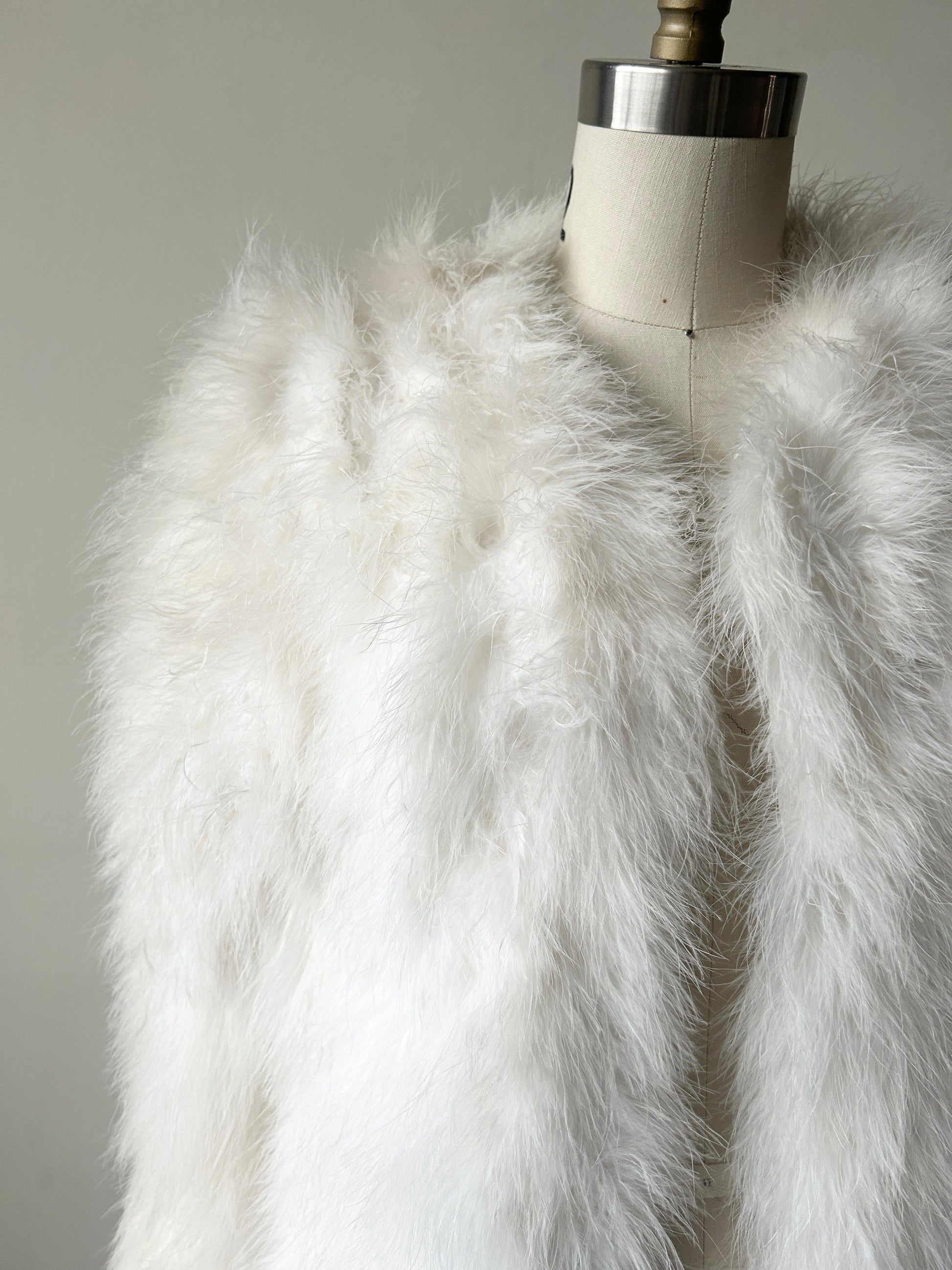 1960s white marabou feather coat. embroidered name on inside lining. lined, hook closures down center.
