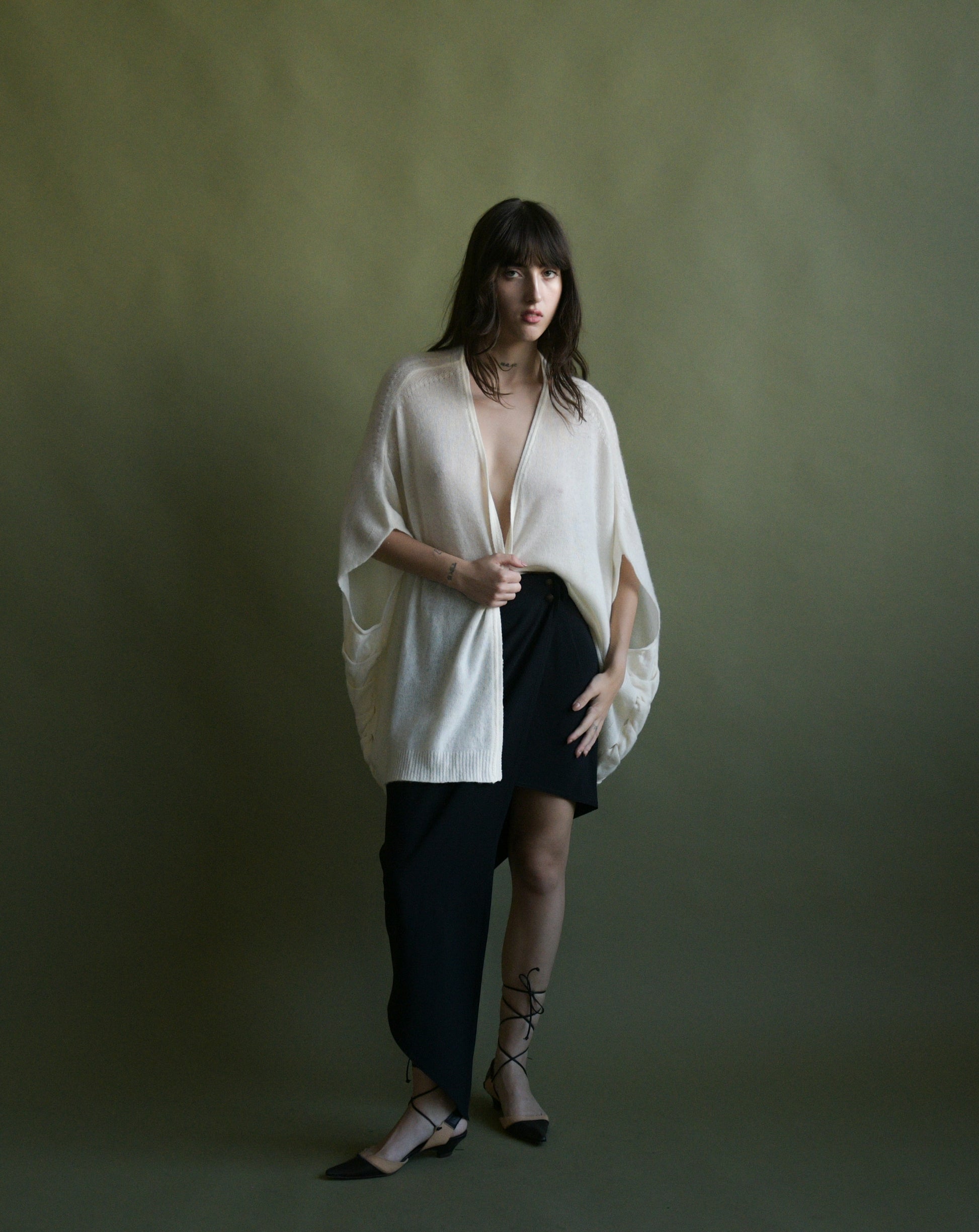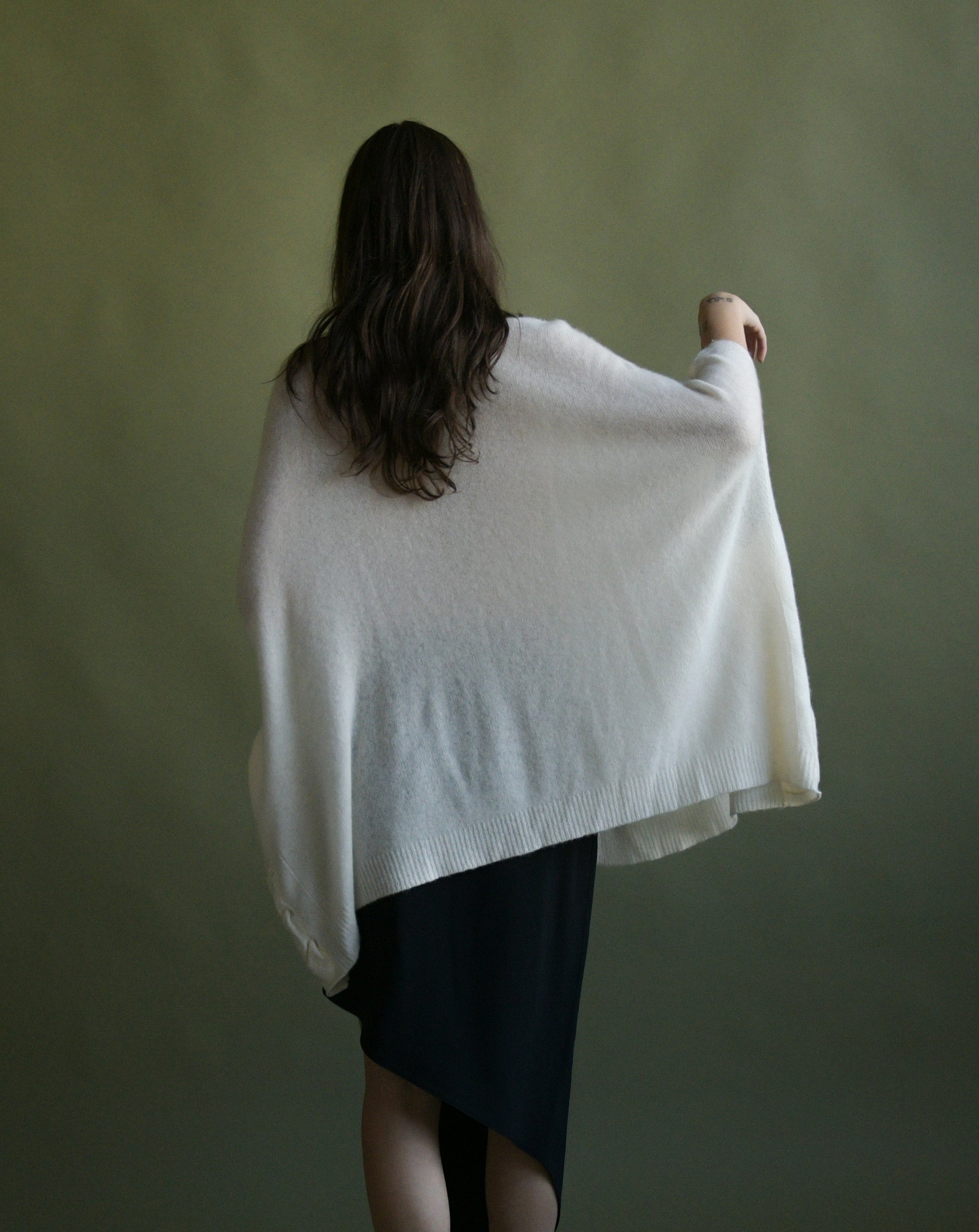 yves saint laurent white cashmere cardigan. wide, open fit. incredibly soft. braided detail at sides. no closures. perfect easy to wear, go-with-everything piece.