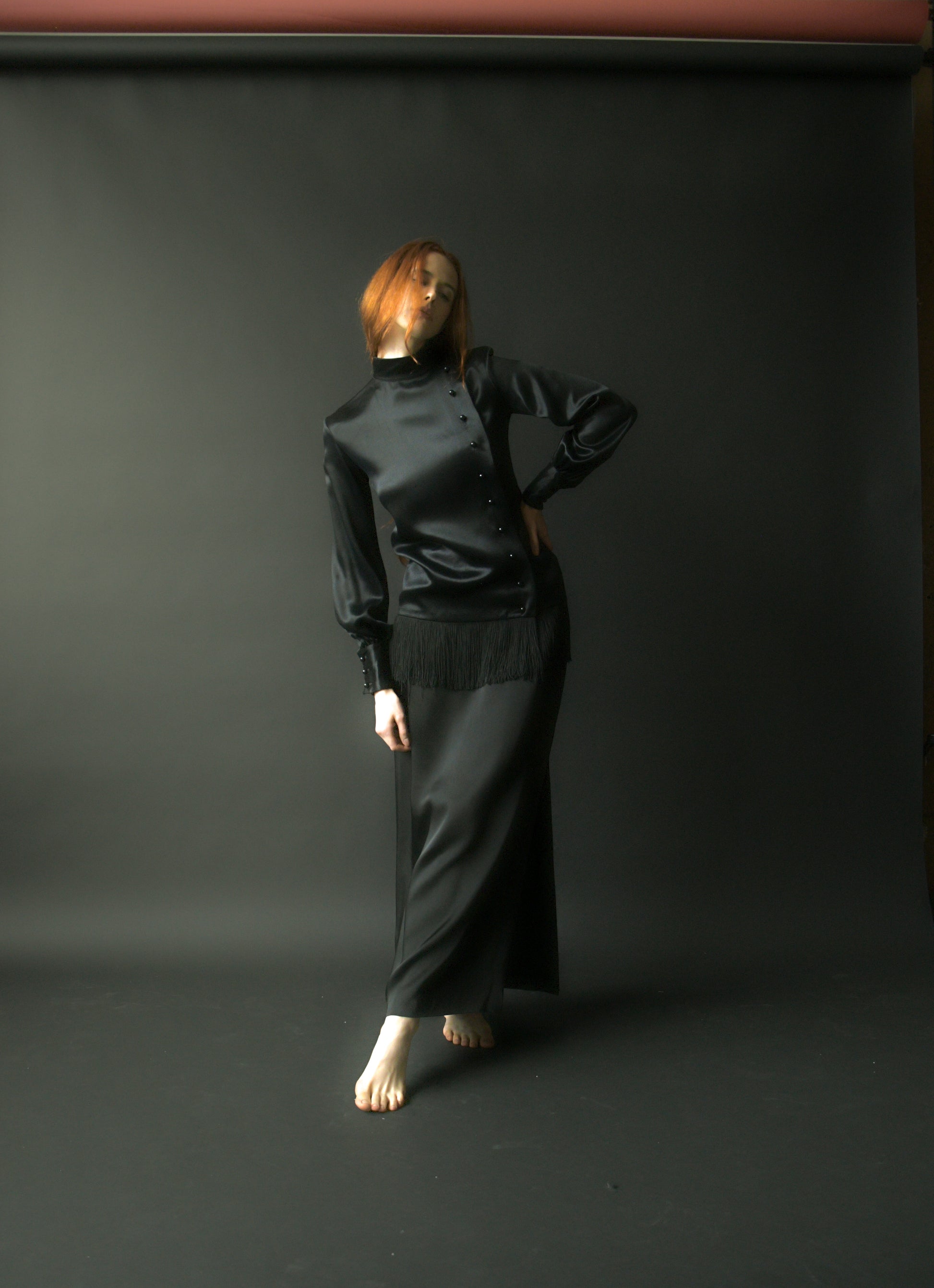 yves saint laurent automne hiver 1968 black satin tunic with fringe hem. this collection was a somber one, as saint laurent was mourning the vietnam war and created this all black collection in protest against it. (also shown is a sheer ostrich jumpsuit from the collection.) the show closed with a vietnamese bride in silver lamé holding an 18 inch high symbolic candle. the tunic features off-center button closures that reach up to the mock neck collar. there is a slightly full shape to the sleeve at the cuff. the tunic is unlined but slightly heavier in weight.